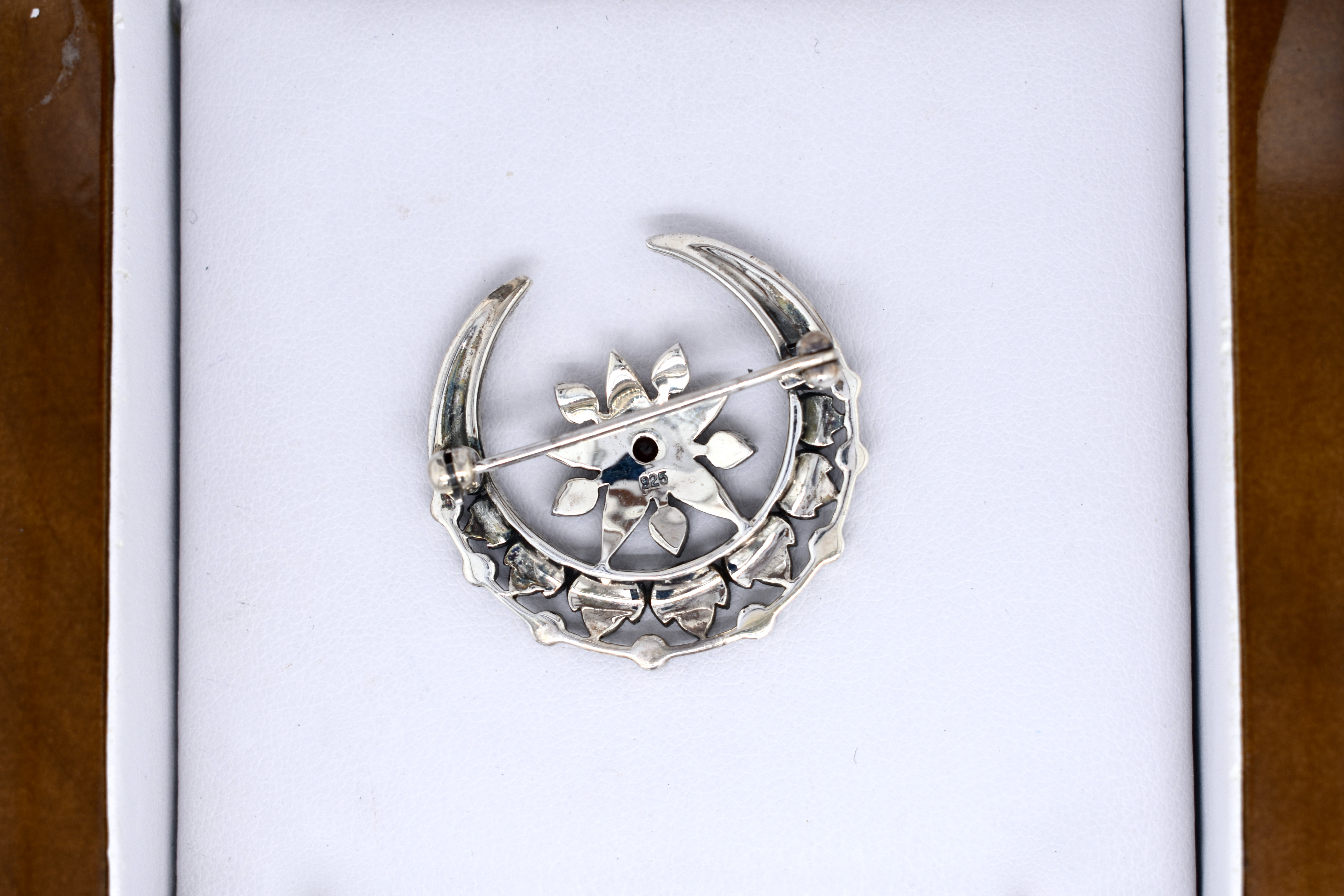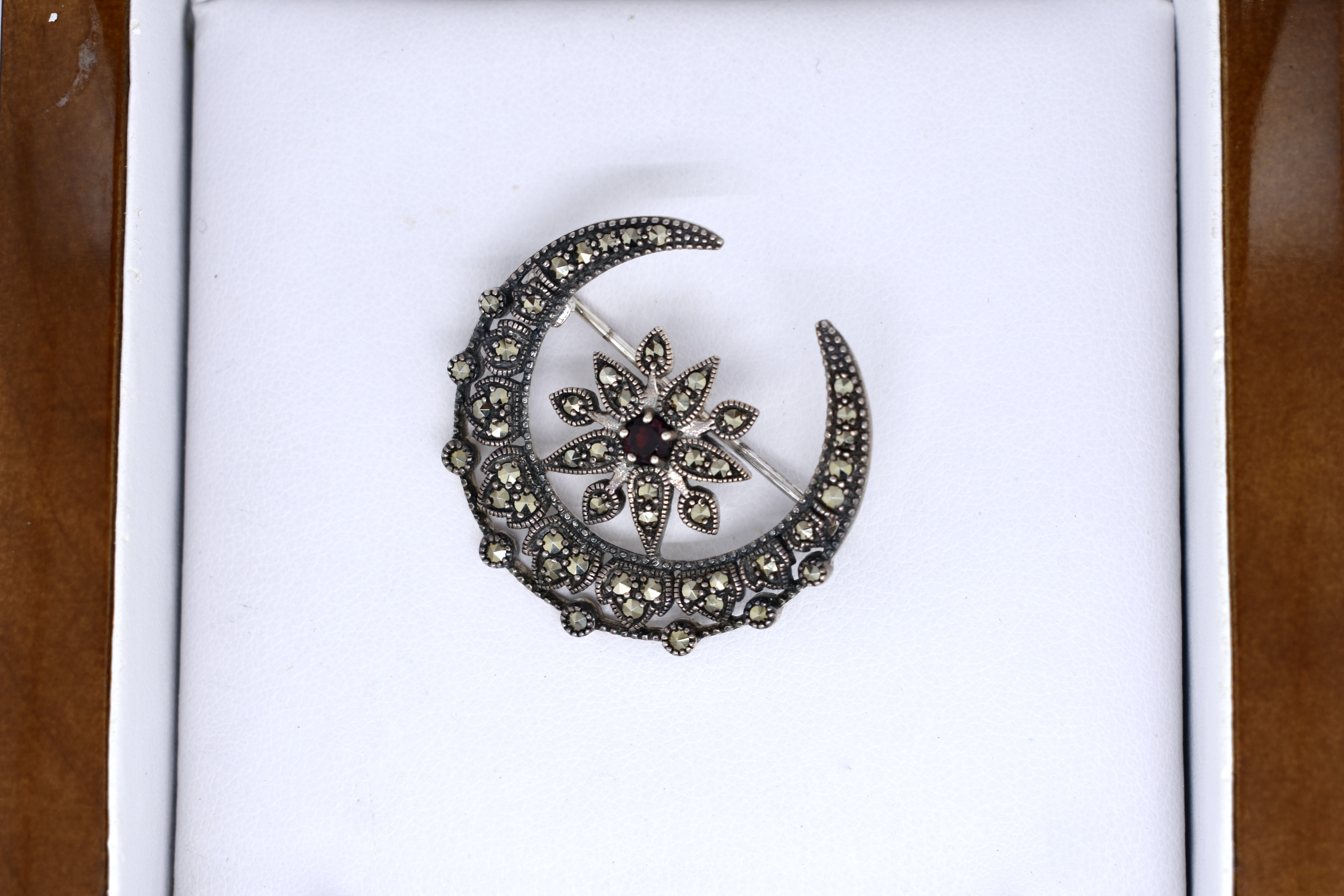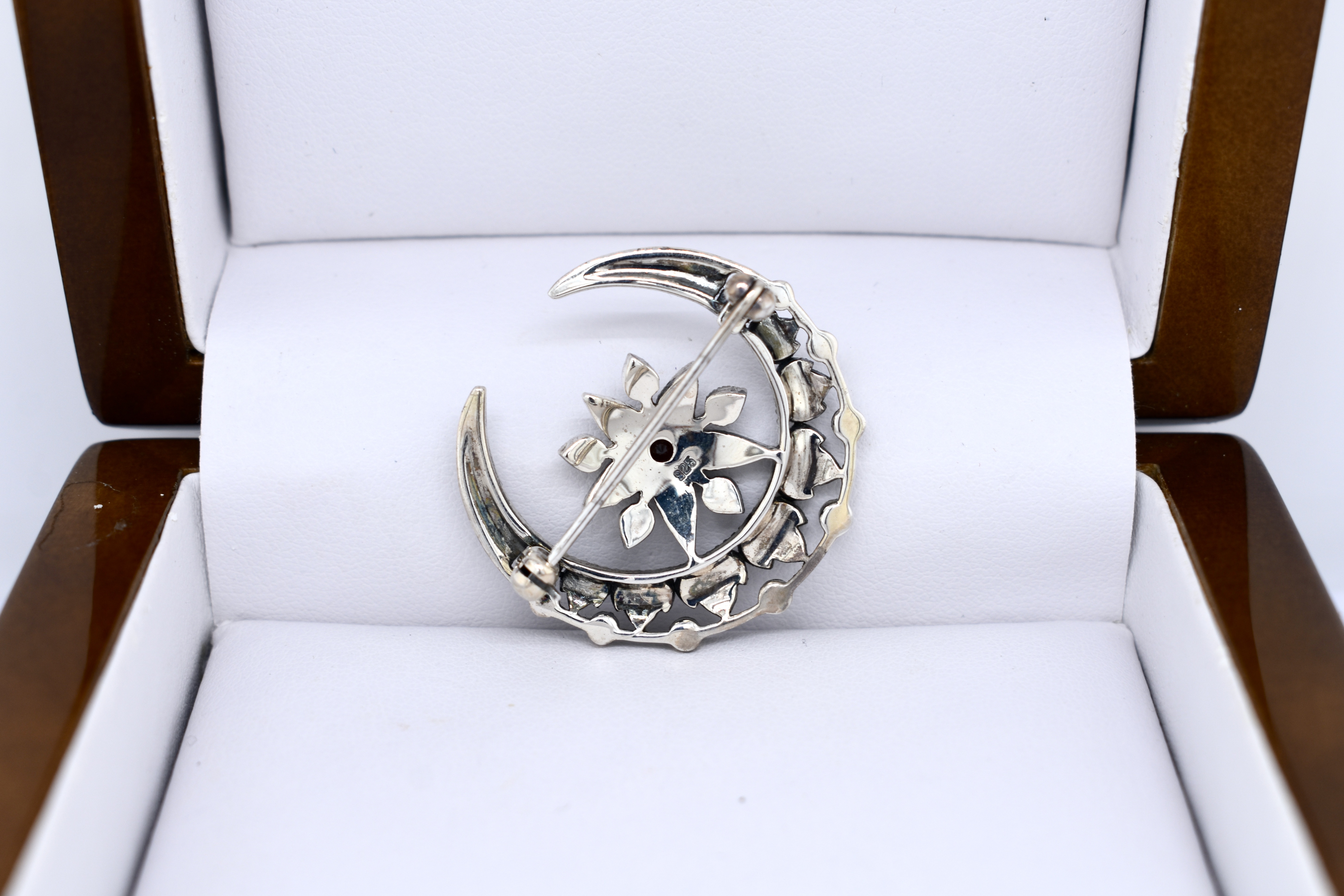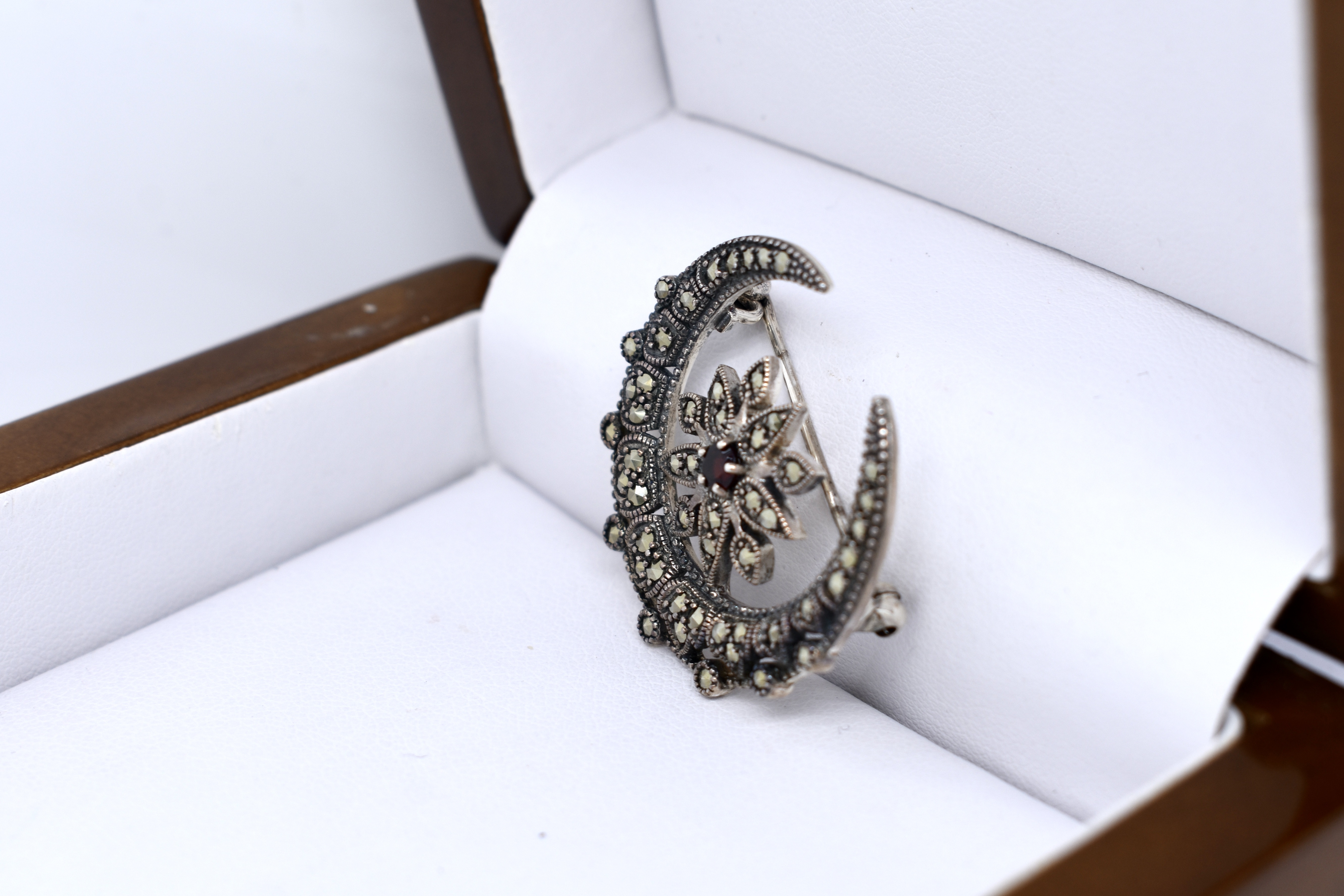 This pretty sterling silver brooch depicts a crescent moon with a flower in the centre. Made with marcasites, the flower features a red garnet claw set in the centre.