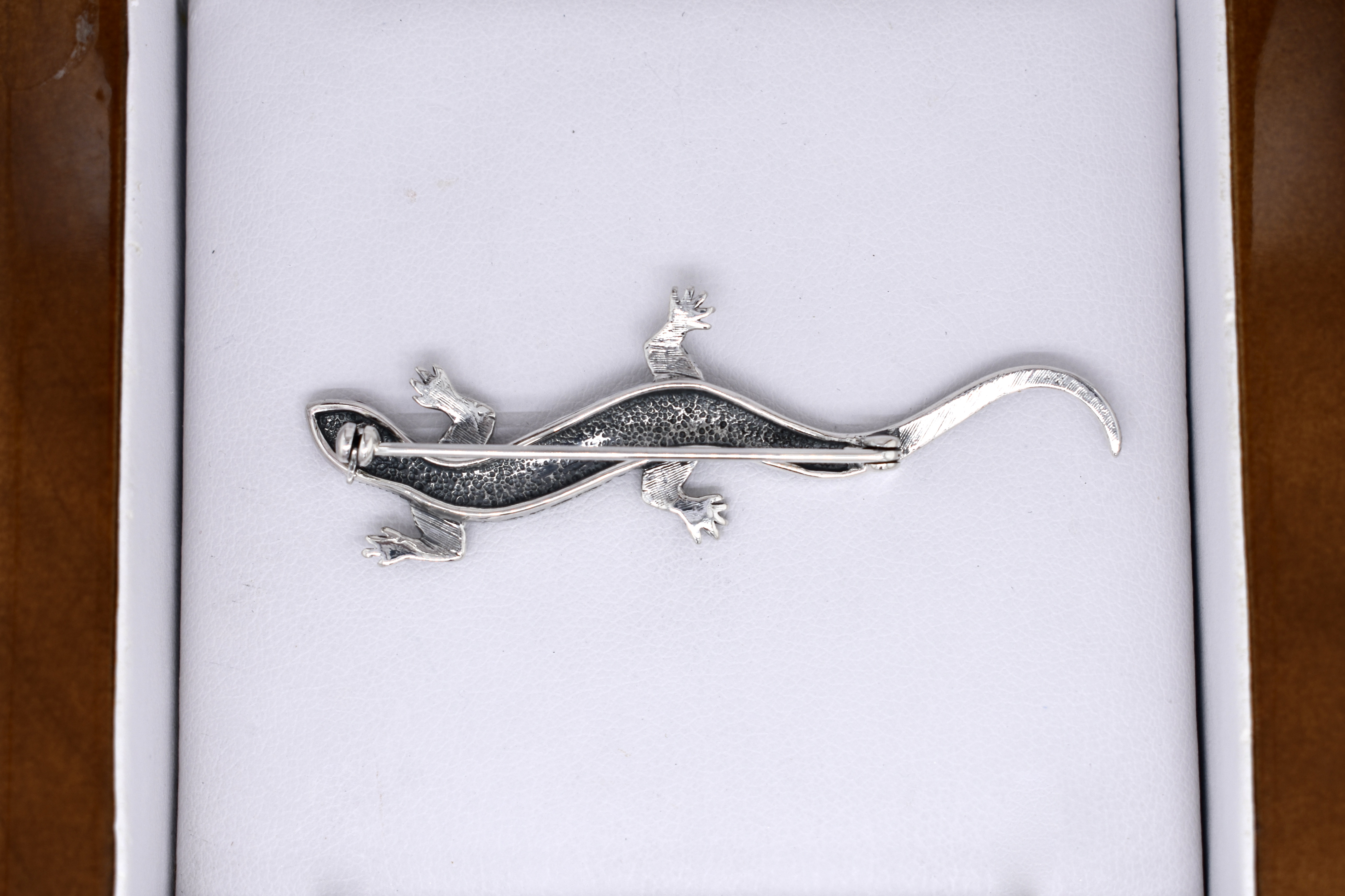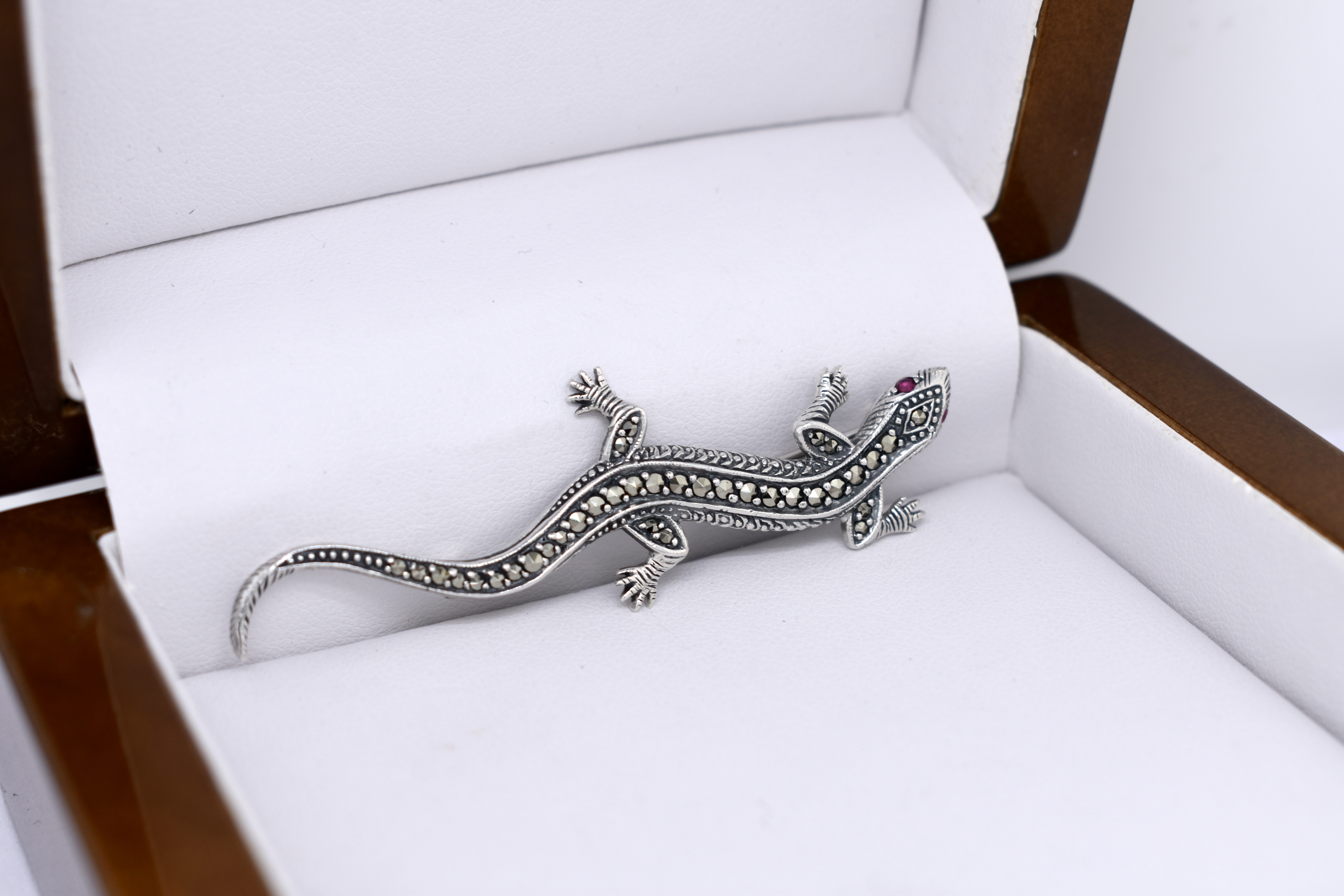 Crafted in sterling silver this awesome lizard brooch is encrusted with marcasites and has red ruby eyes.