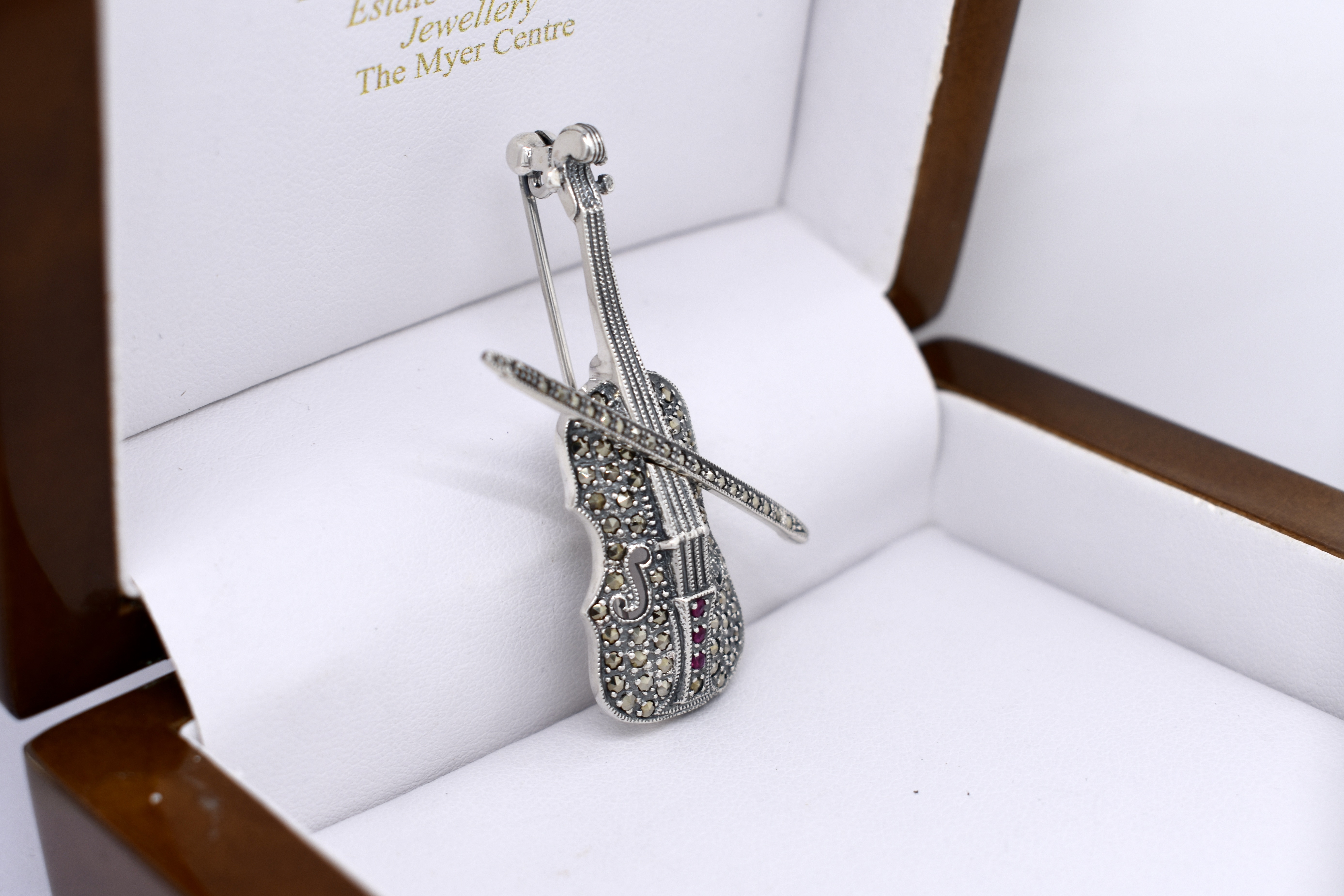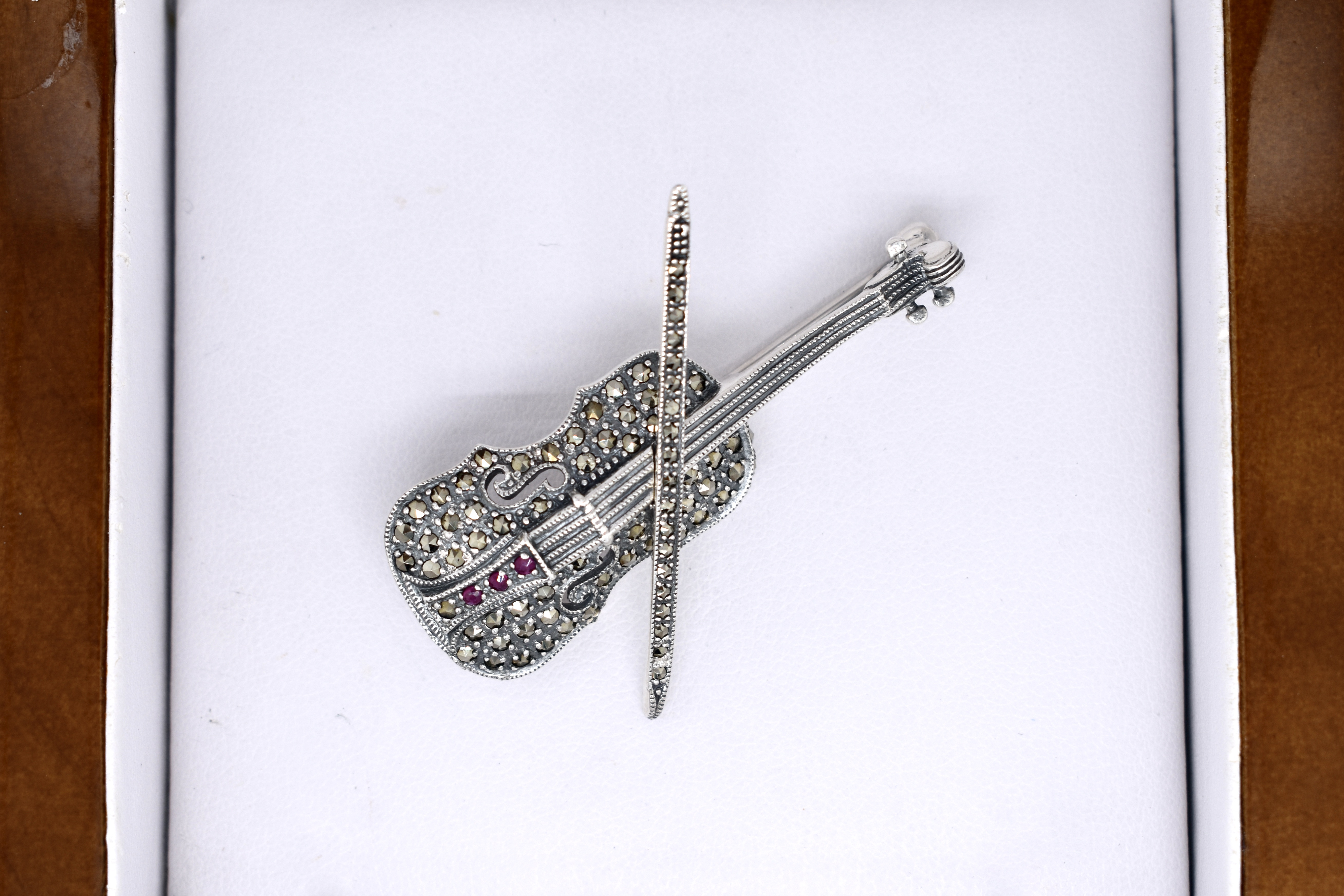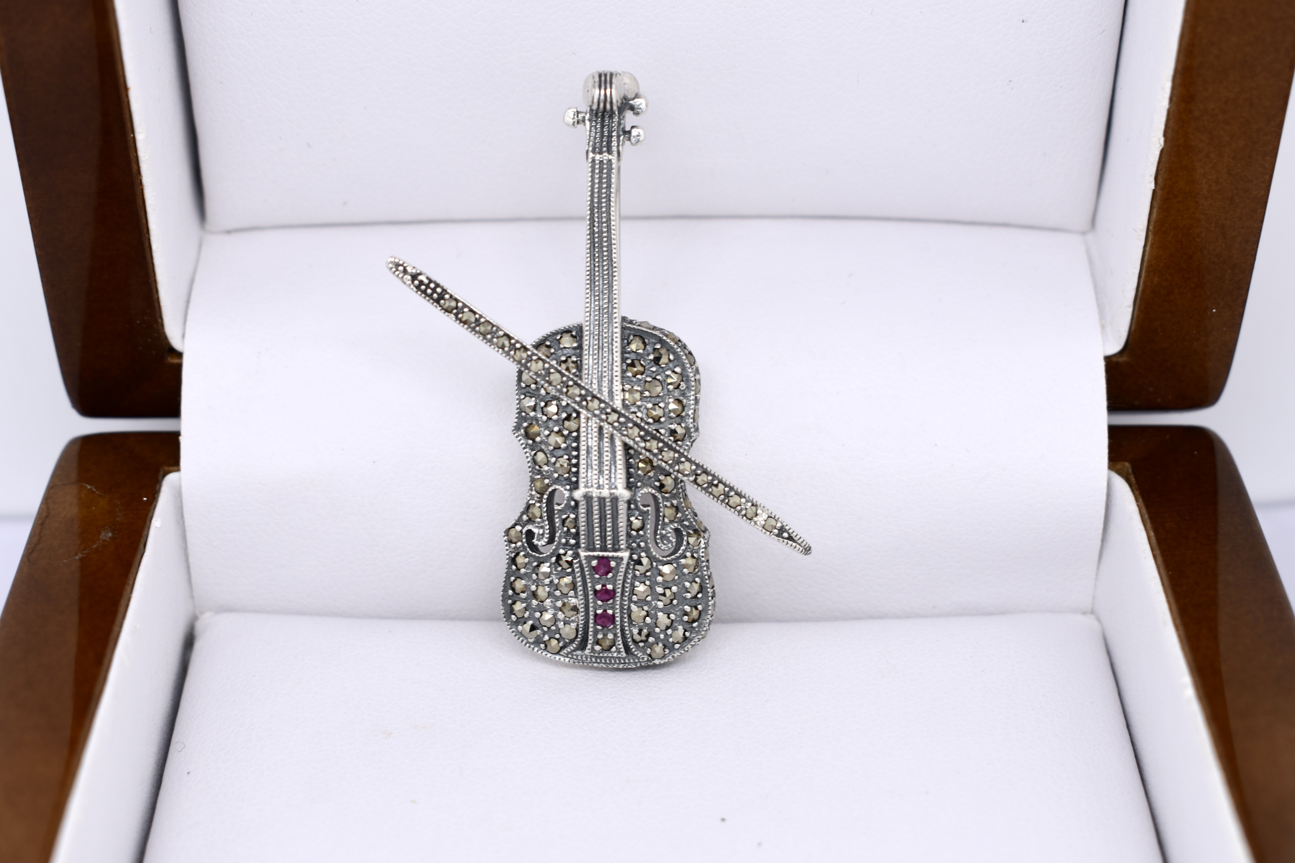 This amazing sterling silver violin brooch is made of marcasites, with three red rubies in a line under the strings.
