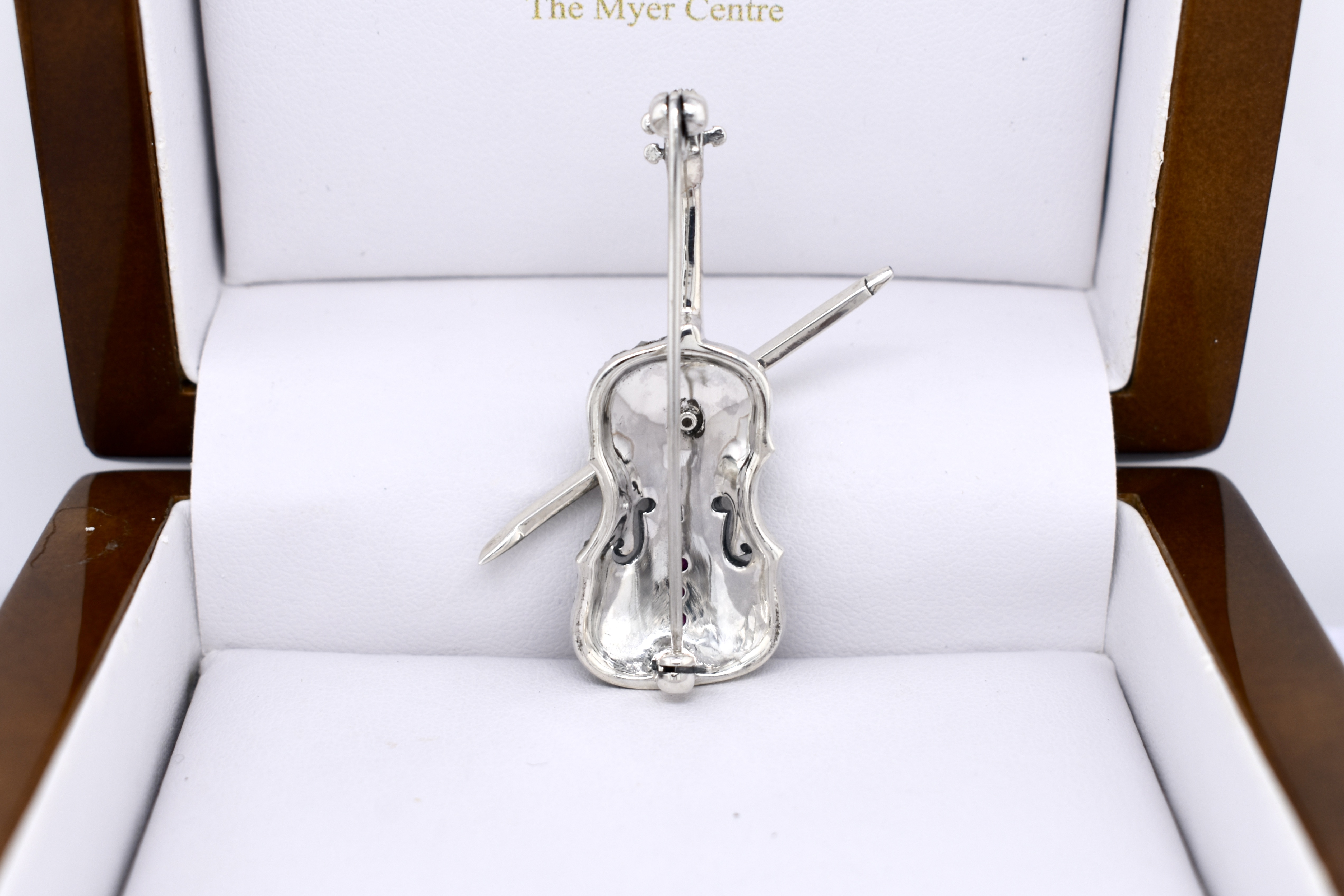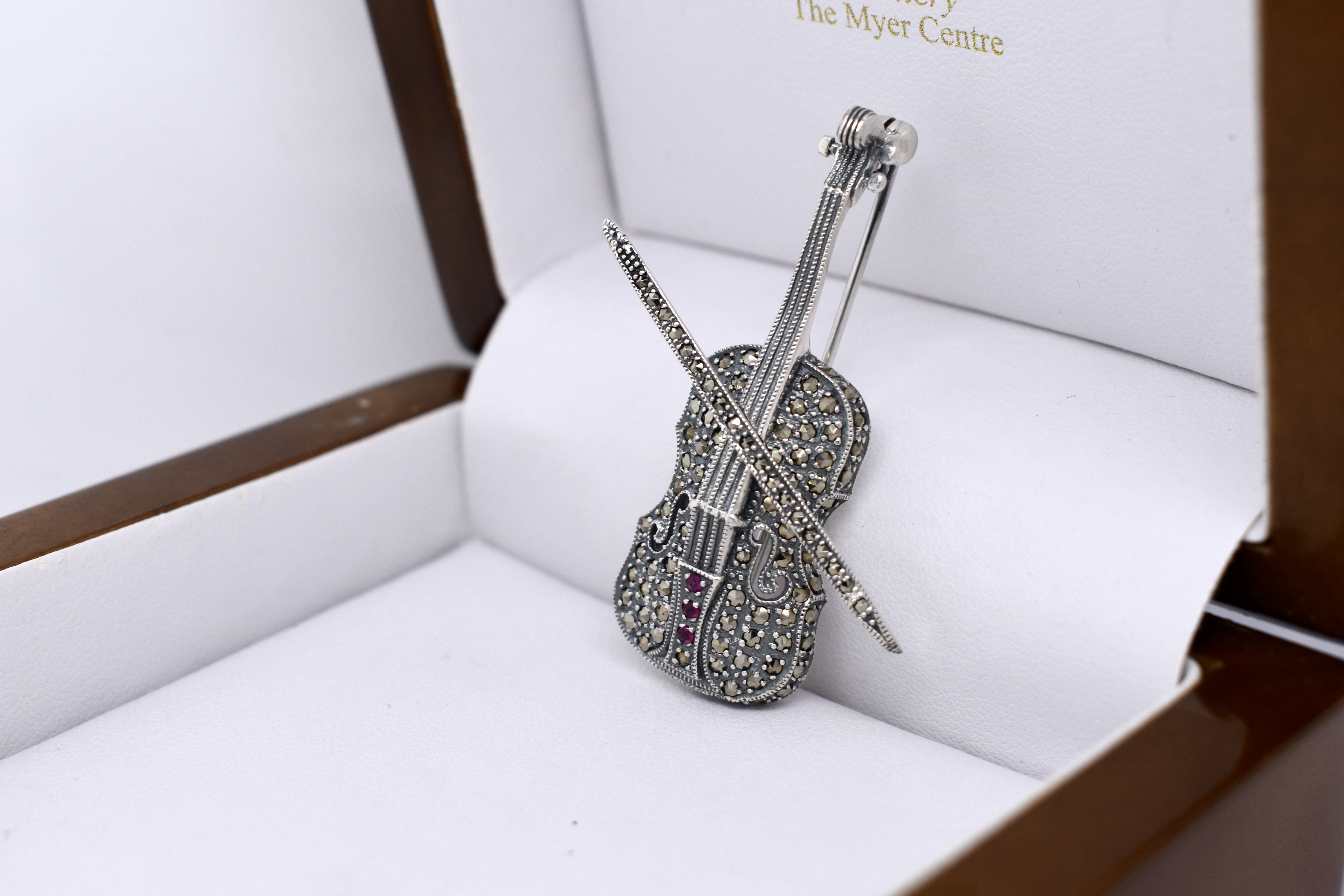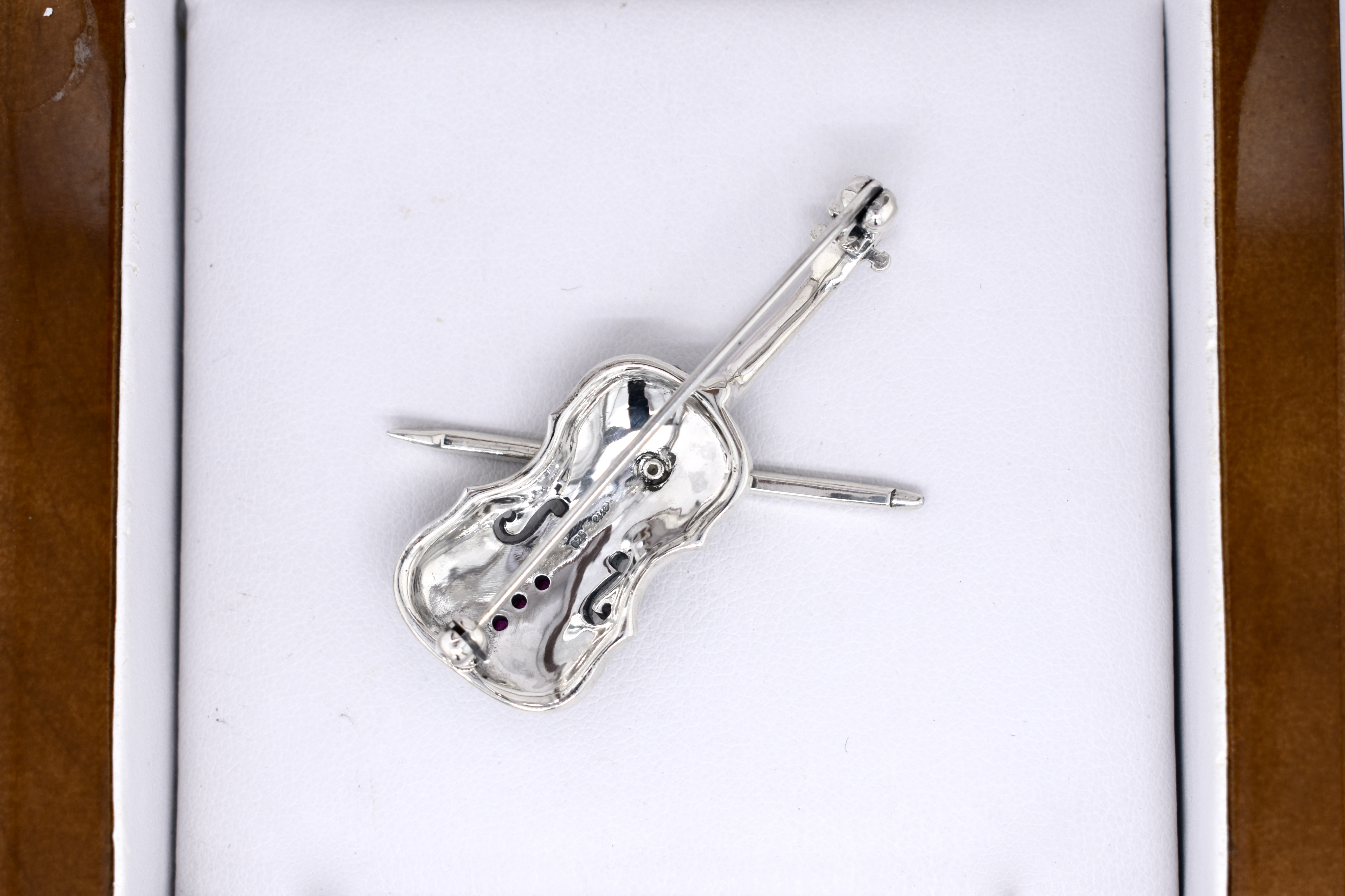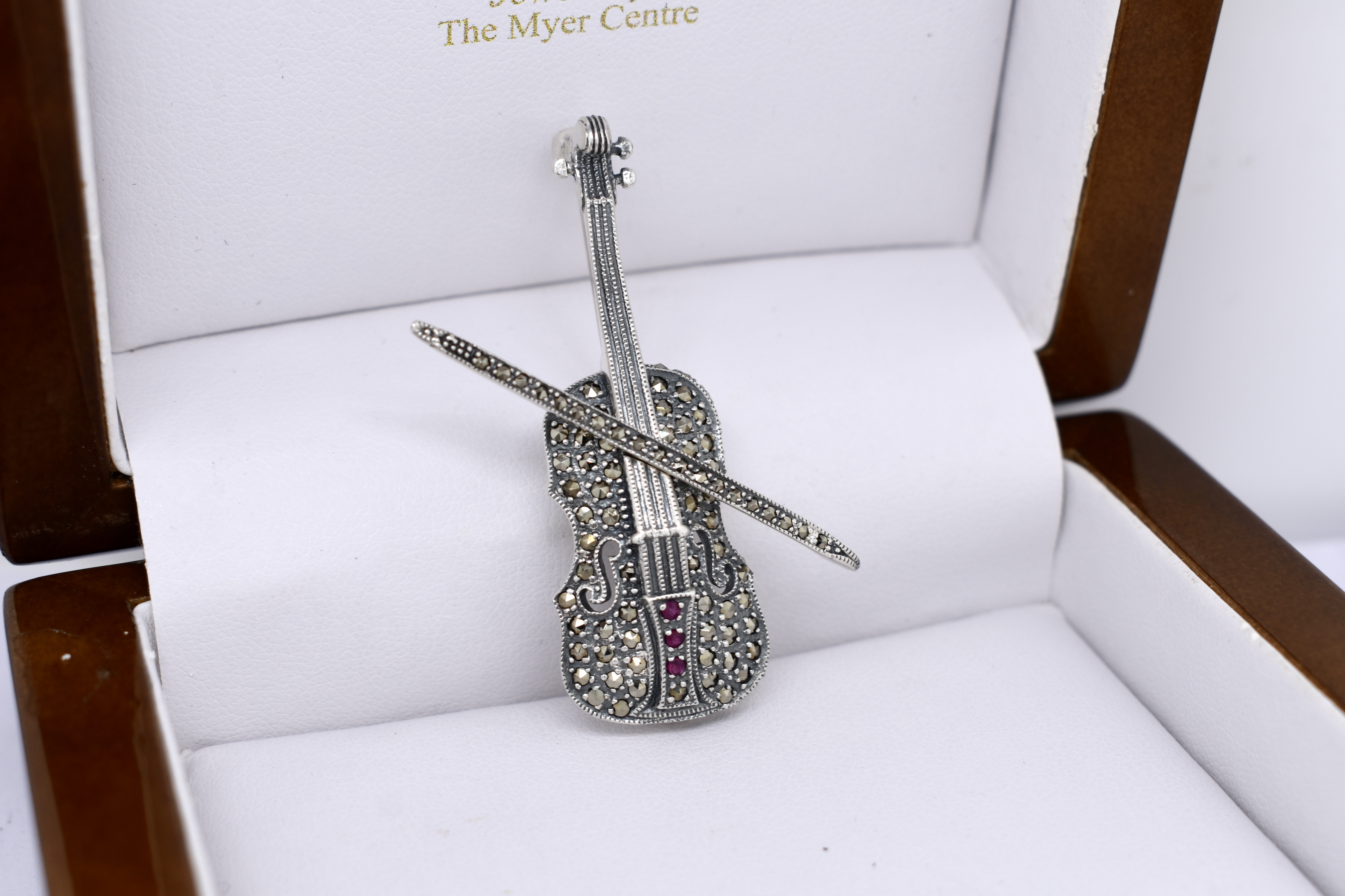 This amazing sterling silver violin brooch is made of marcasites, with three red rubies in a line under the strings.