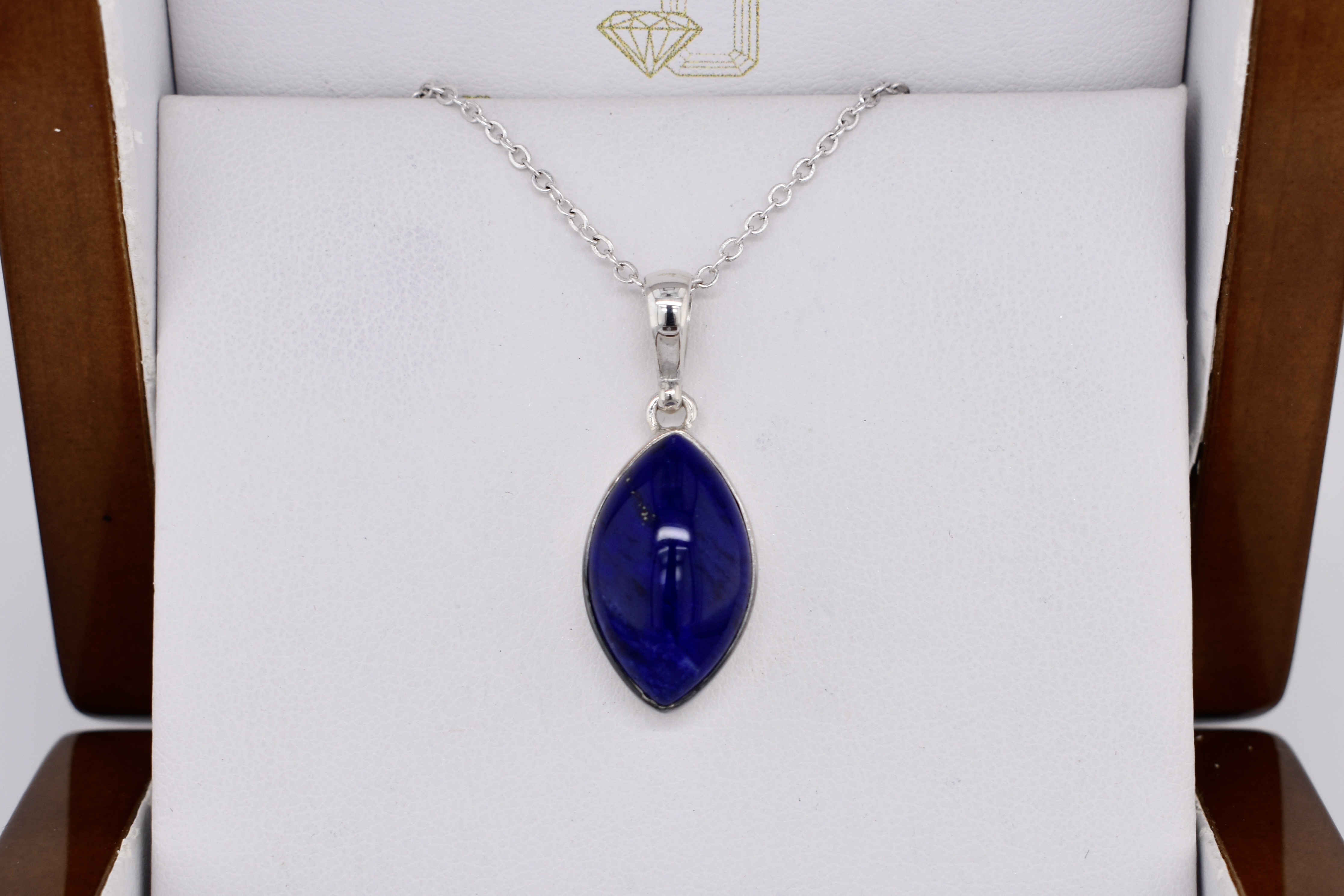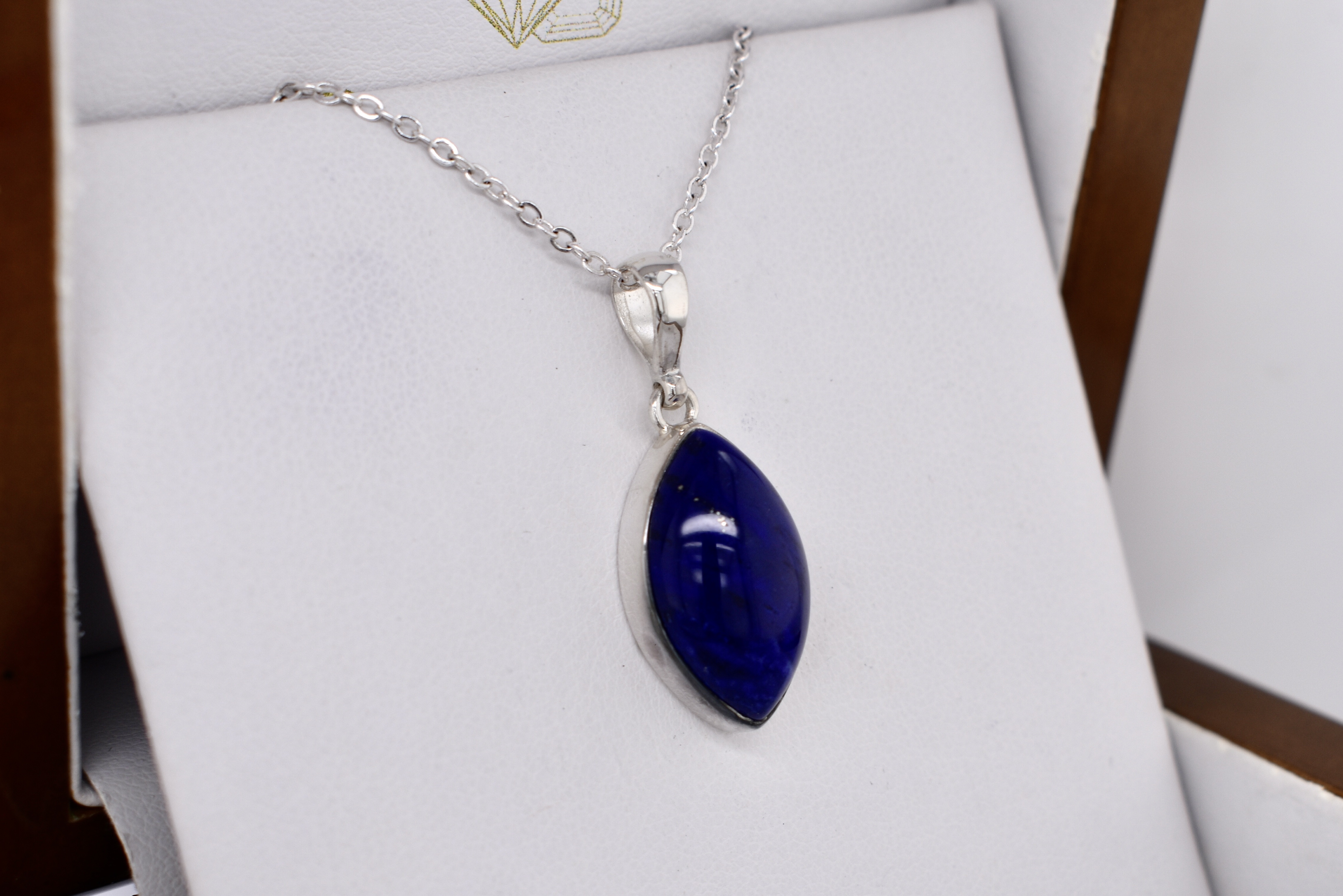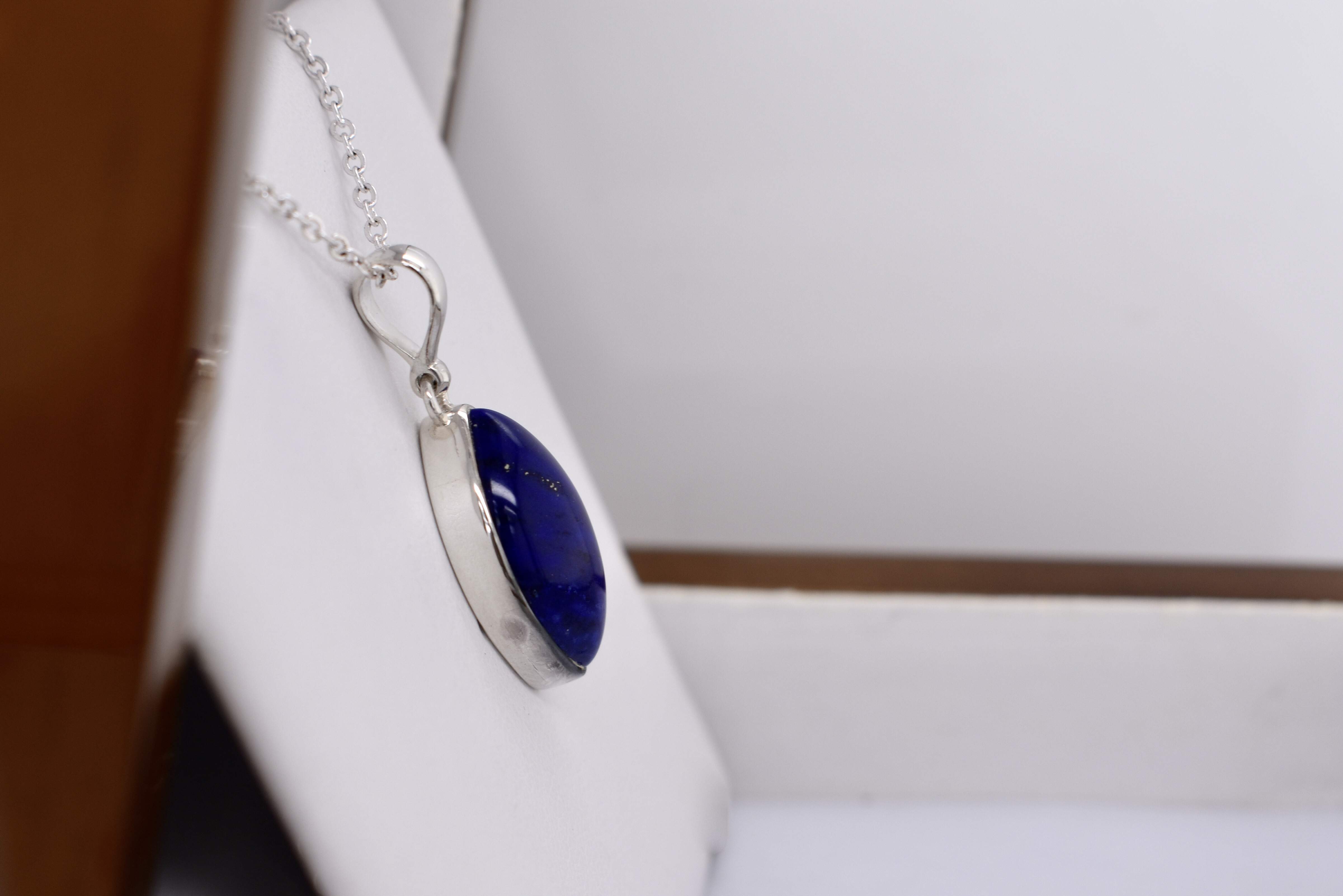 A stunning marquise shaped lapis lazuli pendant, bezel set, in sterling silver. This handmade pendant measures 20.0x11.8mm and is completed with a plain silver bale. Complete the set with the matching ring: 20372309. Chains are available for separate purchase.