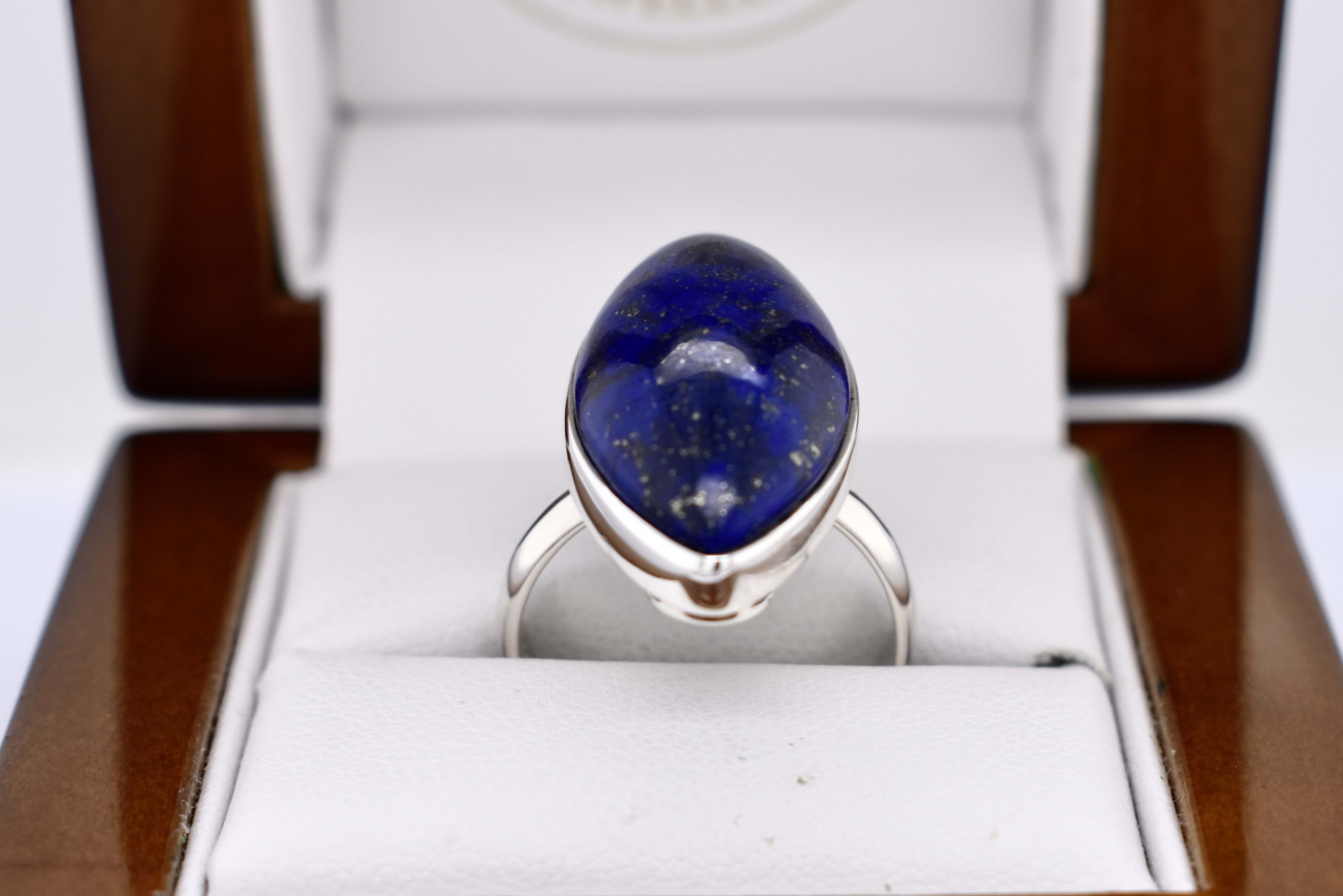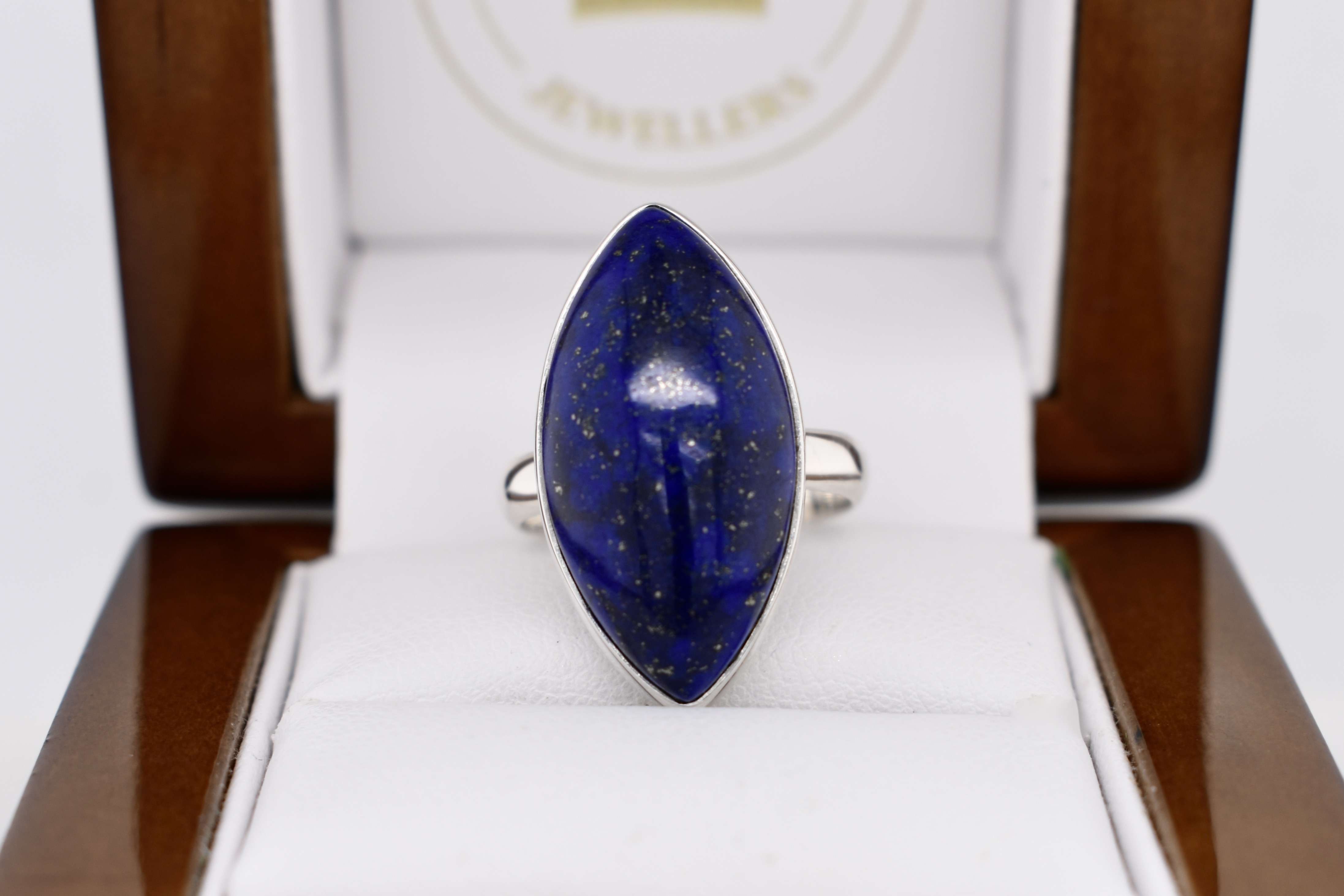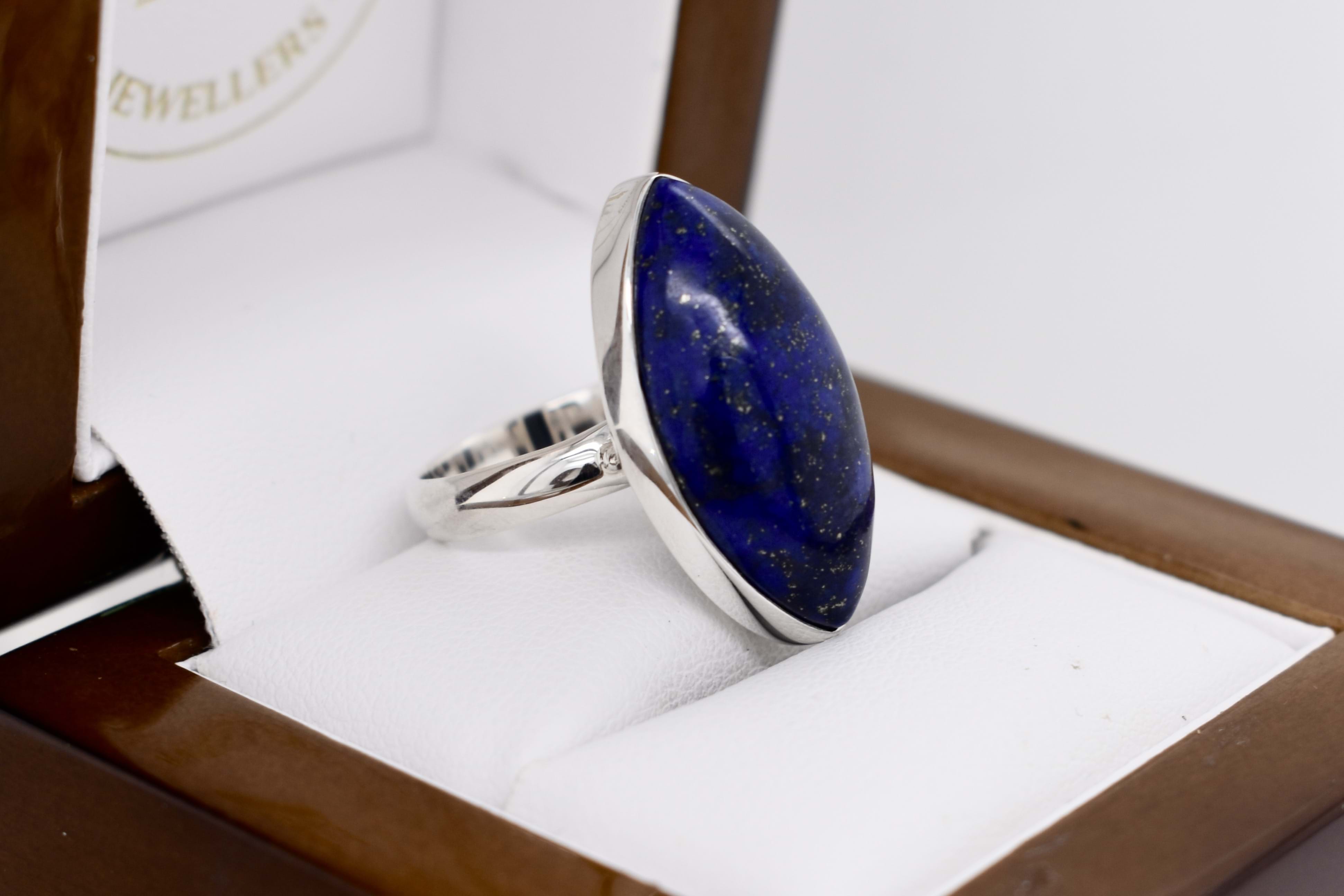 This magnificent marquise shaped lapis lazuli hand crafted ring, bezel set in sterling silver. This ring measures 24.1x12.3mm and is completed with a plain silver band. Finger size N. Complete the set with the matching pendant: 20372293