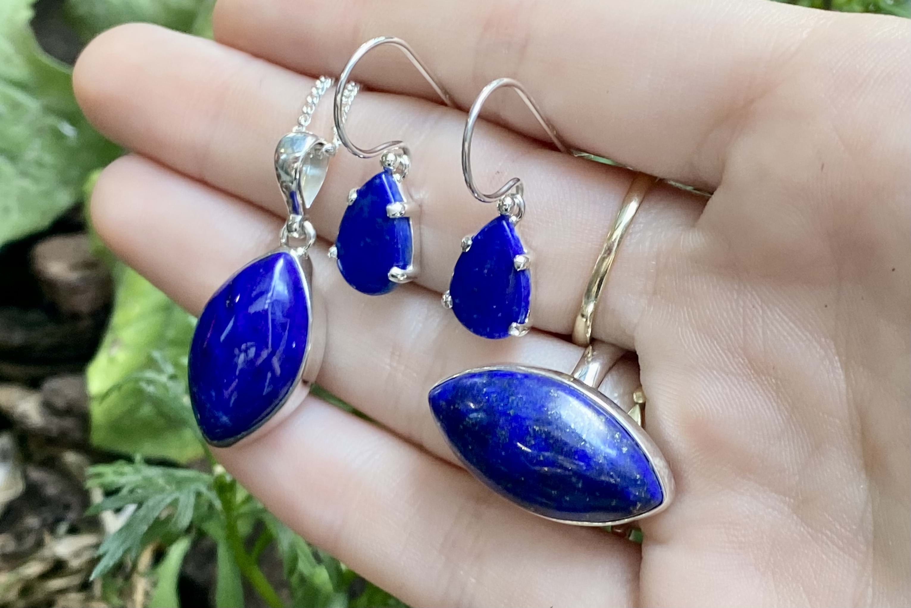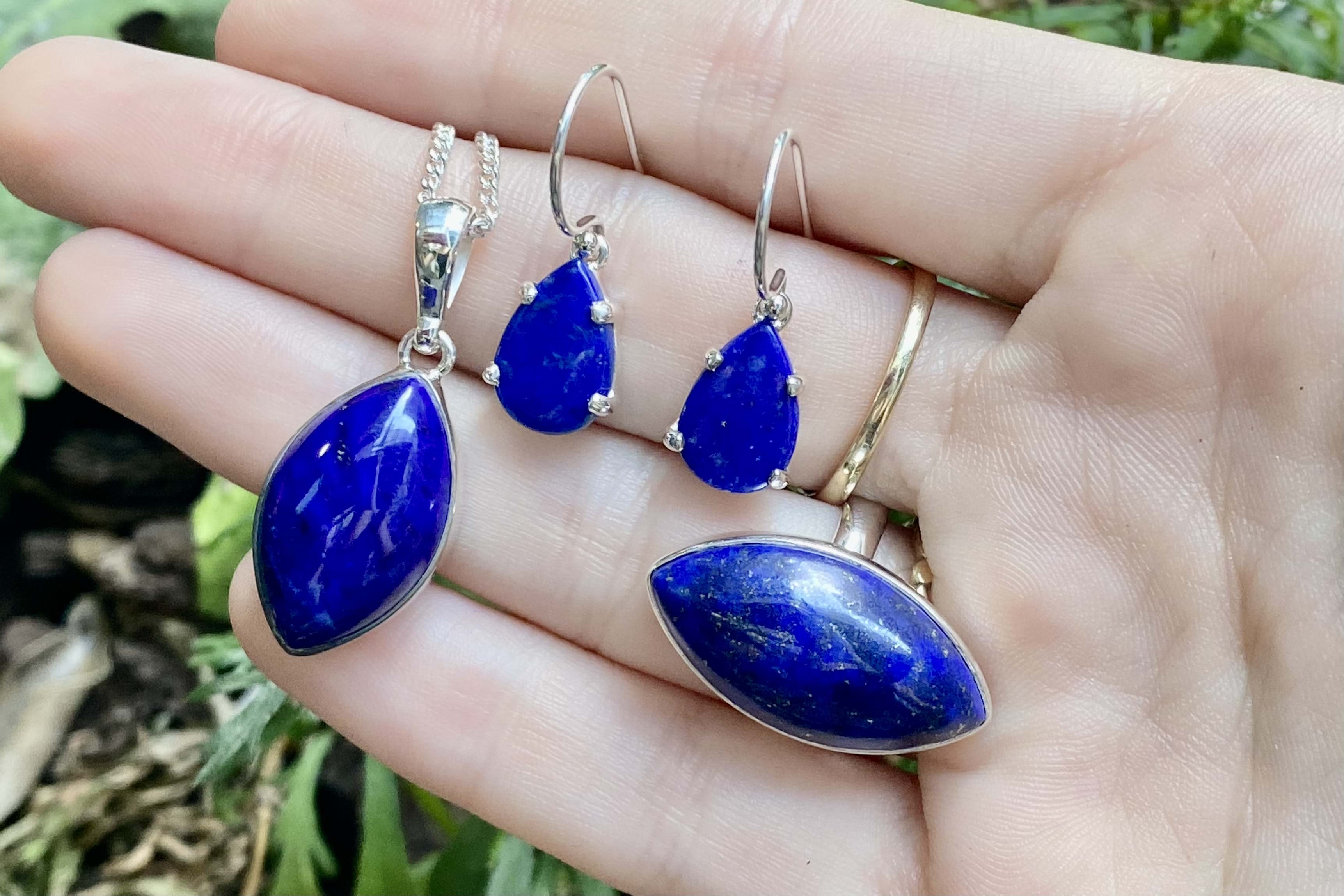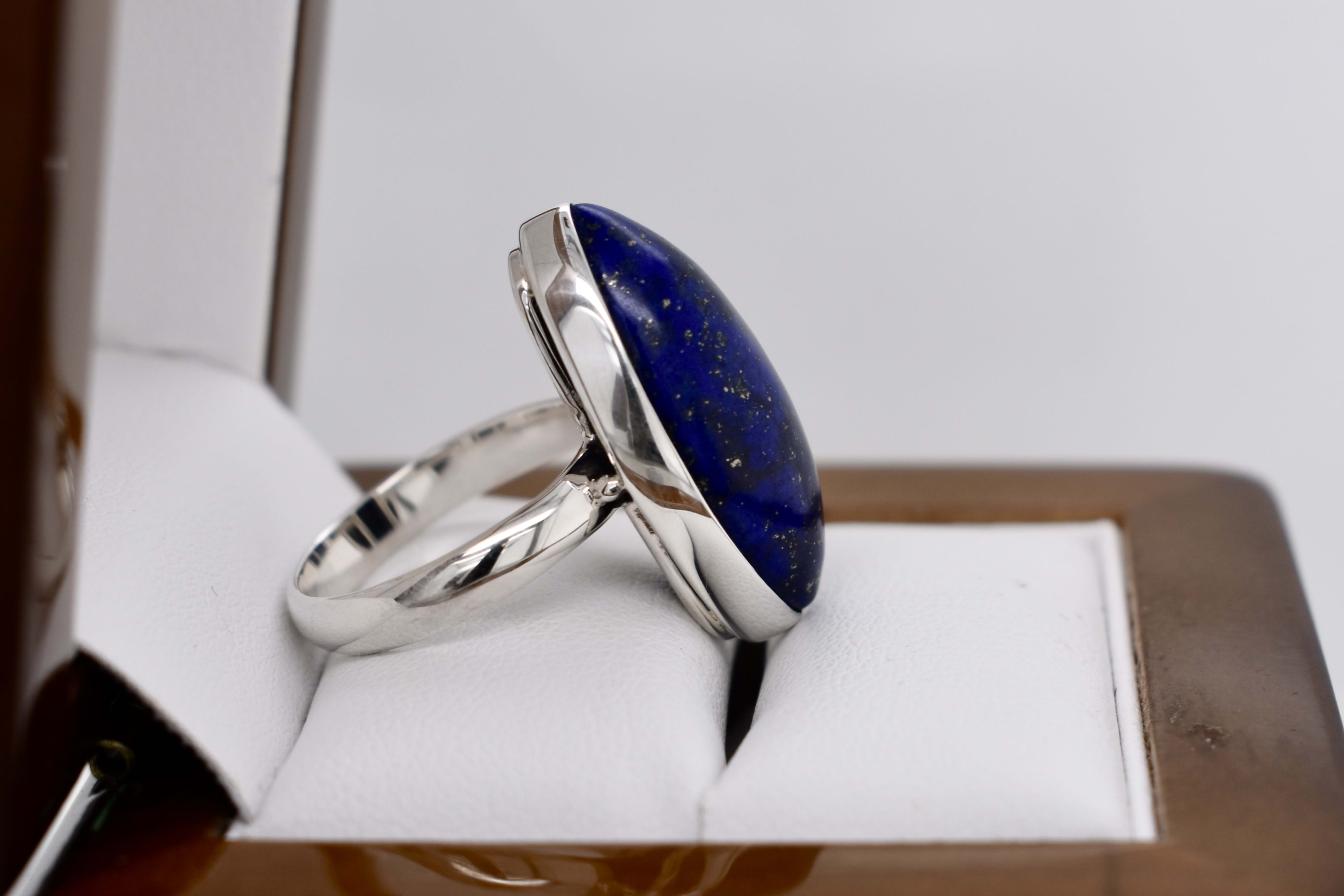 This magnificent marquise shaped lapis lazuli hand crafted ring, bezel set in sterling silver. This ring measures 24.1x12.3mm and is completed with a plain silver band. Finger size N. Complete the set with the matching pendant: 20372293