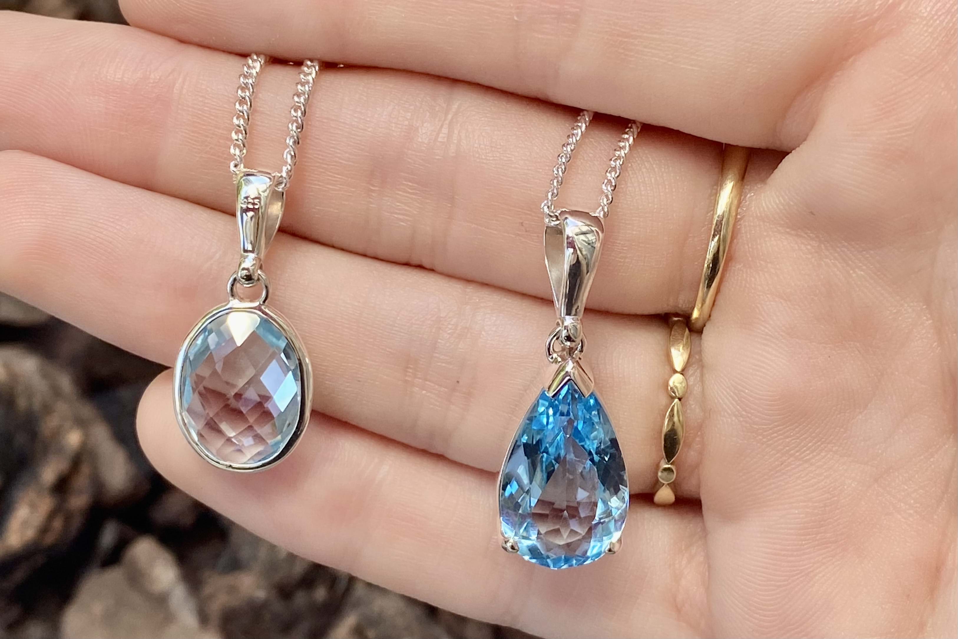Timeless handmade sterling silver bezel set pendant, featuring an oval 13.3x9.6mm sky blue topaz with a checkerboard finish and a plain pendant bale. Chains are available for separate purchase.