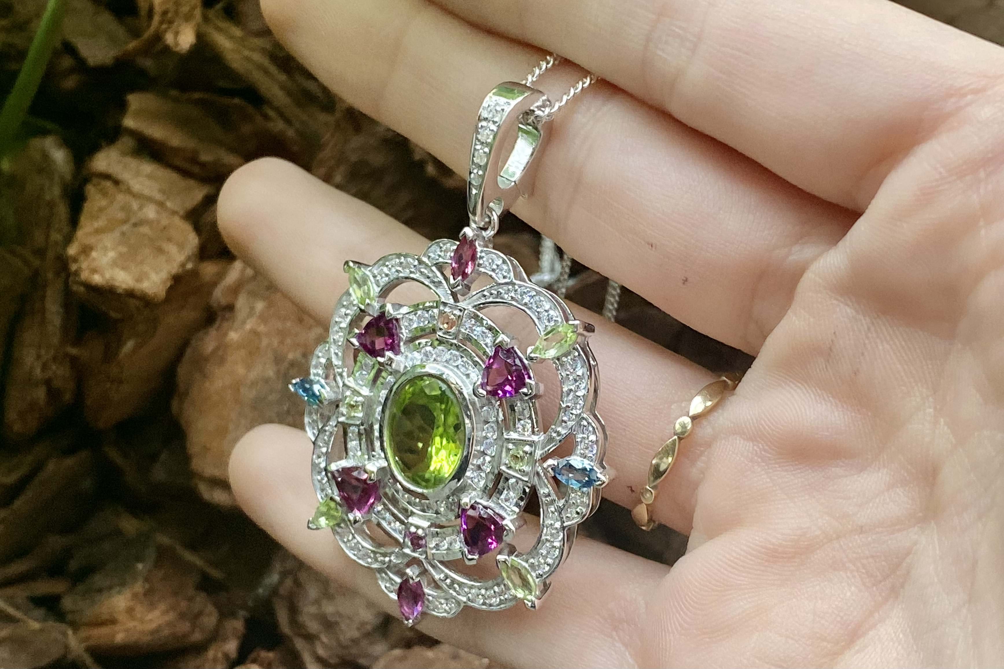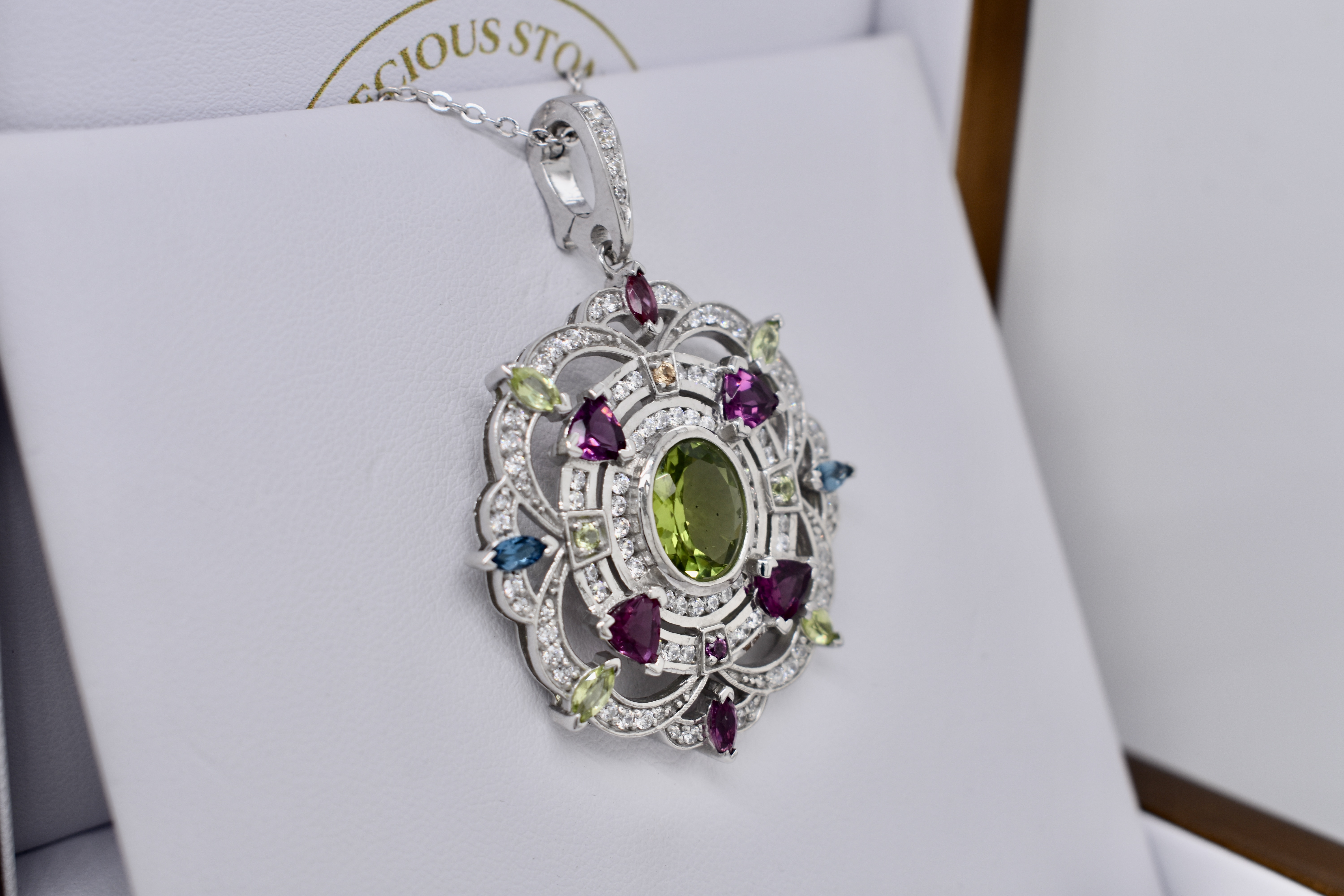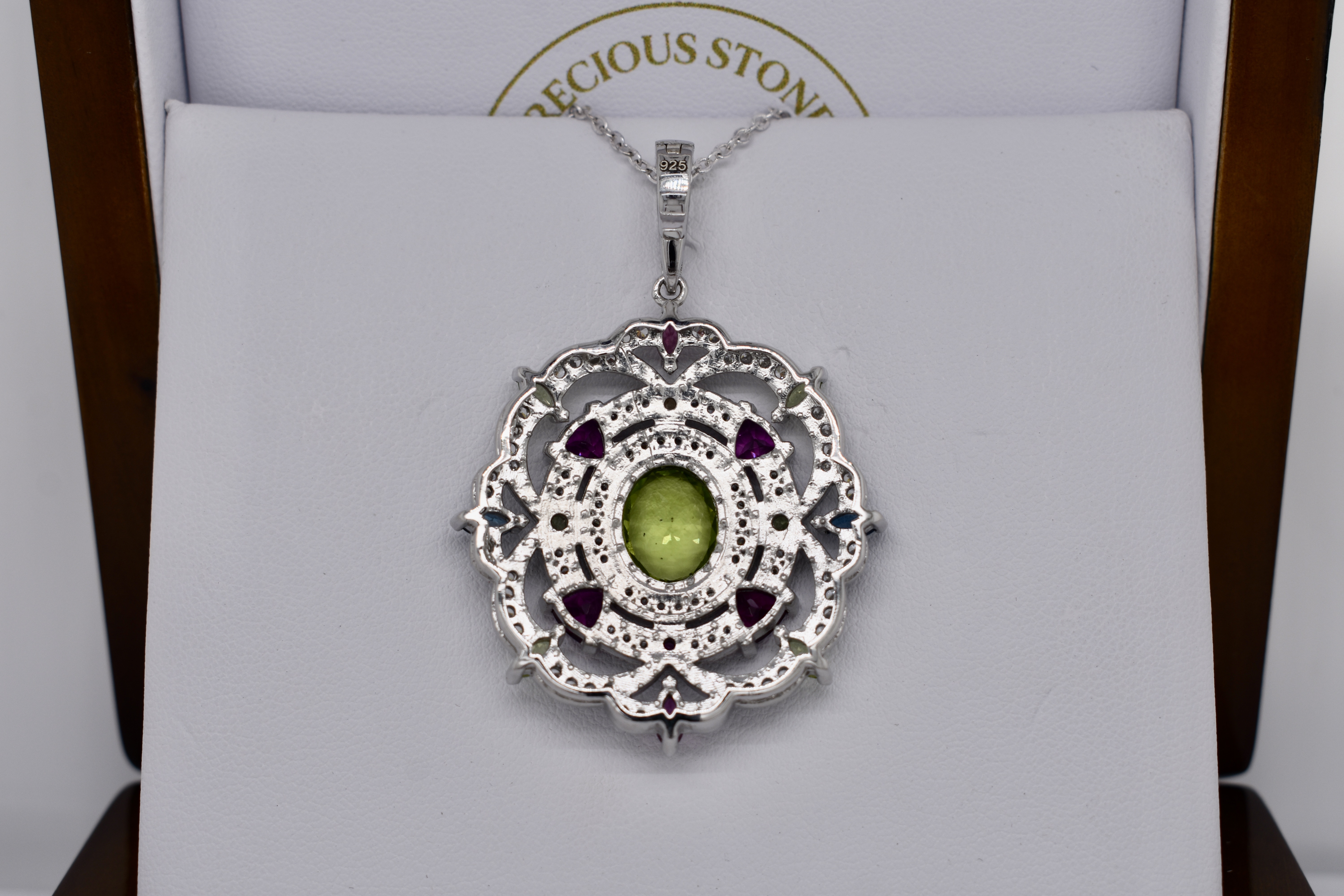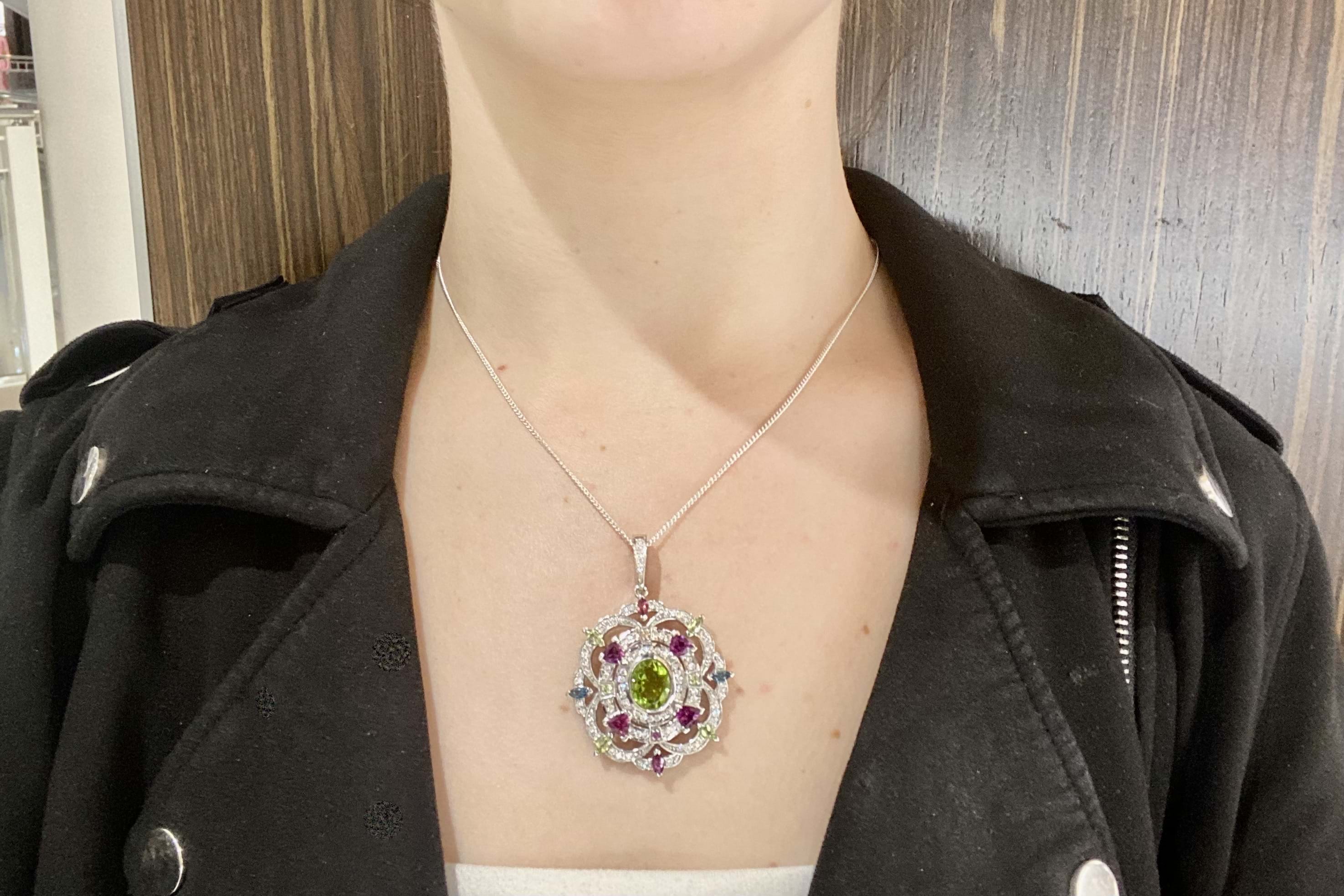 Colourful sterling silver enhancer, featuring an oval peridot in the centre, surrounded by multi coloured gemstones including topaz, rhodolite garnet and cubic zirconias. In a fancy scroll loop design, with more CZs studding the enhancer clip bale. Total measurement approx. 53x38mm. Chains available for separate purchase.