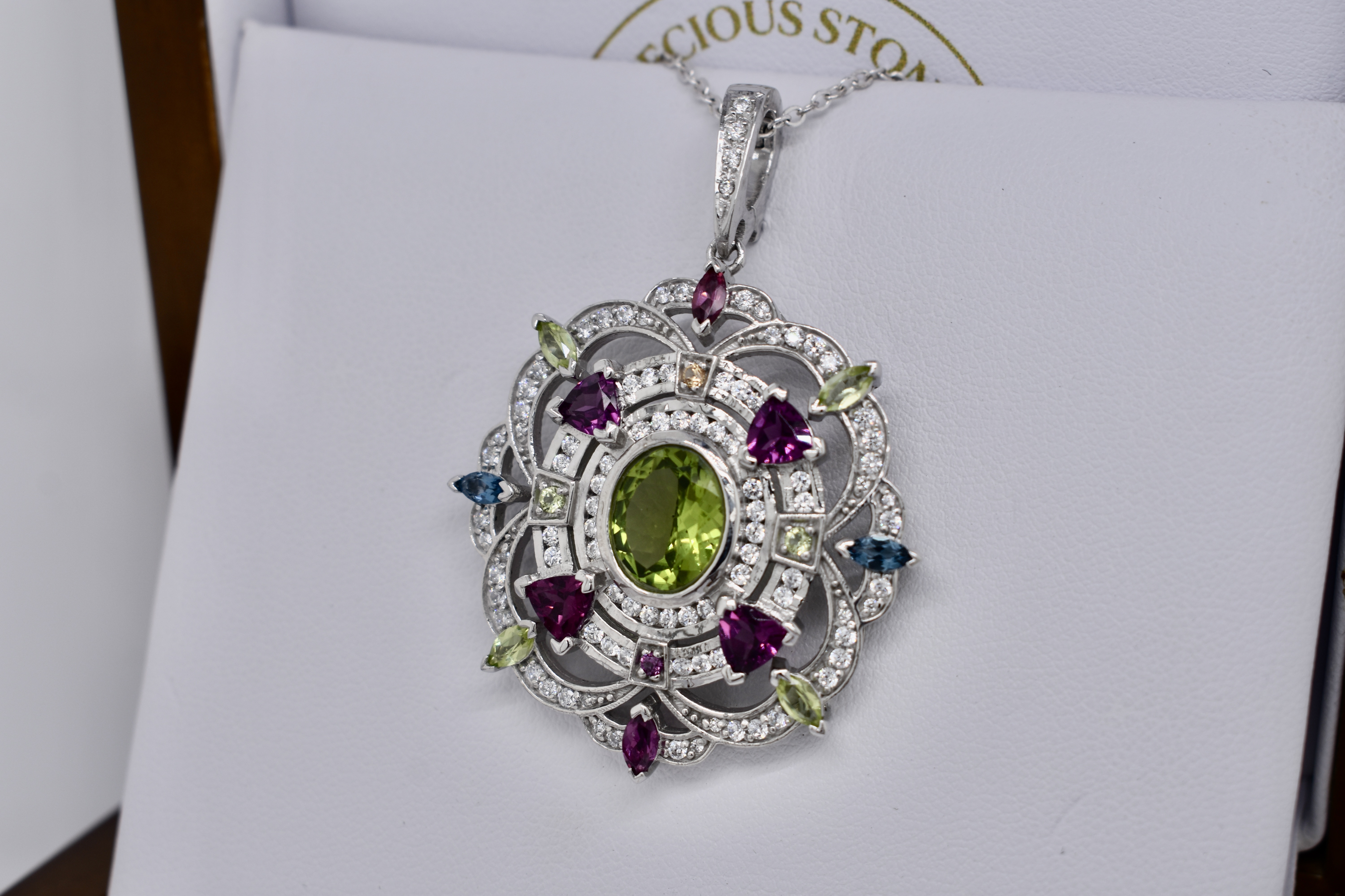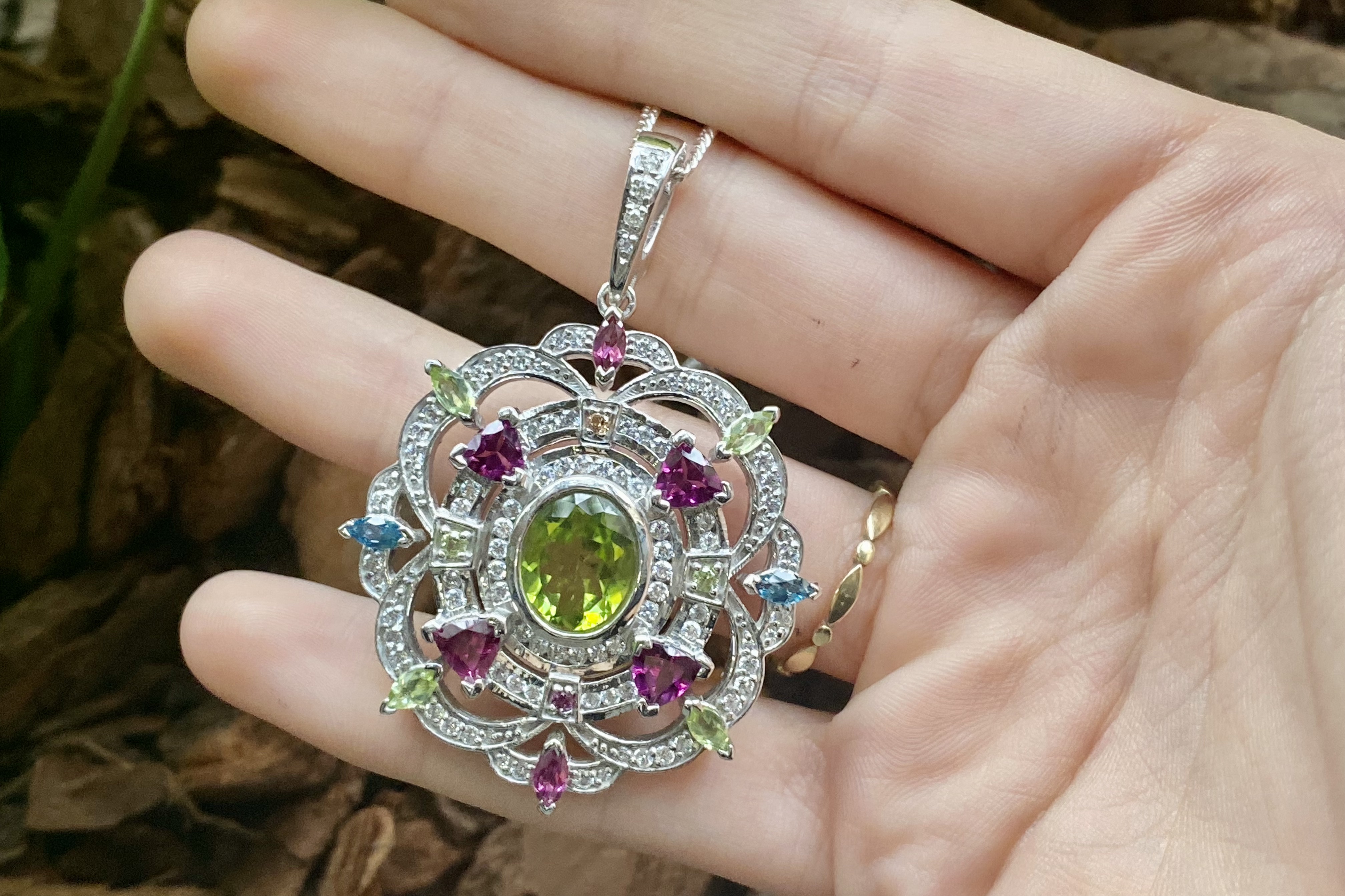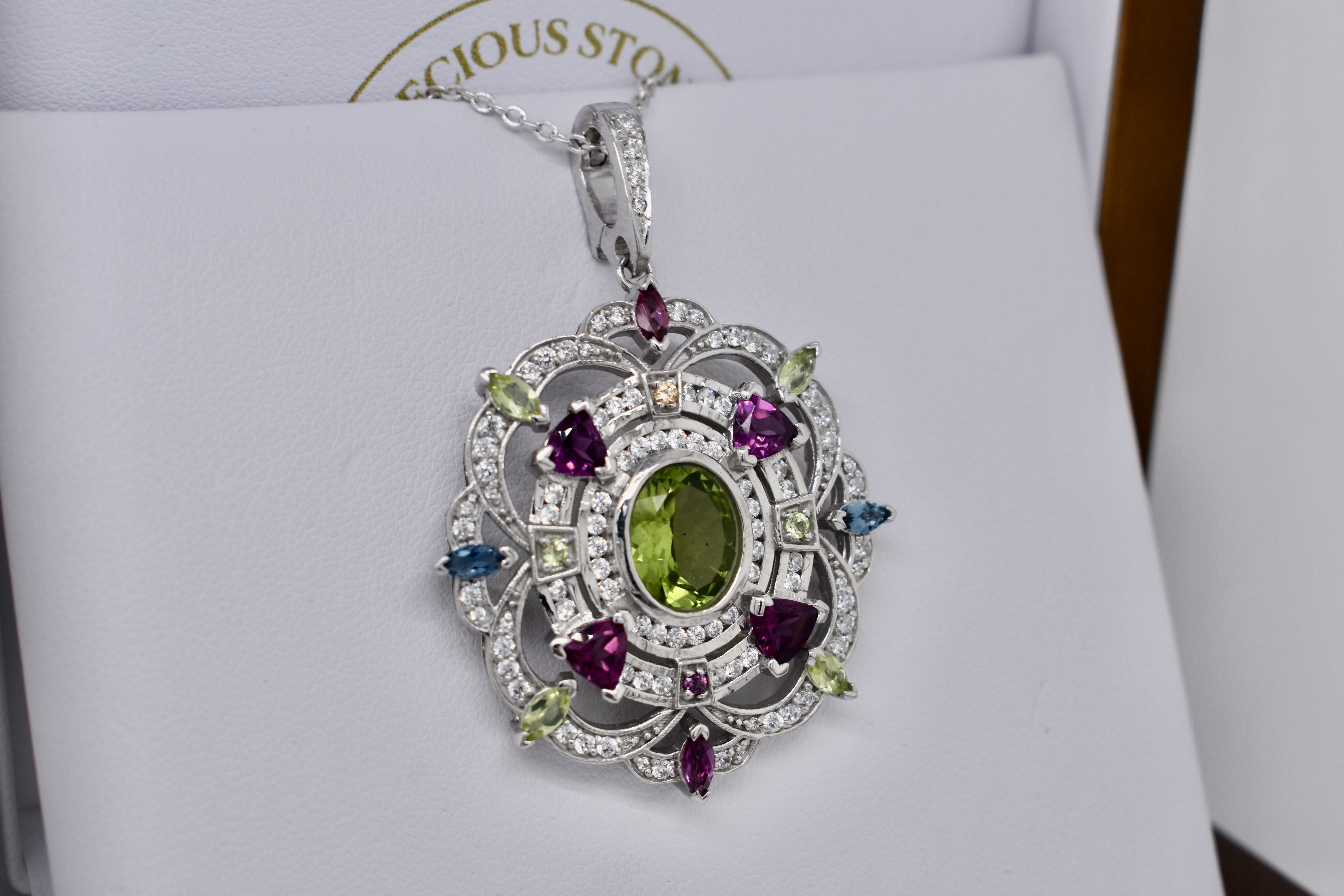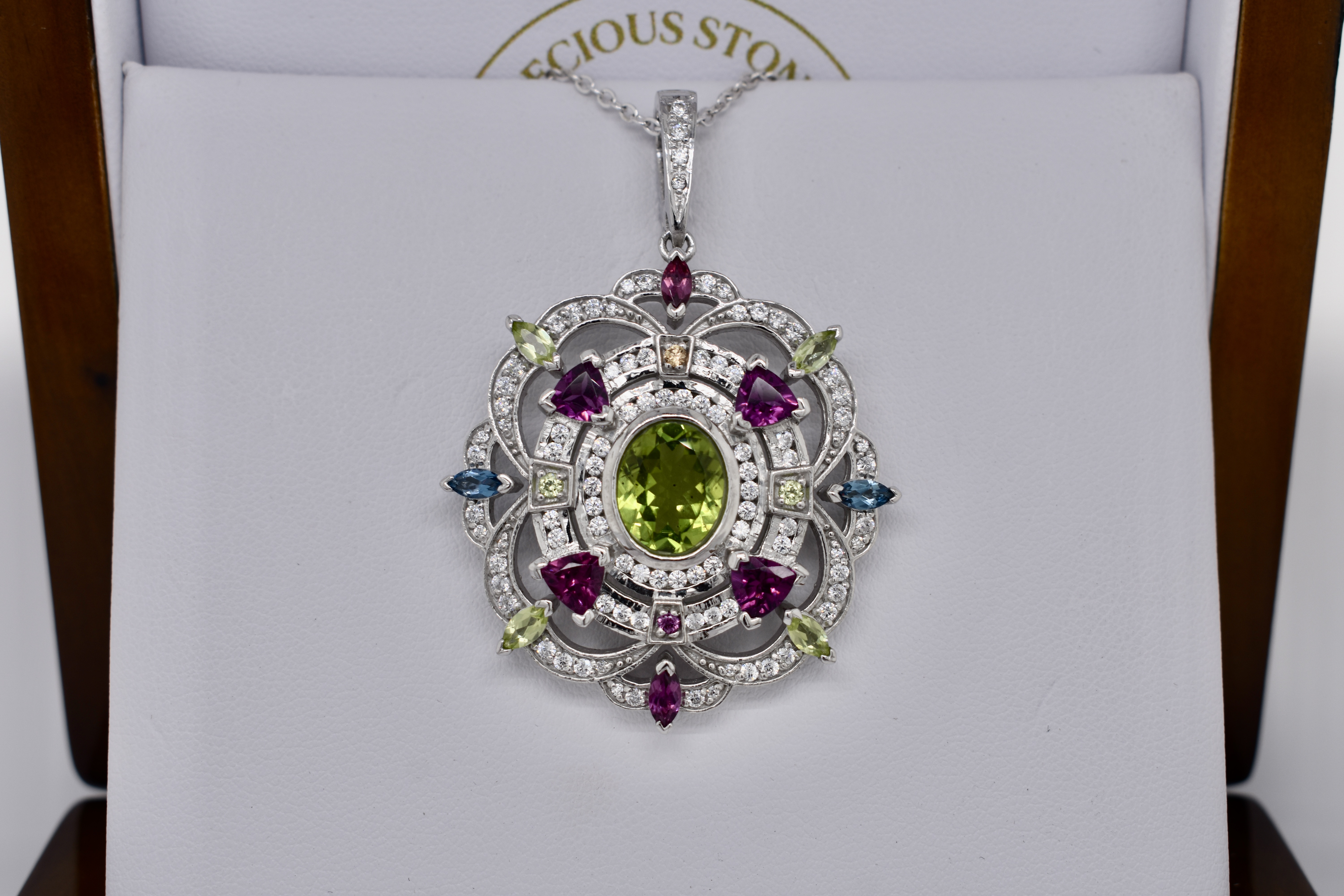 Colourful sterling silver enhancer, featuring an oval peridot in the centre, surrounded by multi coloured gemstones including topaz, rhodolite garnet and cubic zirconias. In a fancy scroll loop design, with more CZs studding the enhancer clip bale. Total measurement approx. 53x38mm. Chains available for separate purchase.