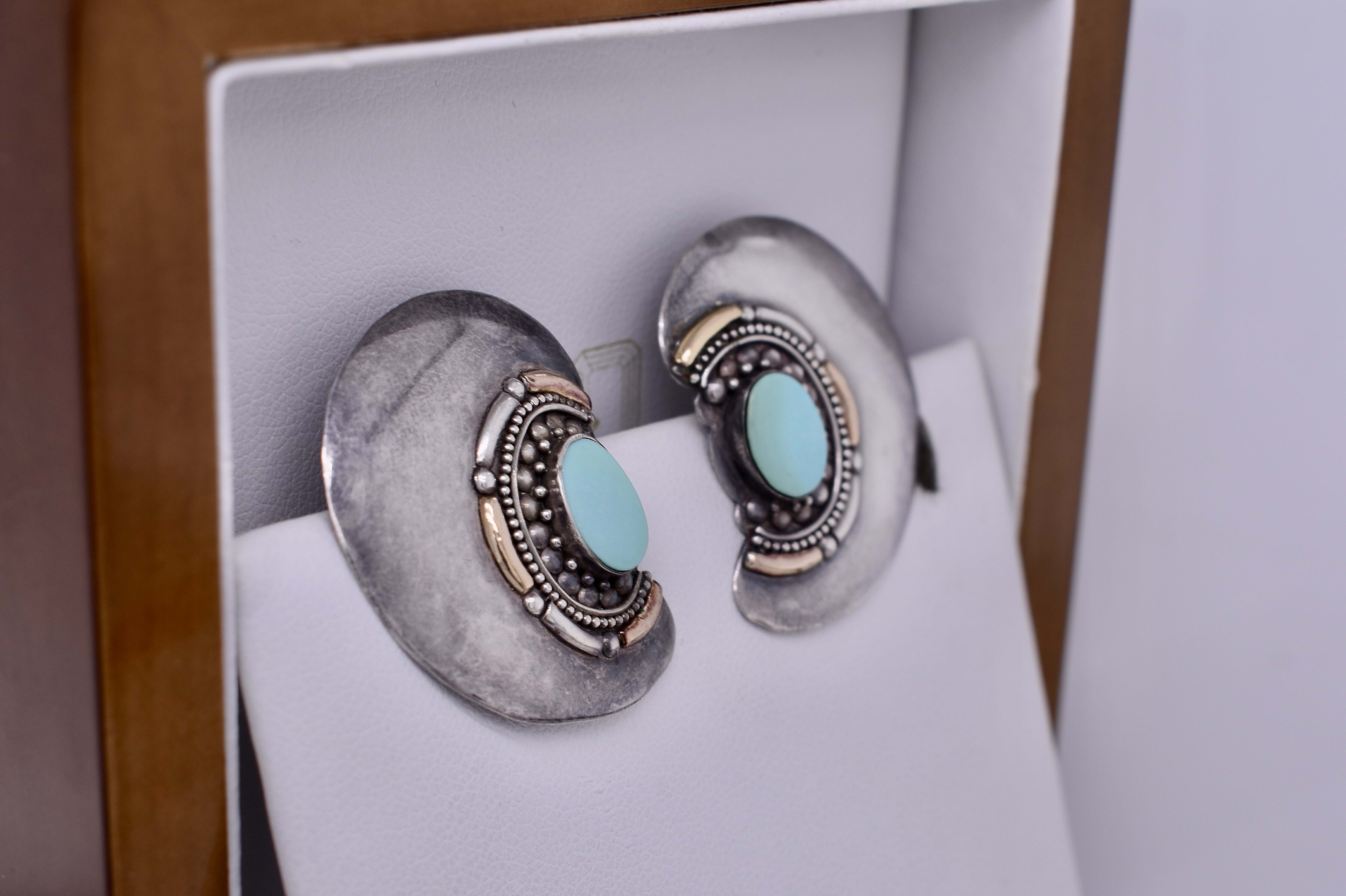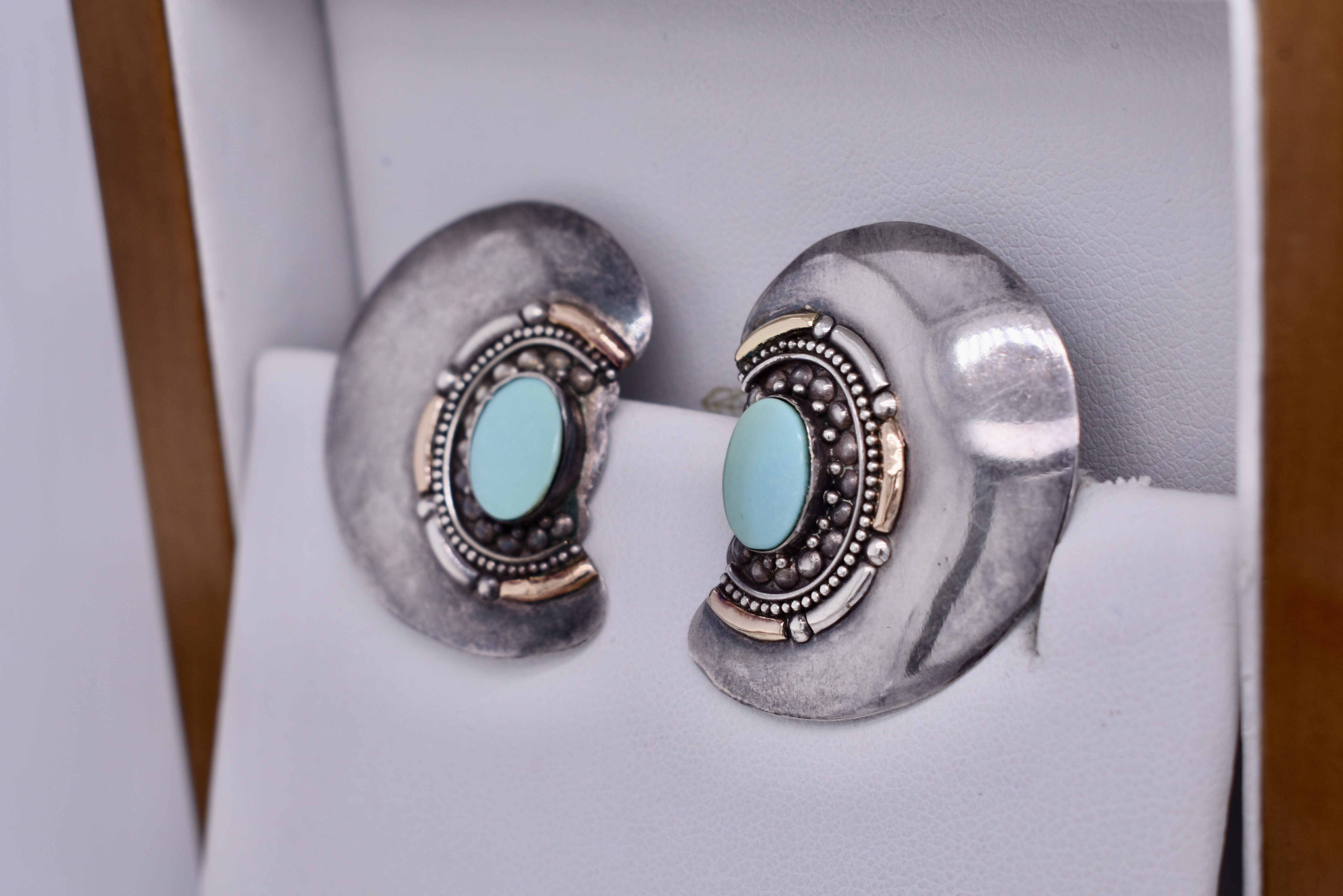 These vintage Native American earrings feature 9x6mm turquoise in the centre and measure a total of 32x25mm. They are made in sterling silver and have an array of detailing around the turquoise with some being 18ct rose gold. Total weight 6.9 grams. Finished with clipped post and butterfly fittings.