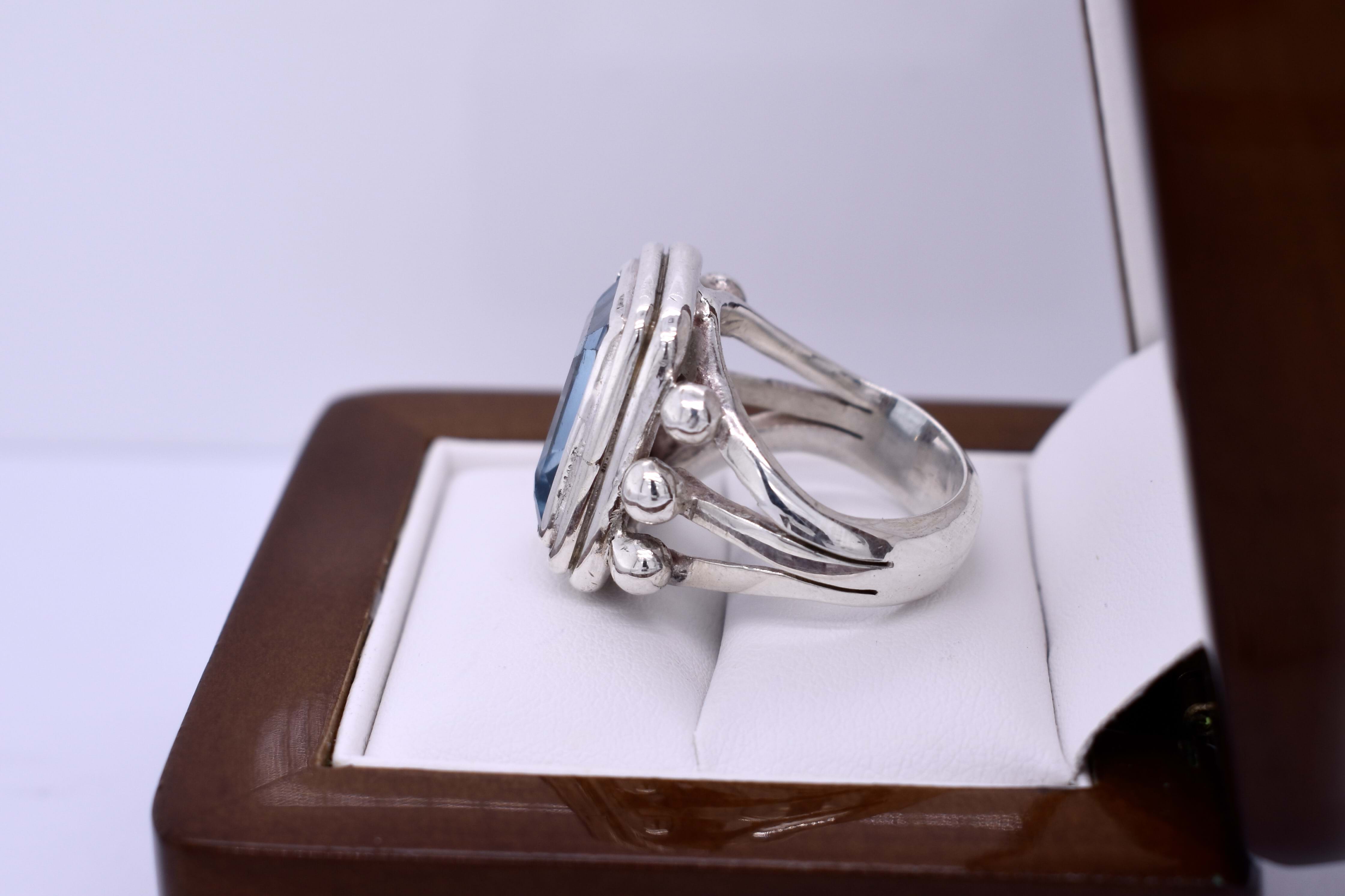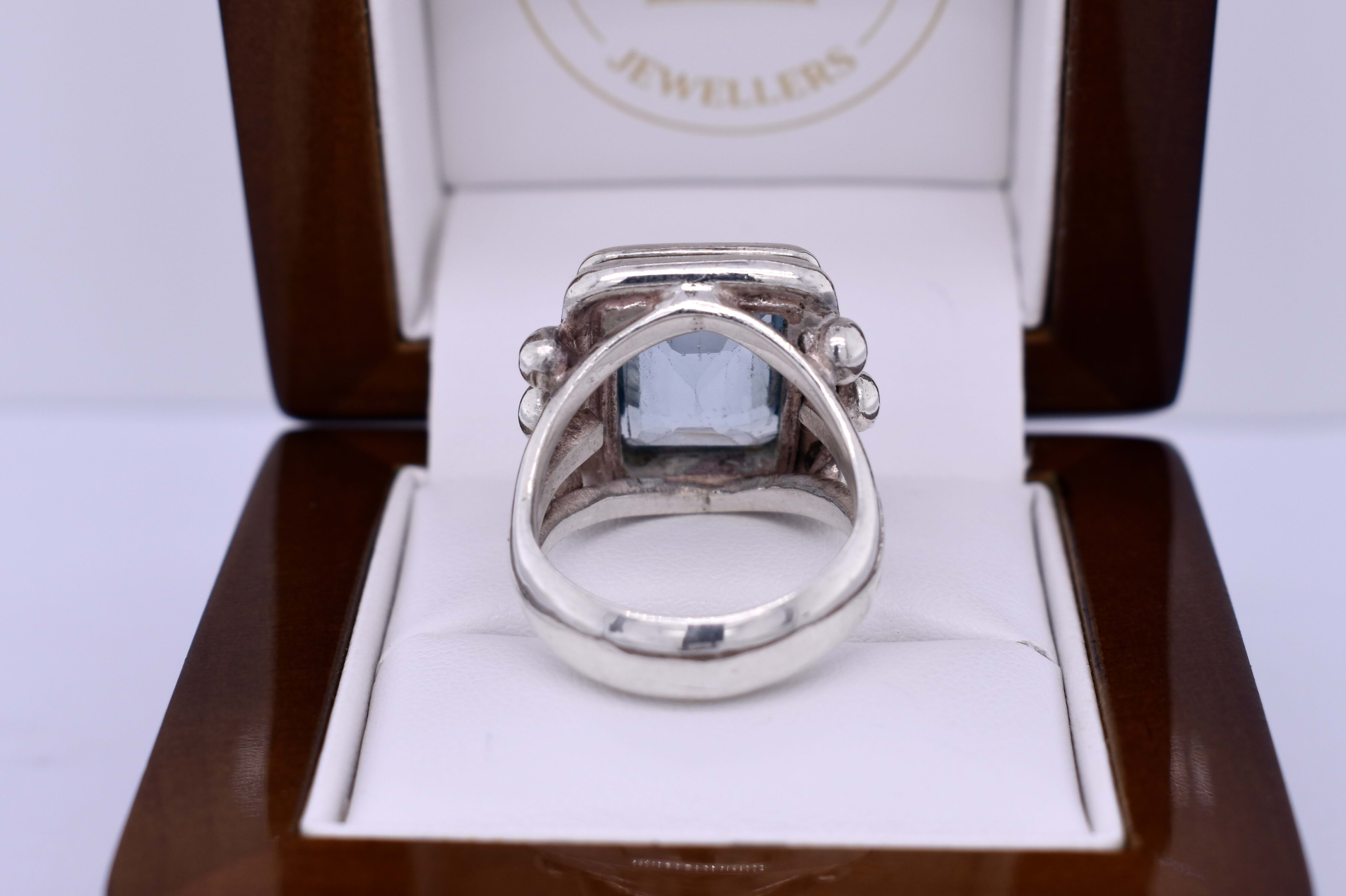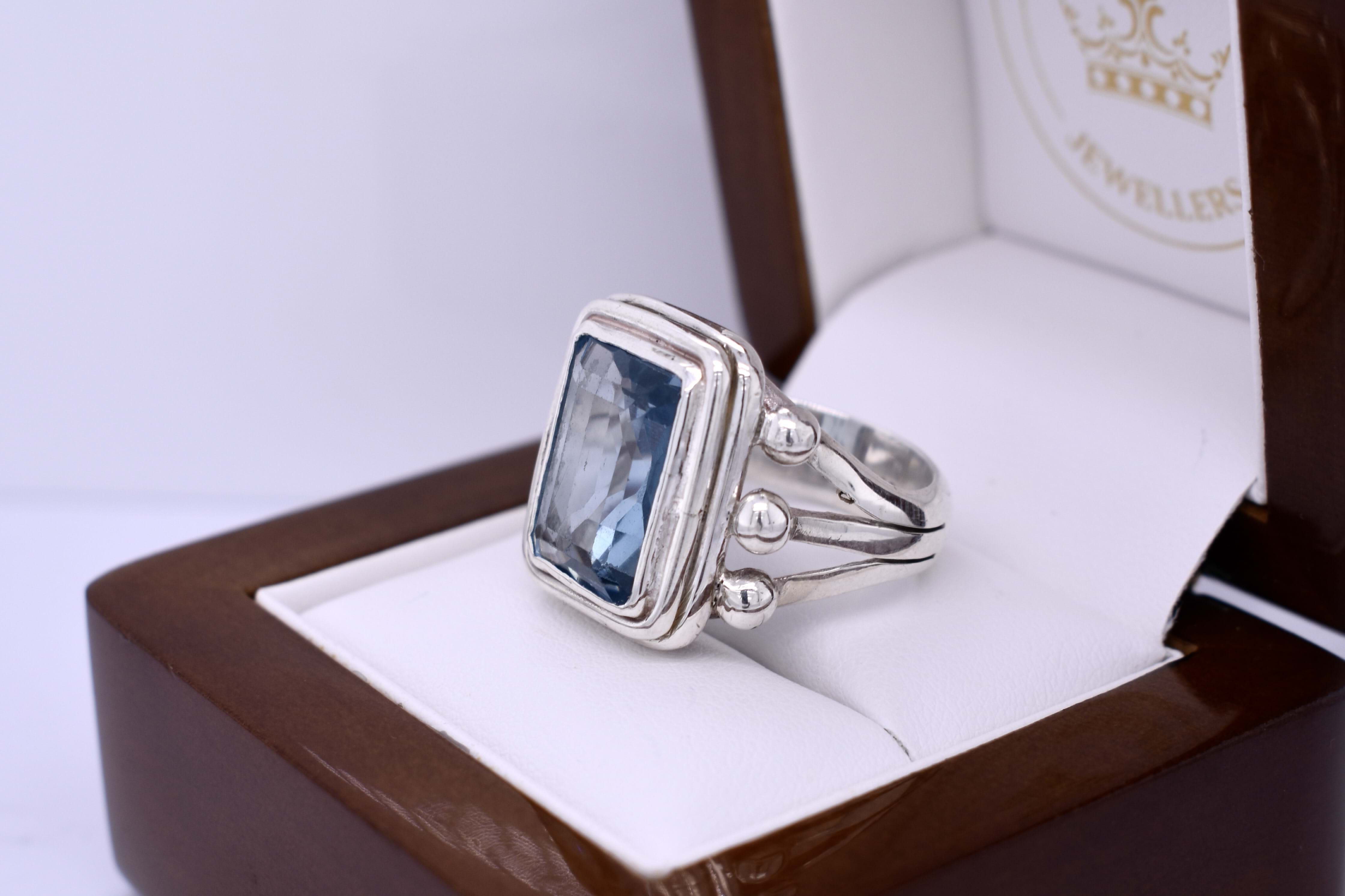 This gorgeous vintage ring features a 13x9mm emerald cut sky blue topaz, bezel set in sterling silver and has a split shoulder band with sterling silver detailing. Finger size O.