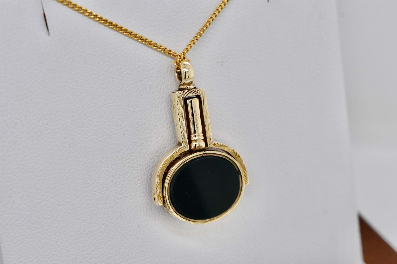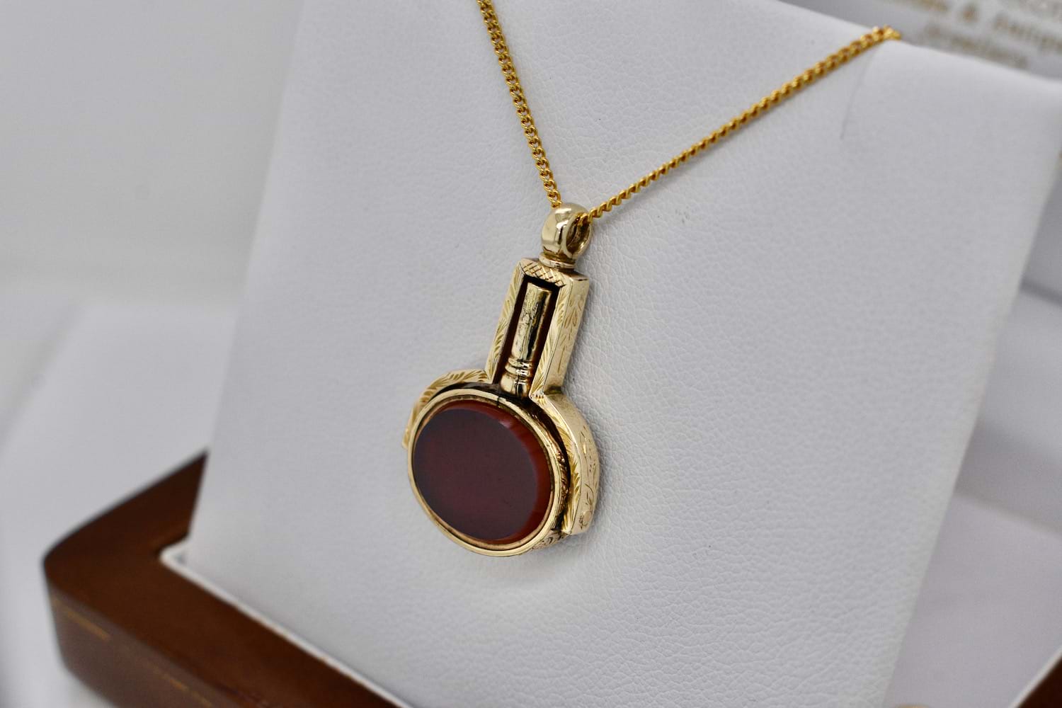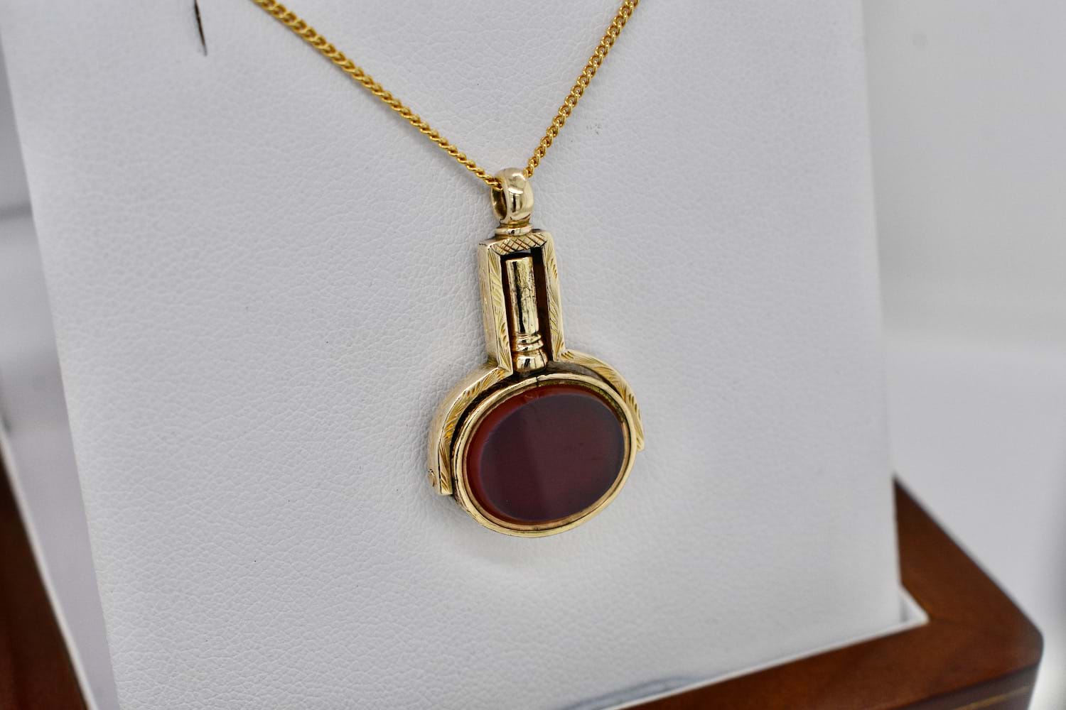 Victorian bloodstone and carnelian watch key spinner testing as 8ct yellow gold and engraving on the frame. The tablets measure approx. 14x12mm oval. Independent Valuation Supplied. Chains are available for separate purchase