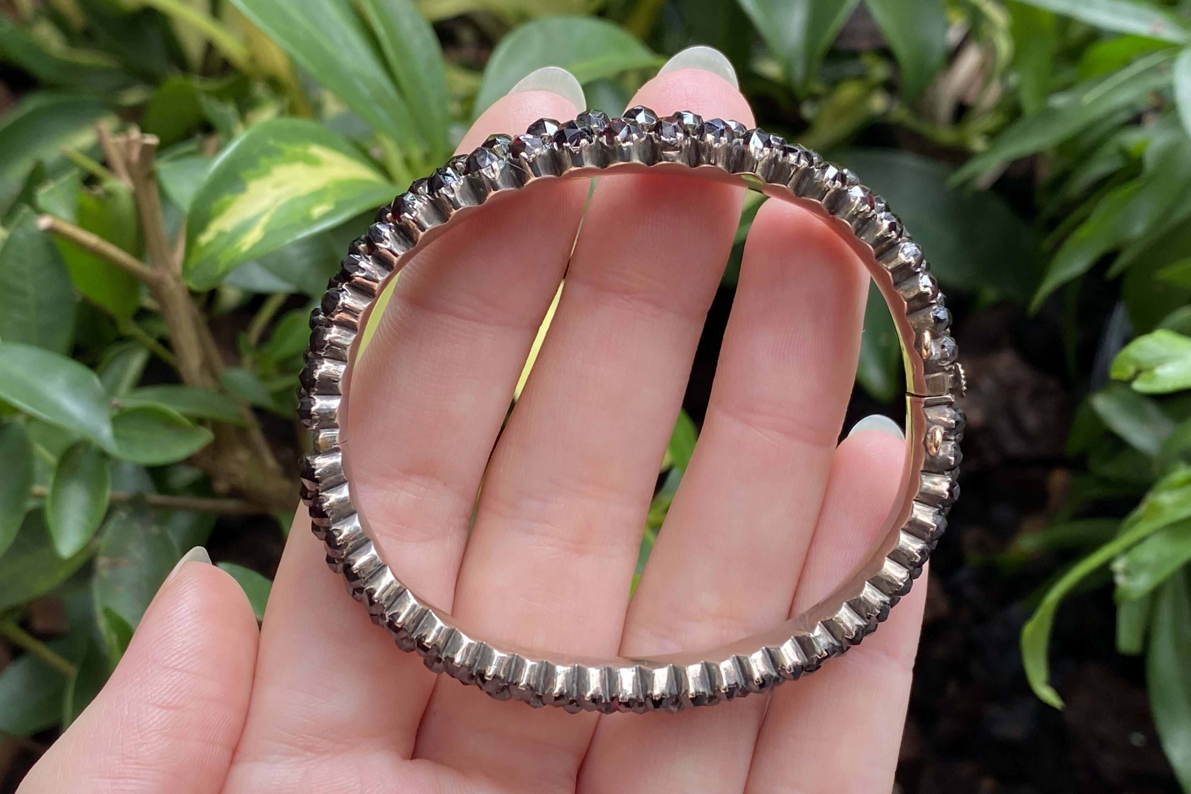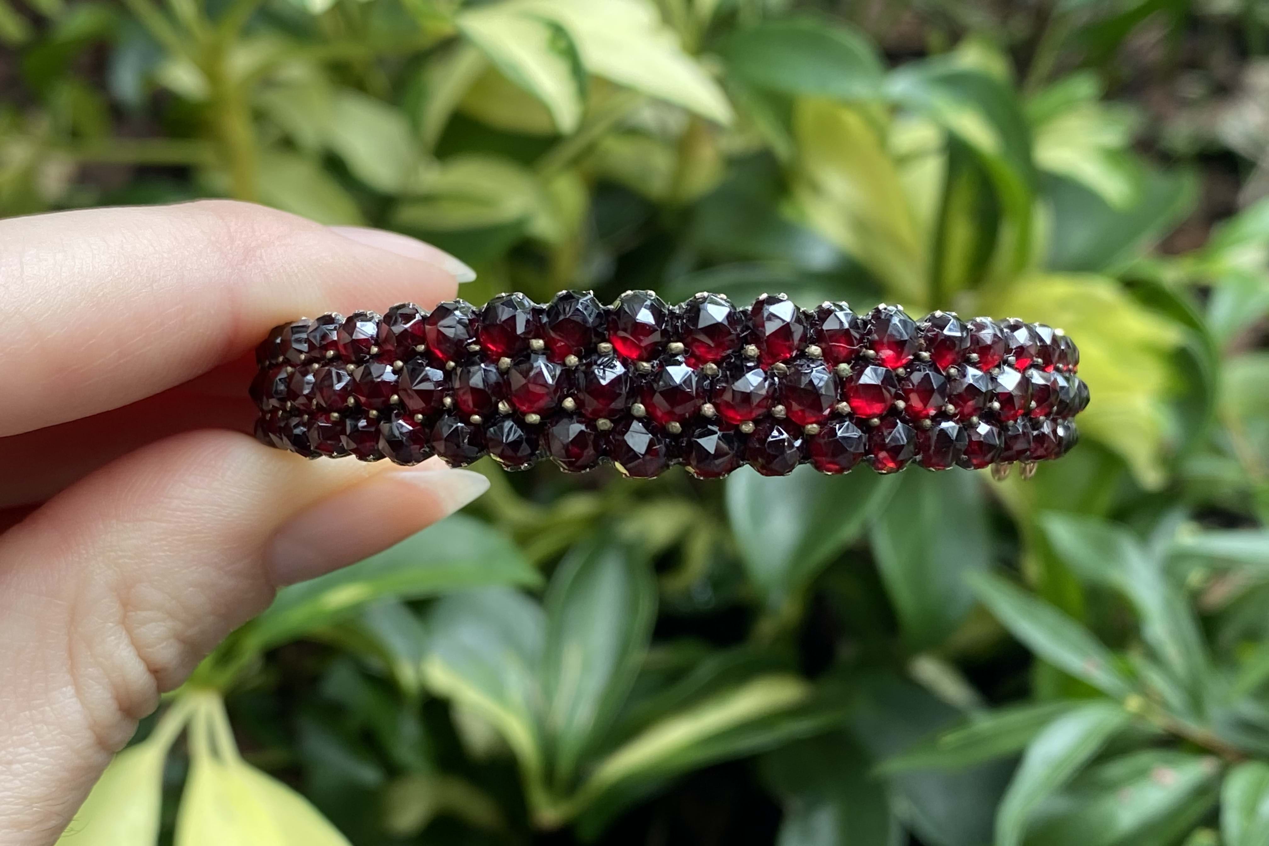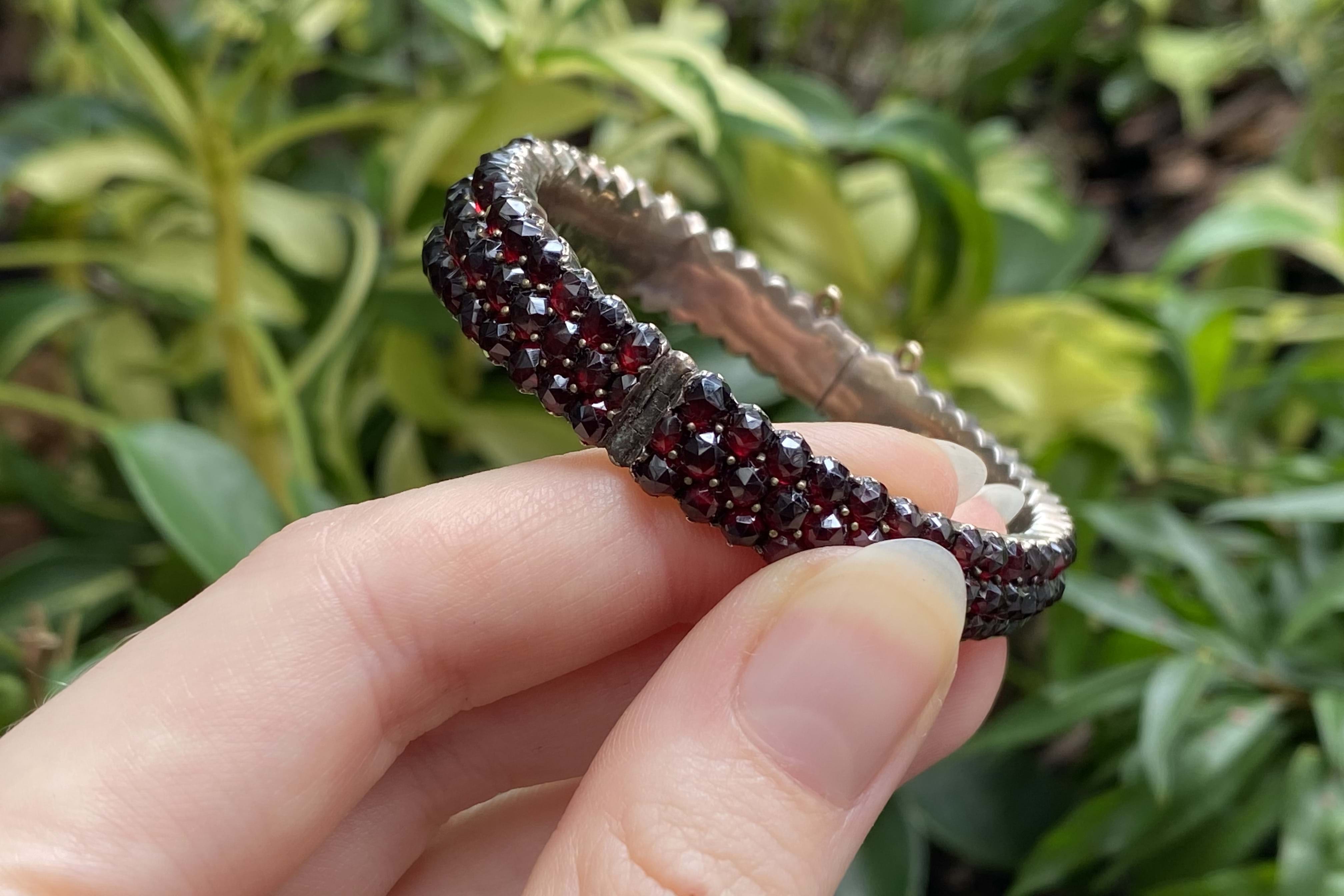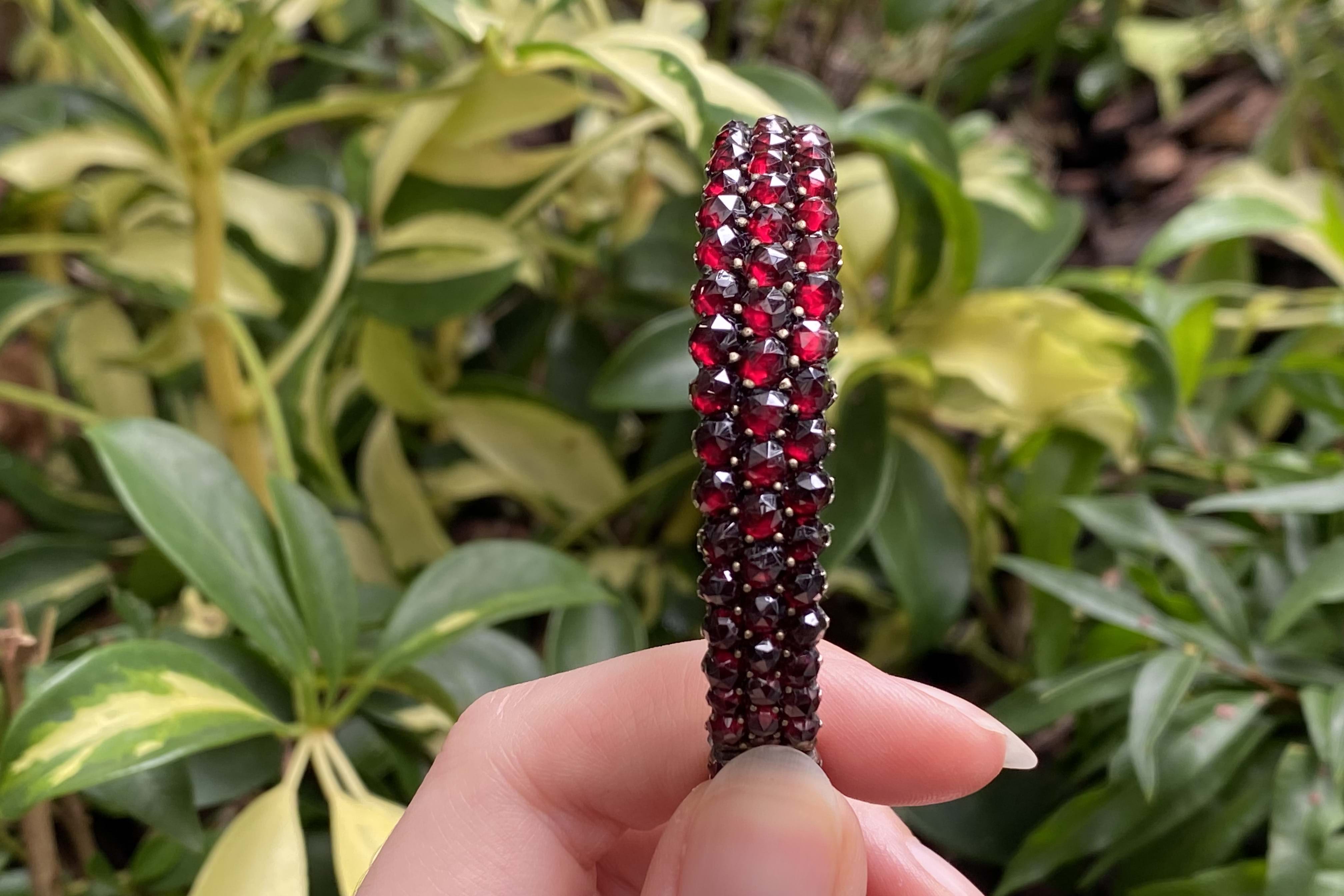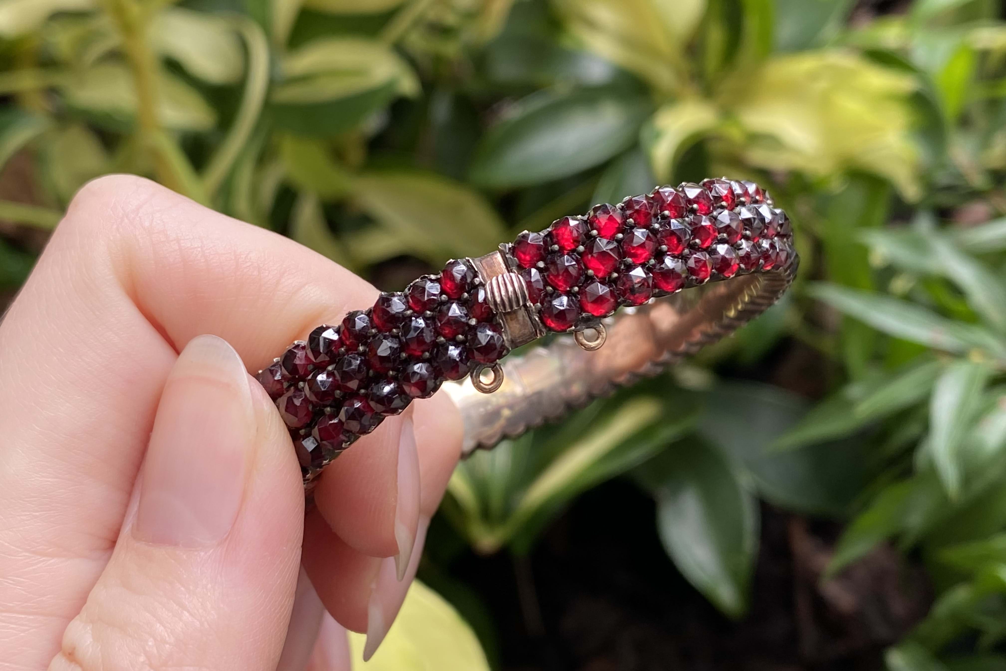Encrusted with rich red Bohemian garnets this Victorian bangle is silver gilt and set all the way around in three rows with rose cut Bohemian garnets ranging from 3.2-4.1mm and measures 12.2-9.4mm wide with a concealed tongue and groove clasp. Dated circa 1880. Note: dint on inside of bangle. Independent Valuation Supplied