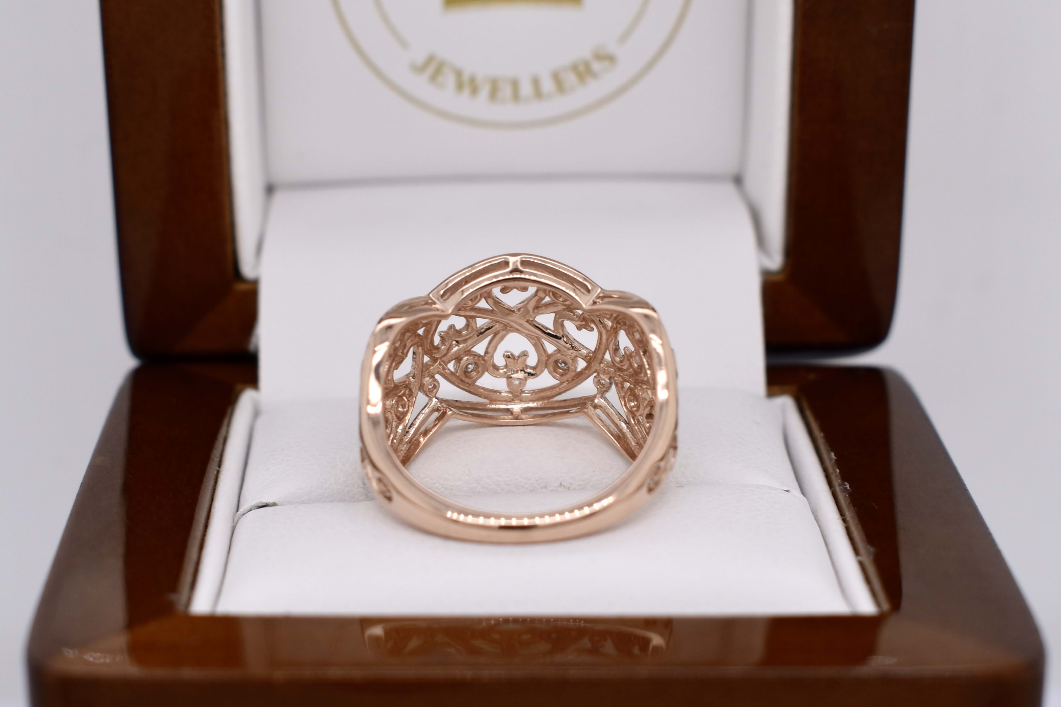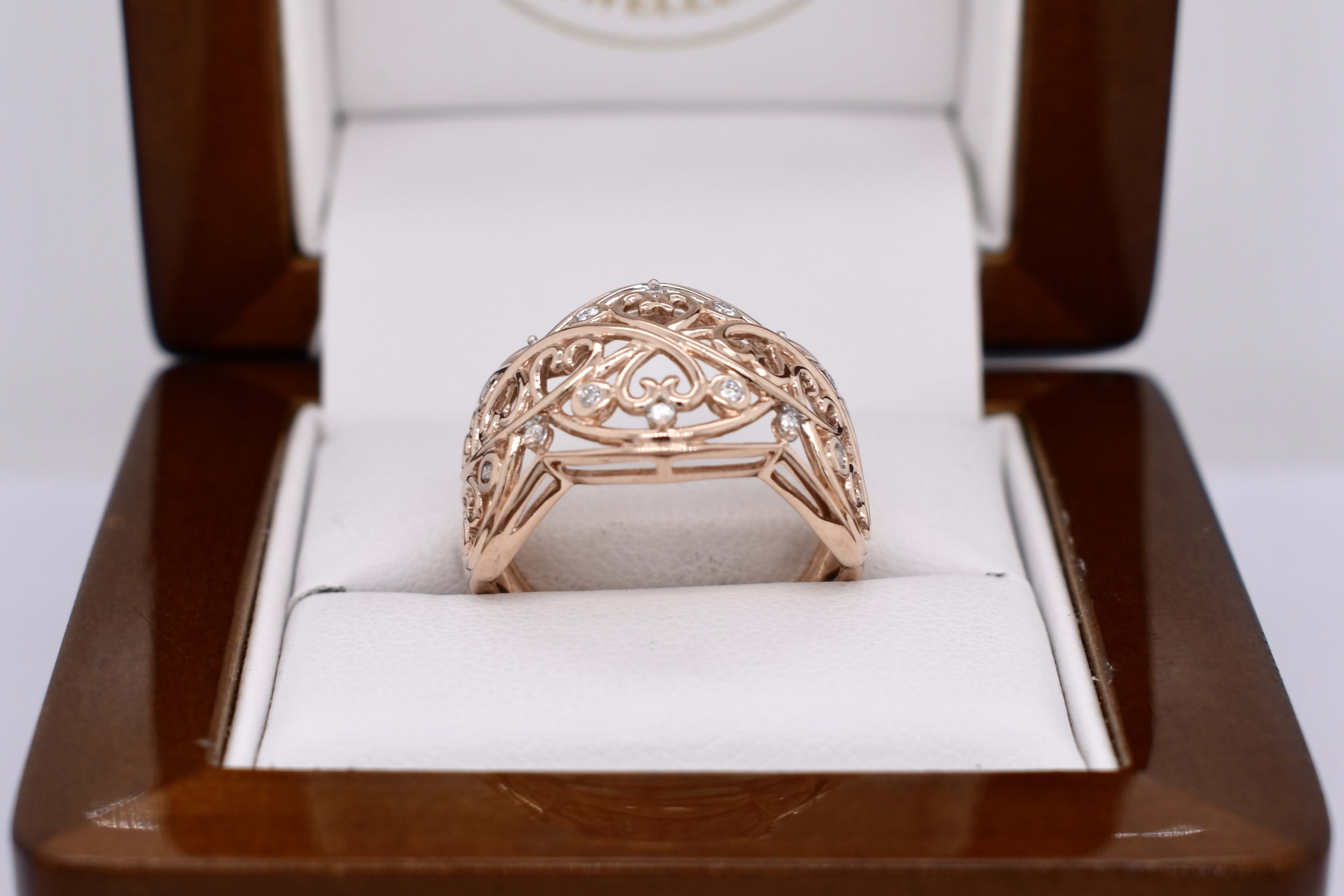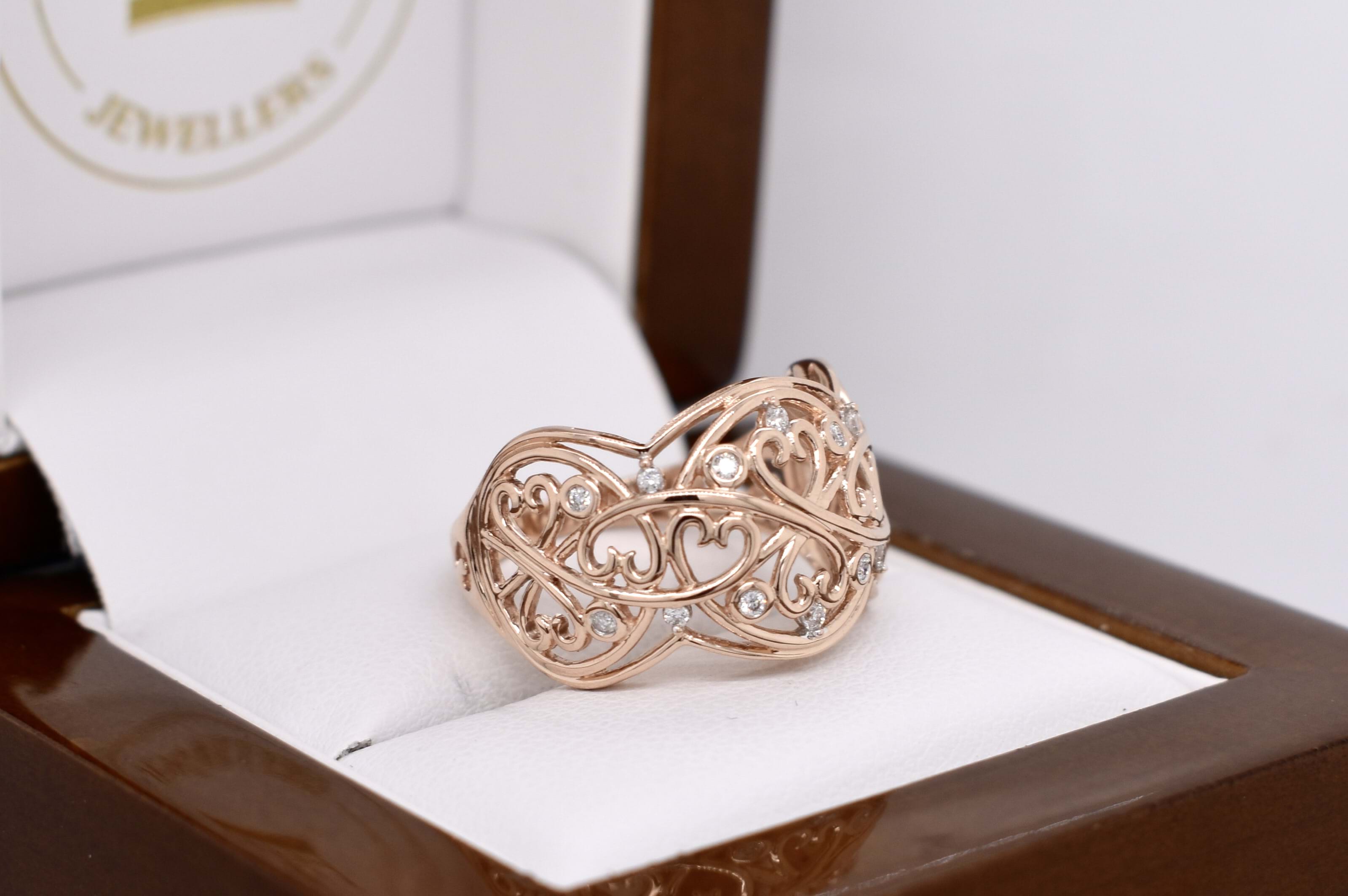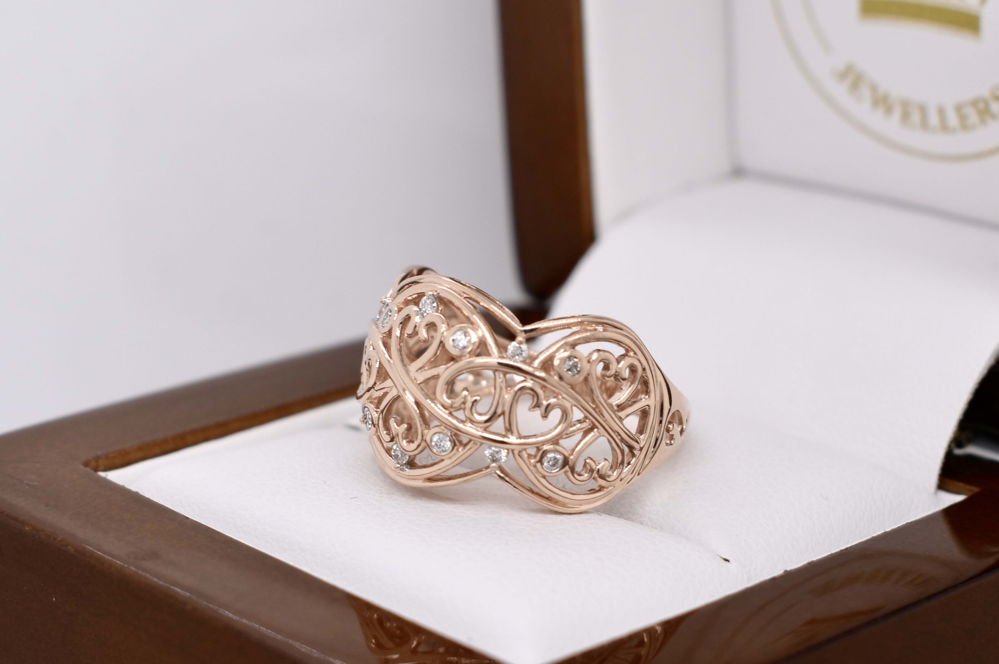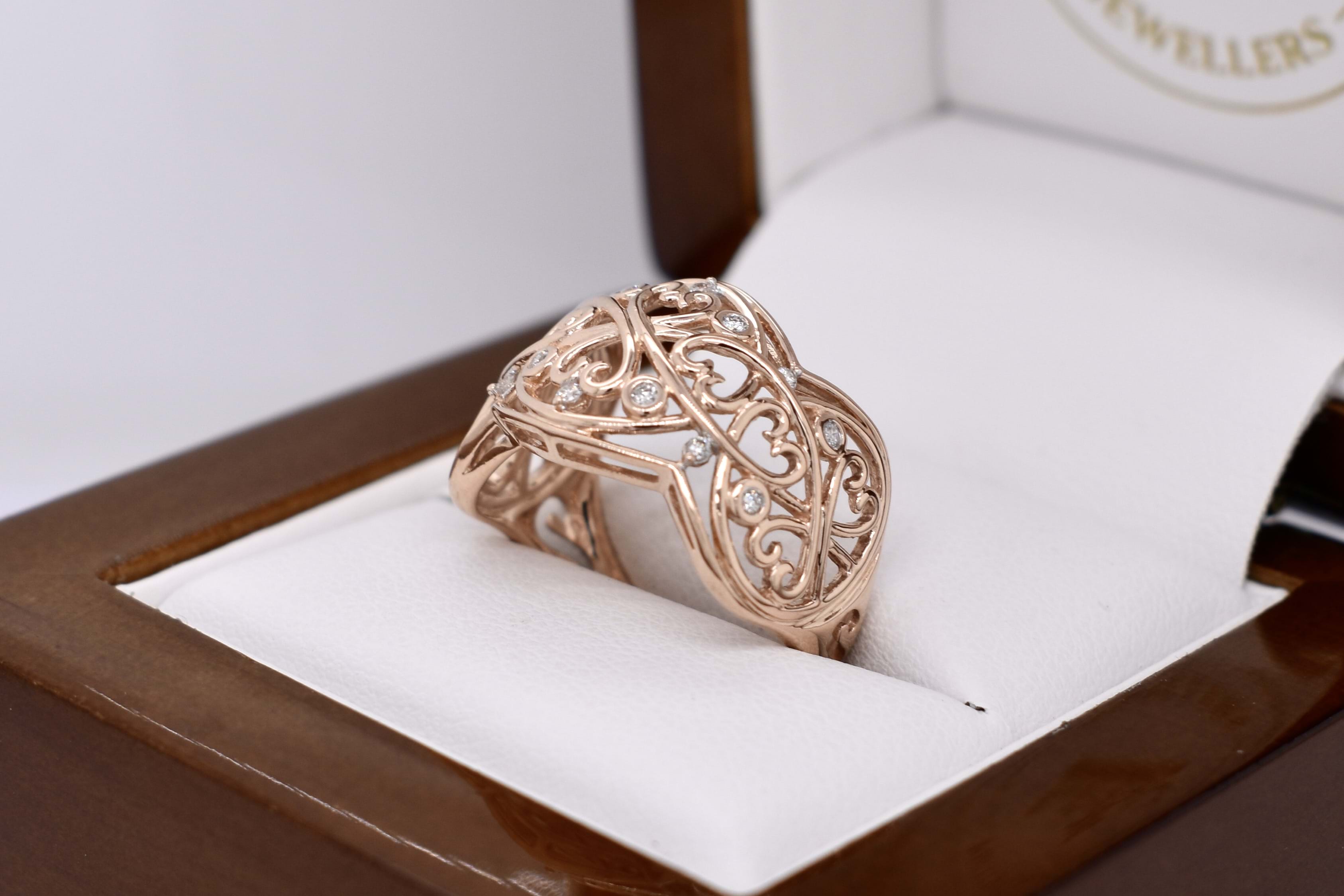 This lovely 10ct rose gold cut out wide filigree ring is scattered with small round brilliant cut diamonds throughout. Measuring 13.5-2.0mm wide. Finger size N+.
