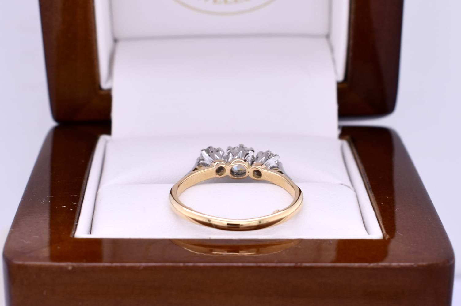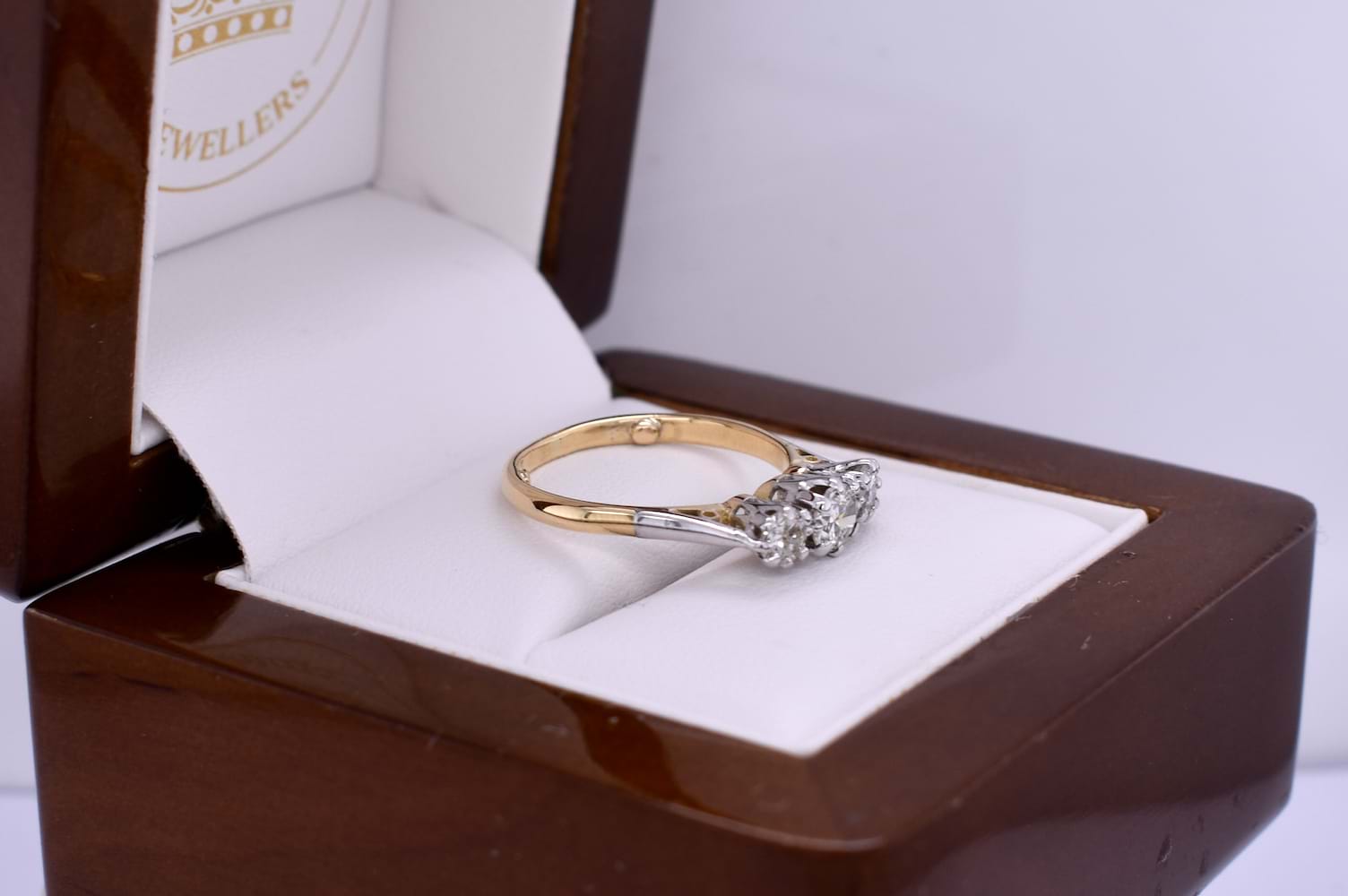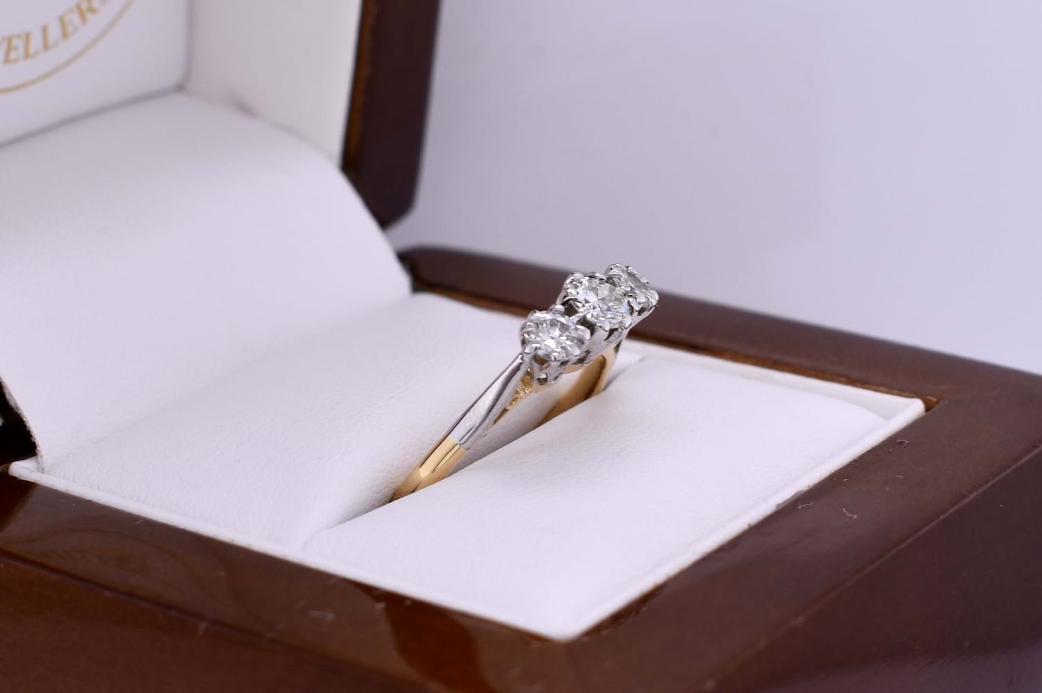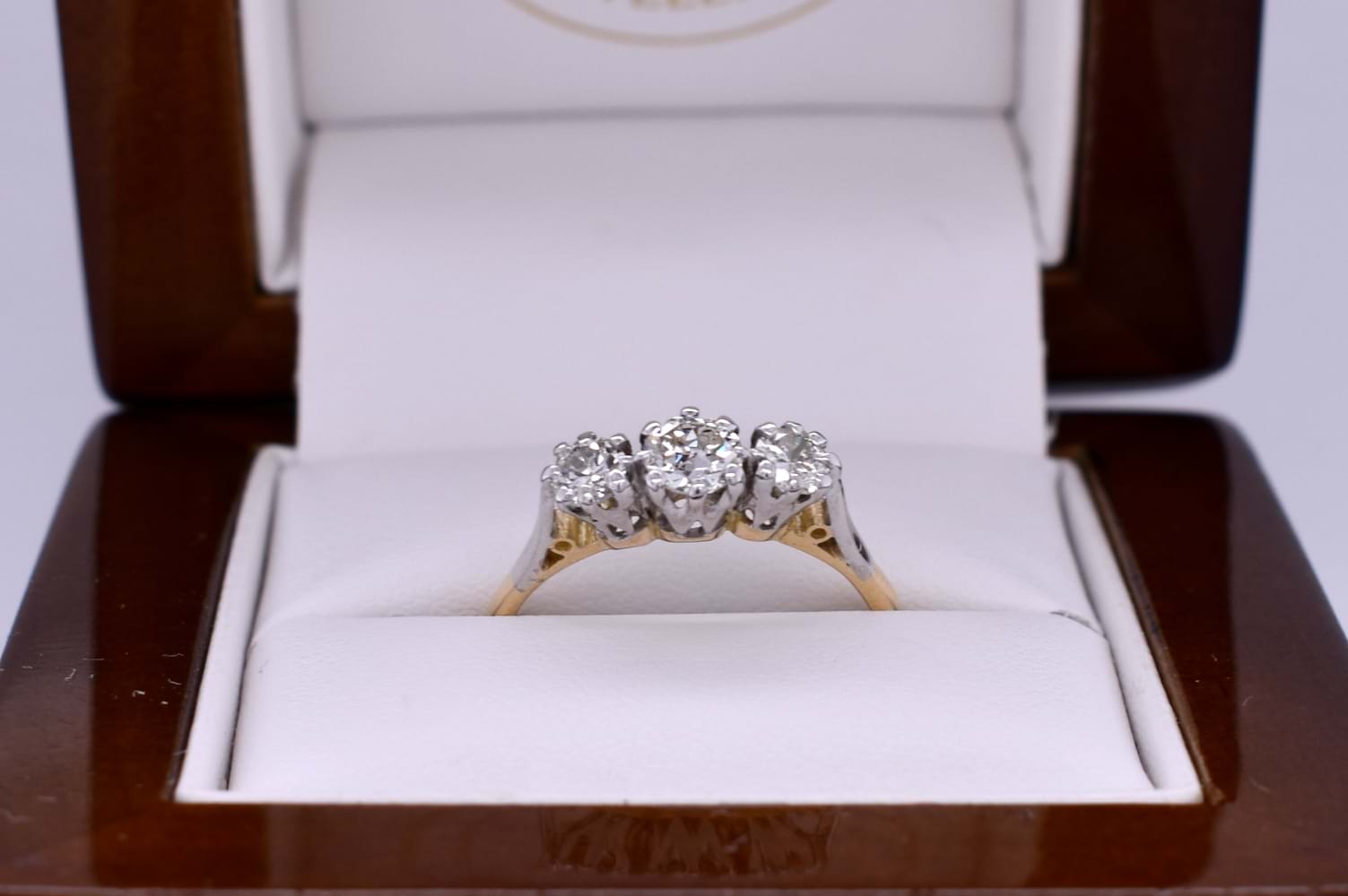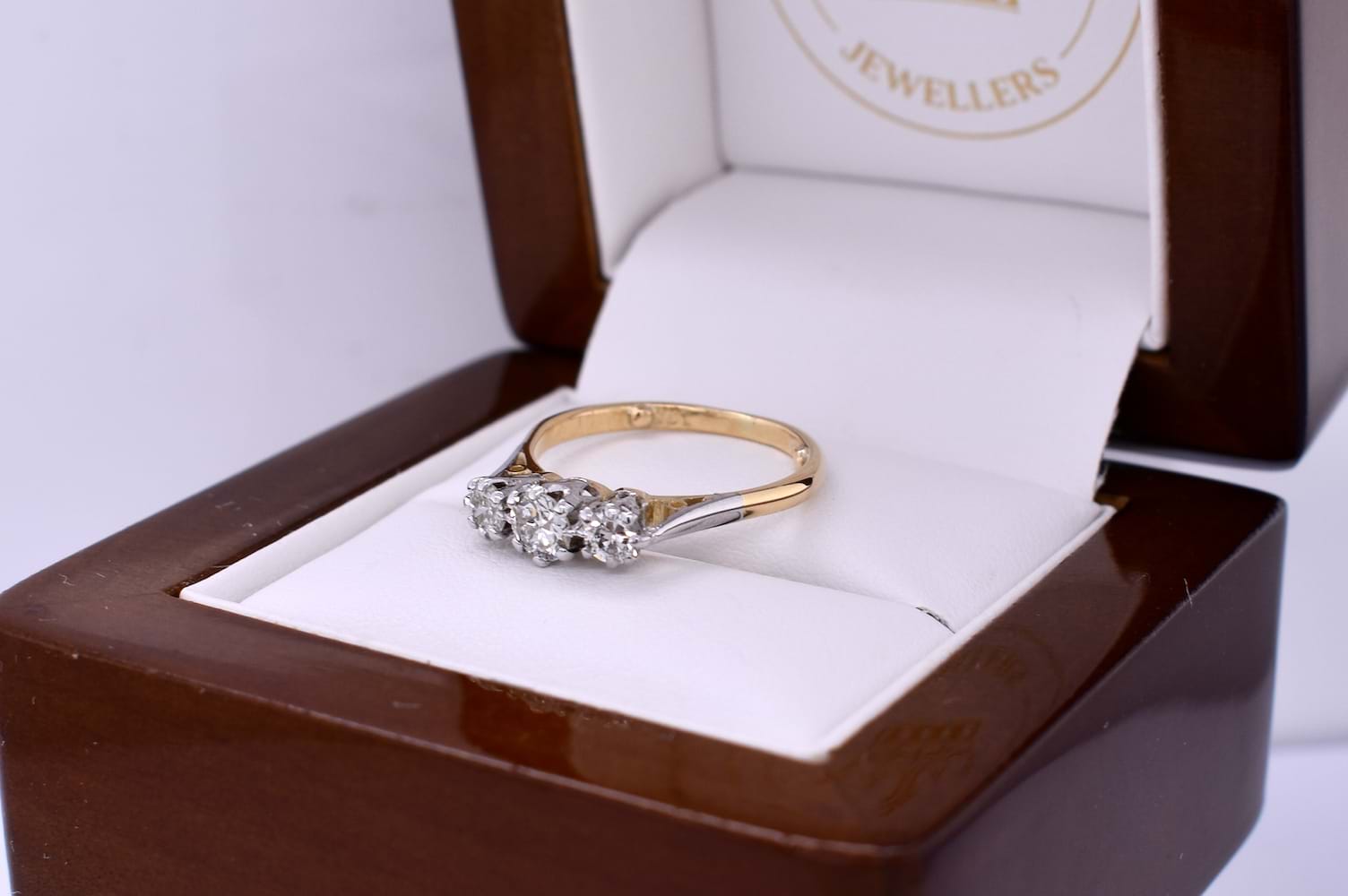 This appealing 18ct yellow & white gold 3 stone ring features a 0.27ct K VS1 semi modern cut diamond flanked by two semi modern cuts equalling 0.34ct (one being chipped). The diamonds are 8 claw set in white gold, on a yellow gold 1.83mm band. Dated circa 1940s. Diamonds graded as HSI, KSI. Finger size K+ including sizing balls. Independent valuation supplied.