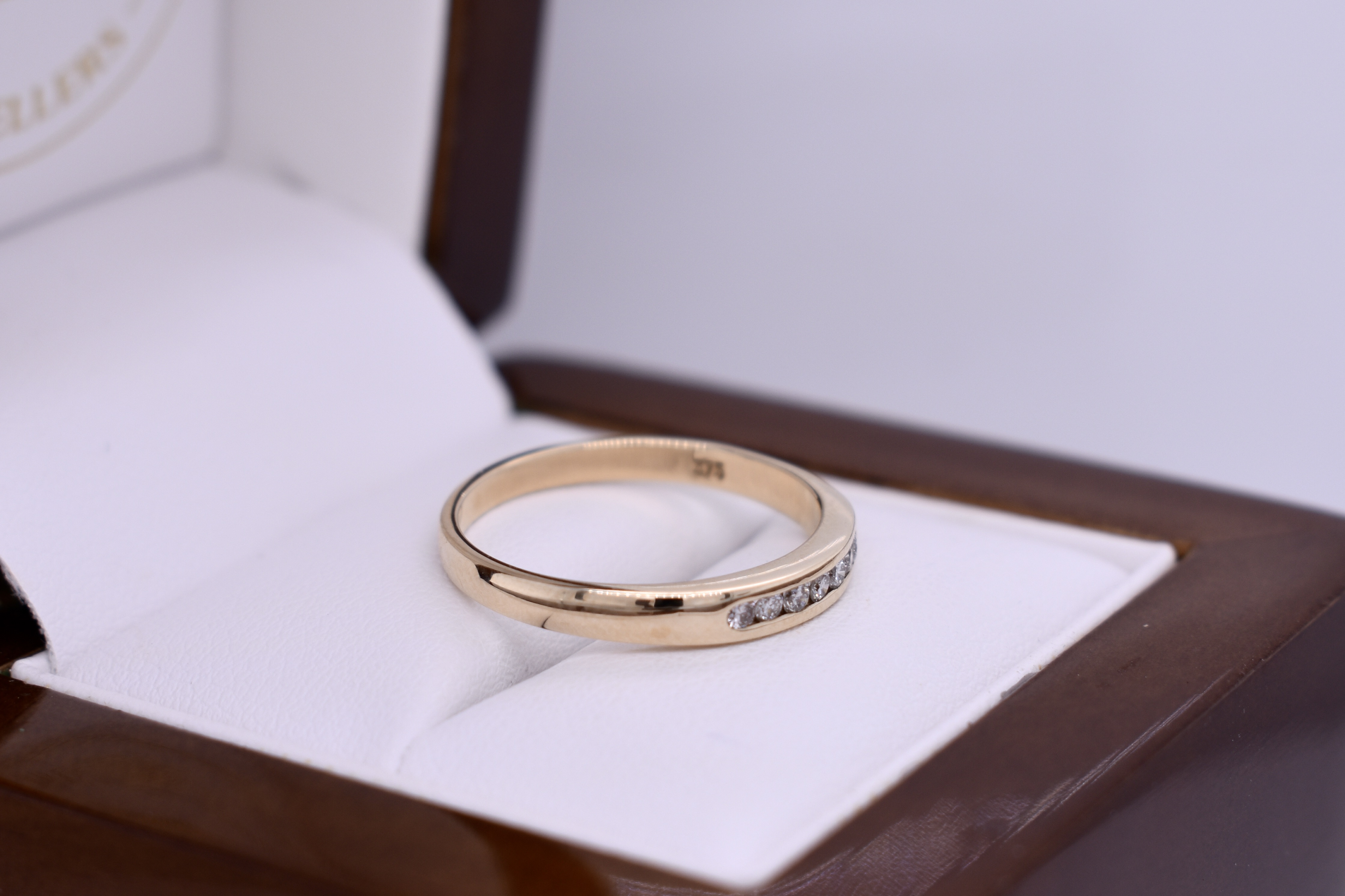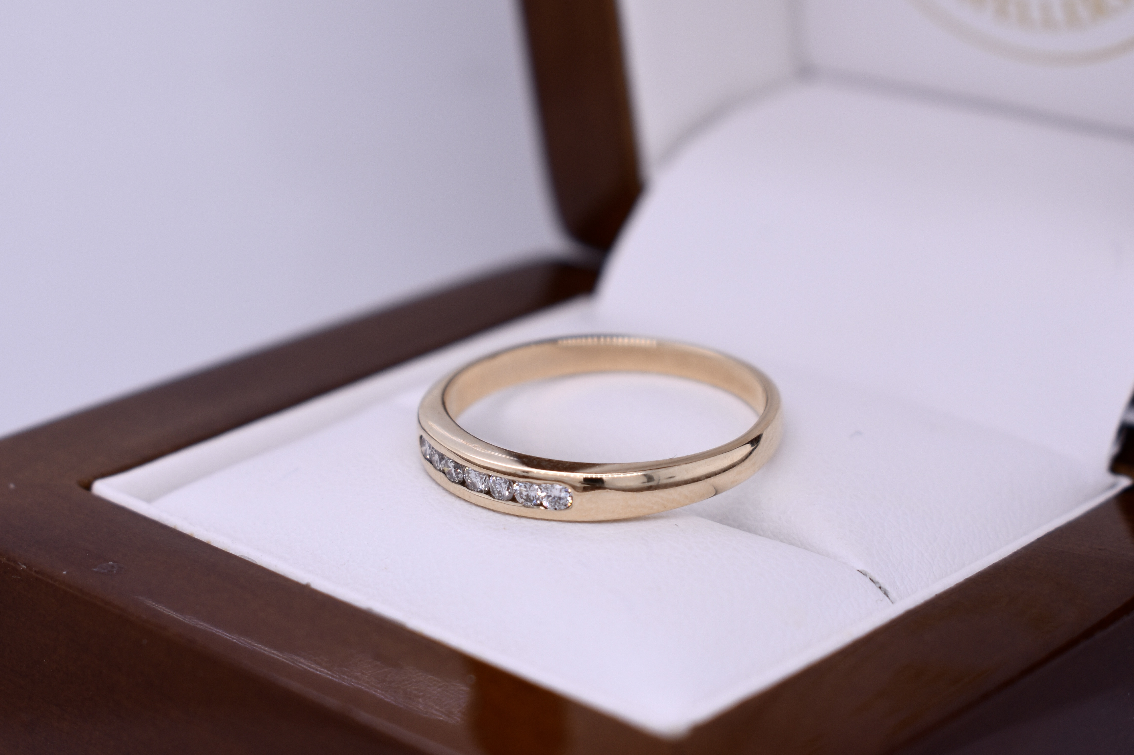 Crafted in 9ct yellow gold, this lovely diamond band features 7 round brilliant cut diamonds, measuring 1.8mm, channel set into the 1/4 round band. Total diamond weight 0.18ct HIS. Band measures 2.97mm to 2.15mm wide with a total weight of 1.97grams and is a finger size O+. Independent valuation supplied