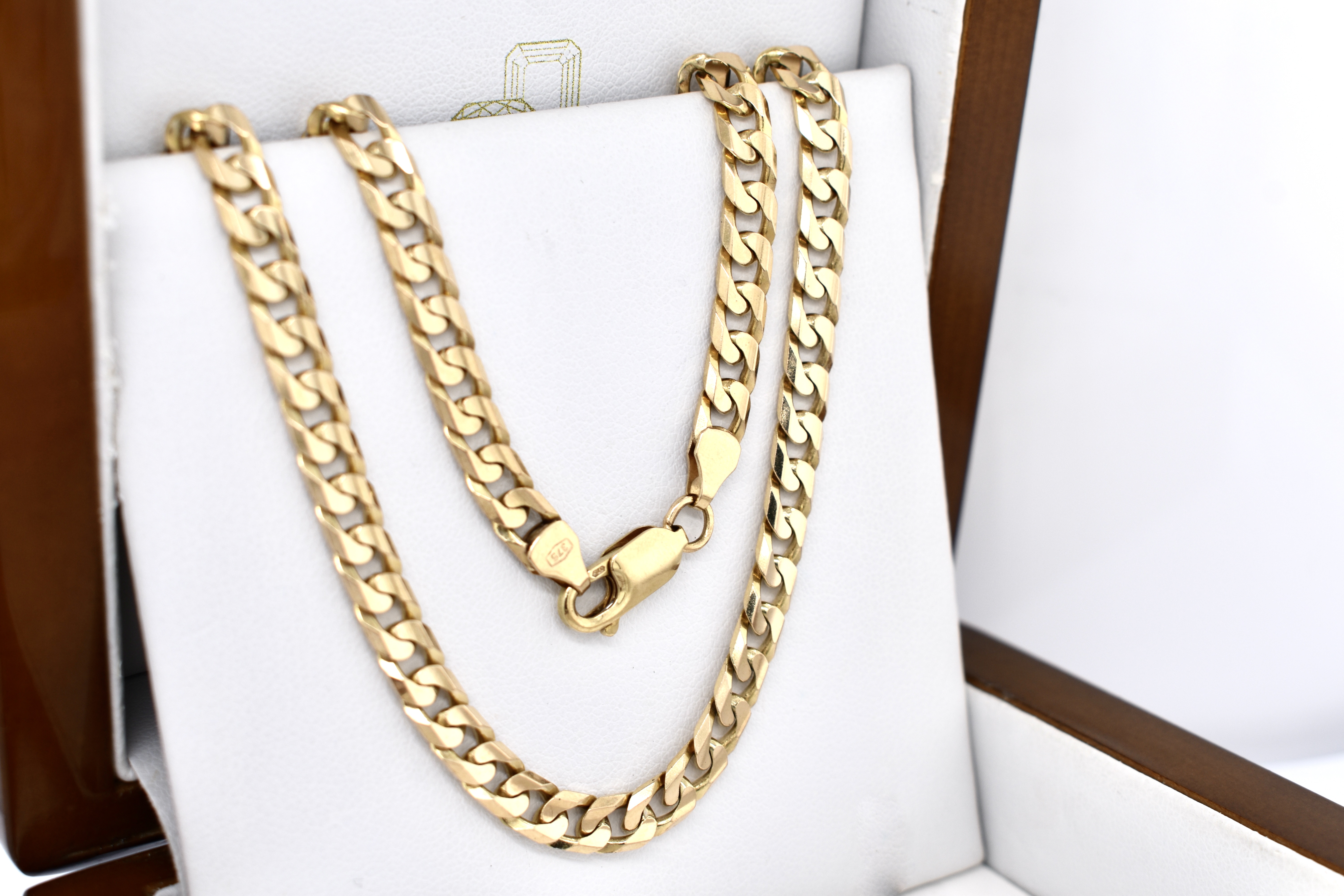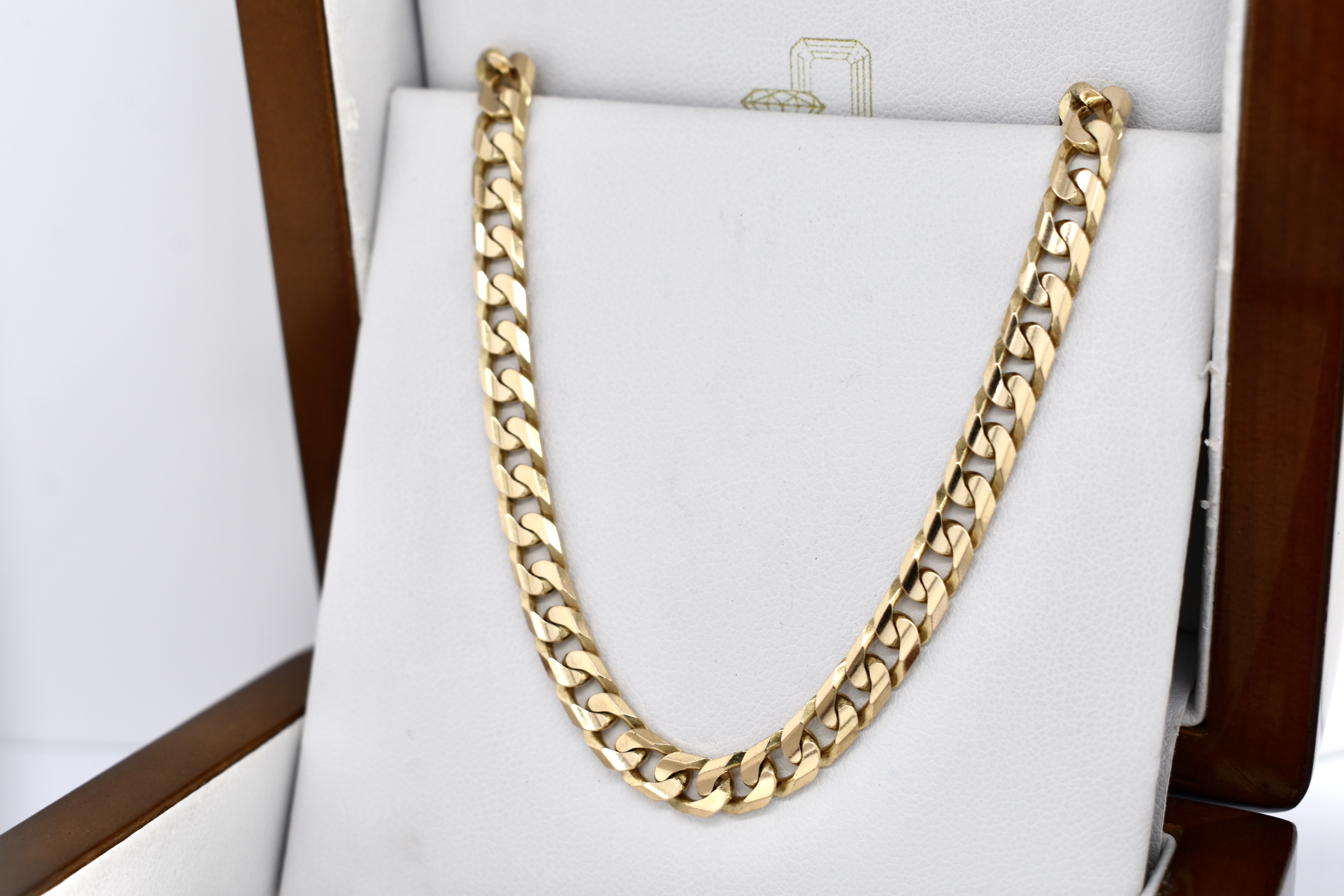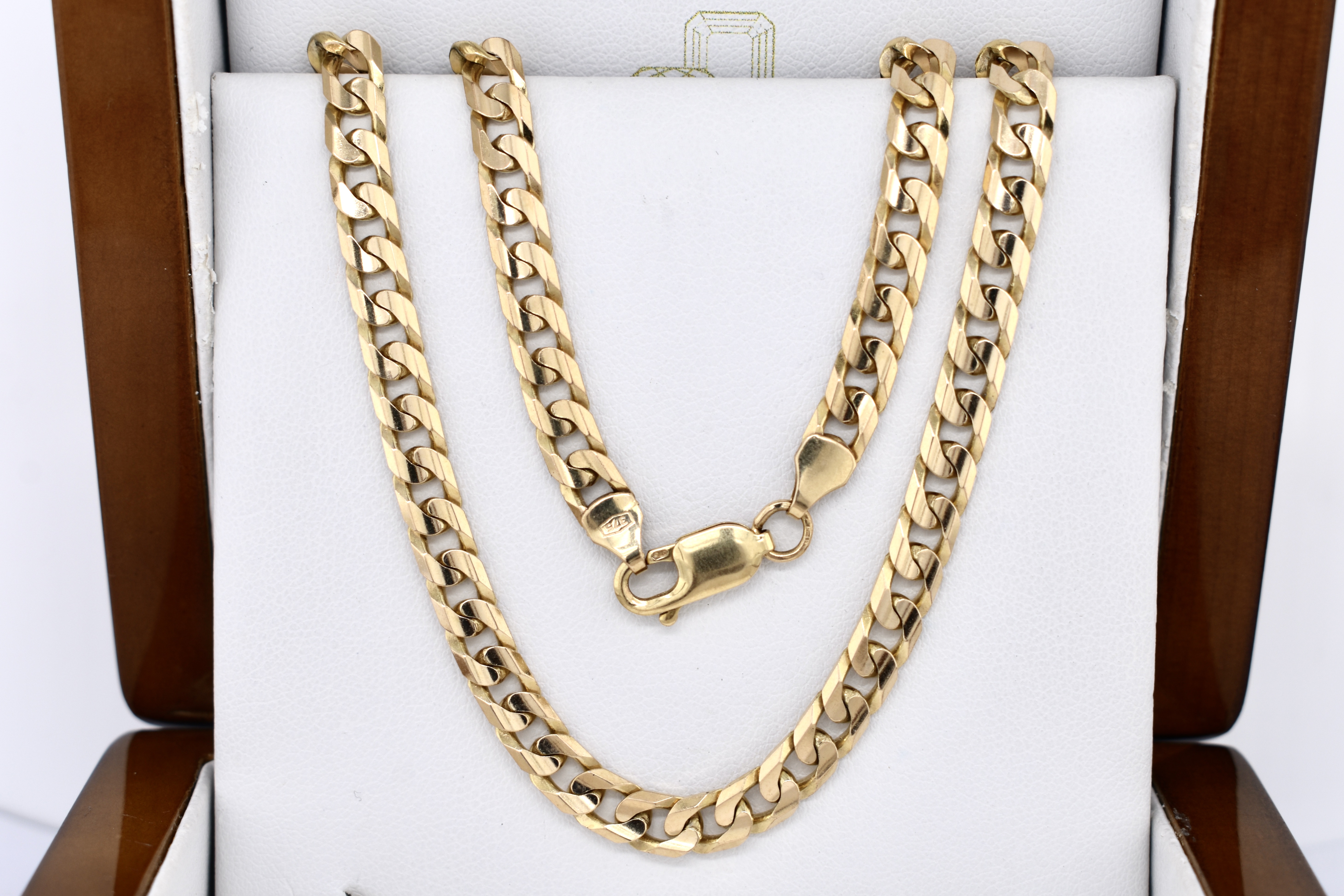 This lovely vintage solid 9ct yellow gold chain features 6mm wide flat curb links and is secured with a parrot clasp. The total chain length is 50cm and weight is 24.20 grams.
