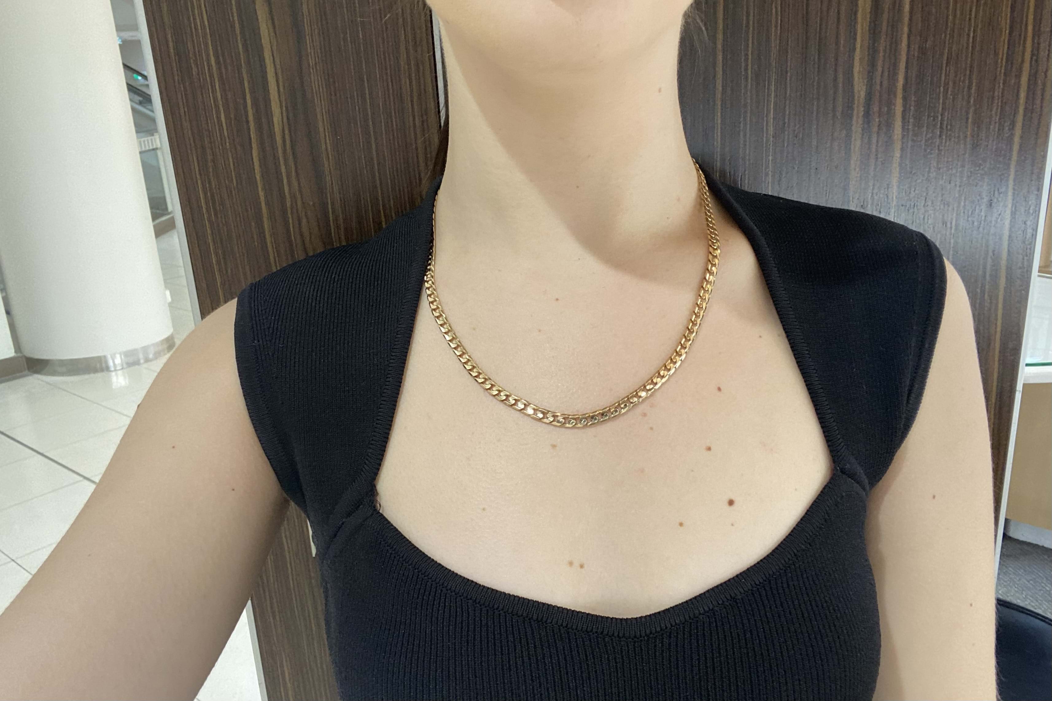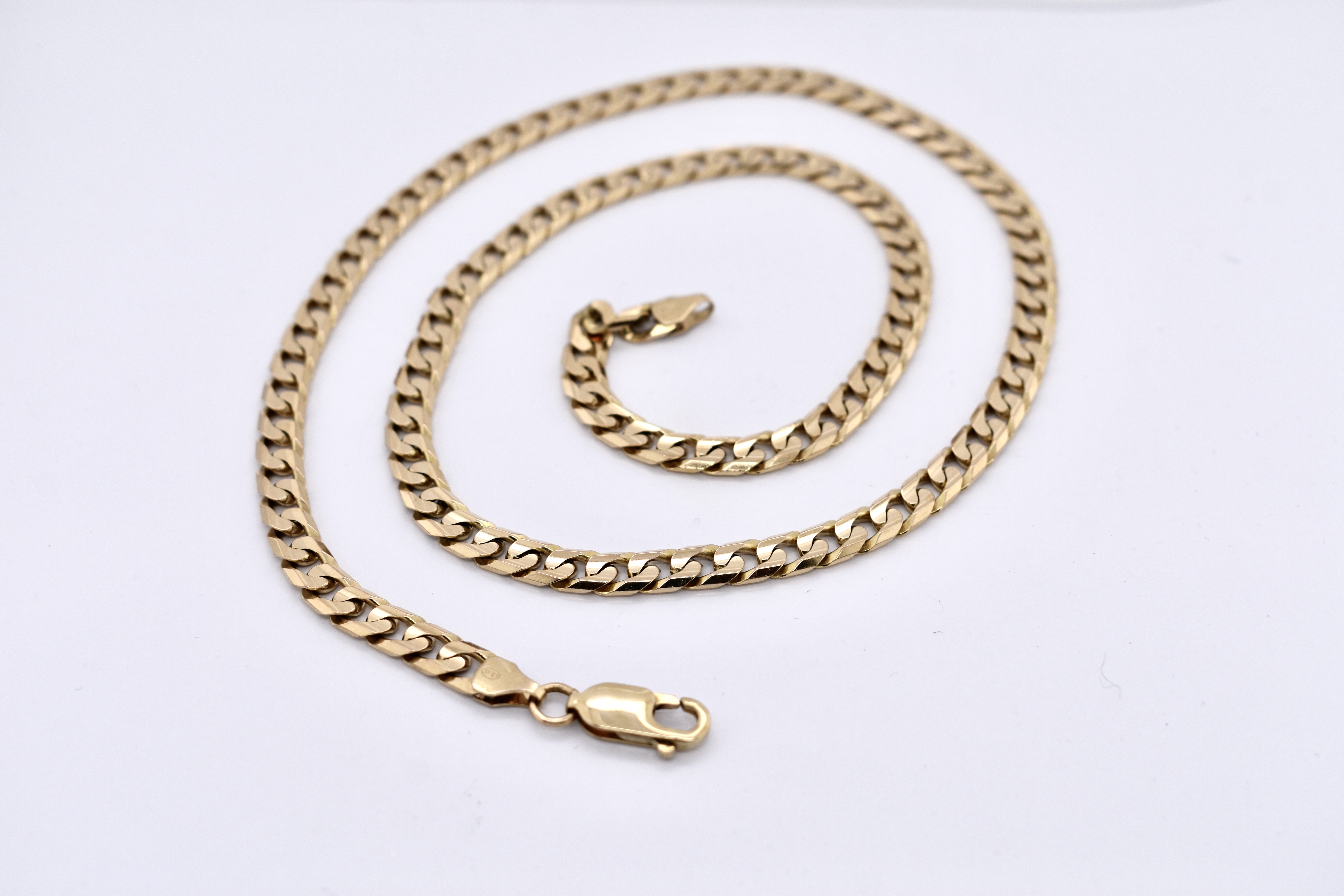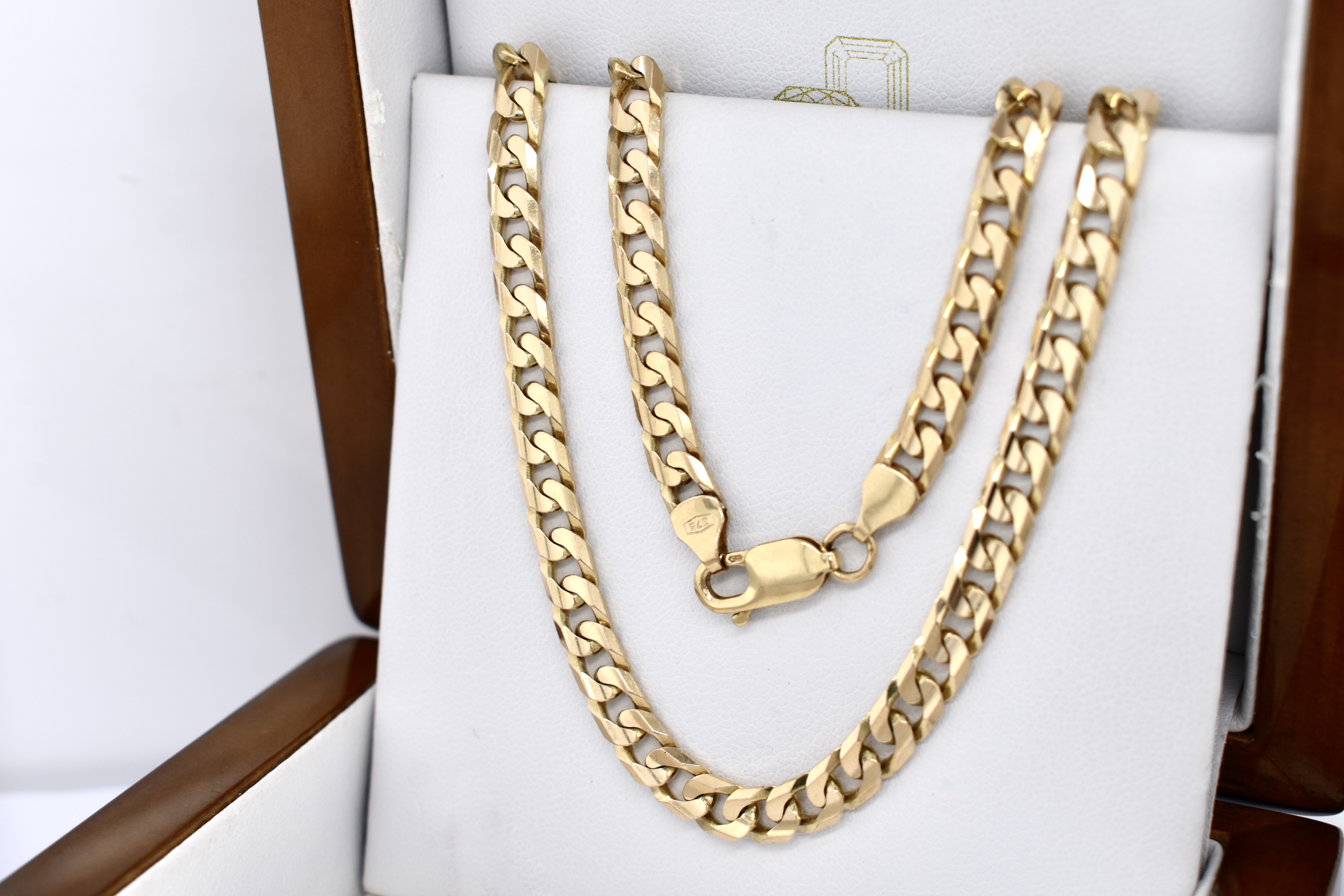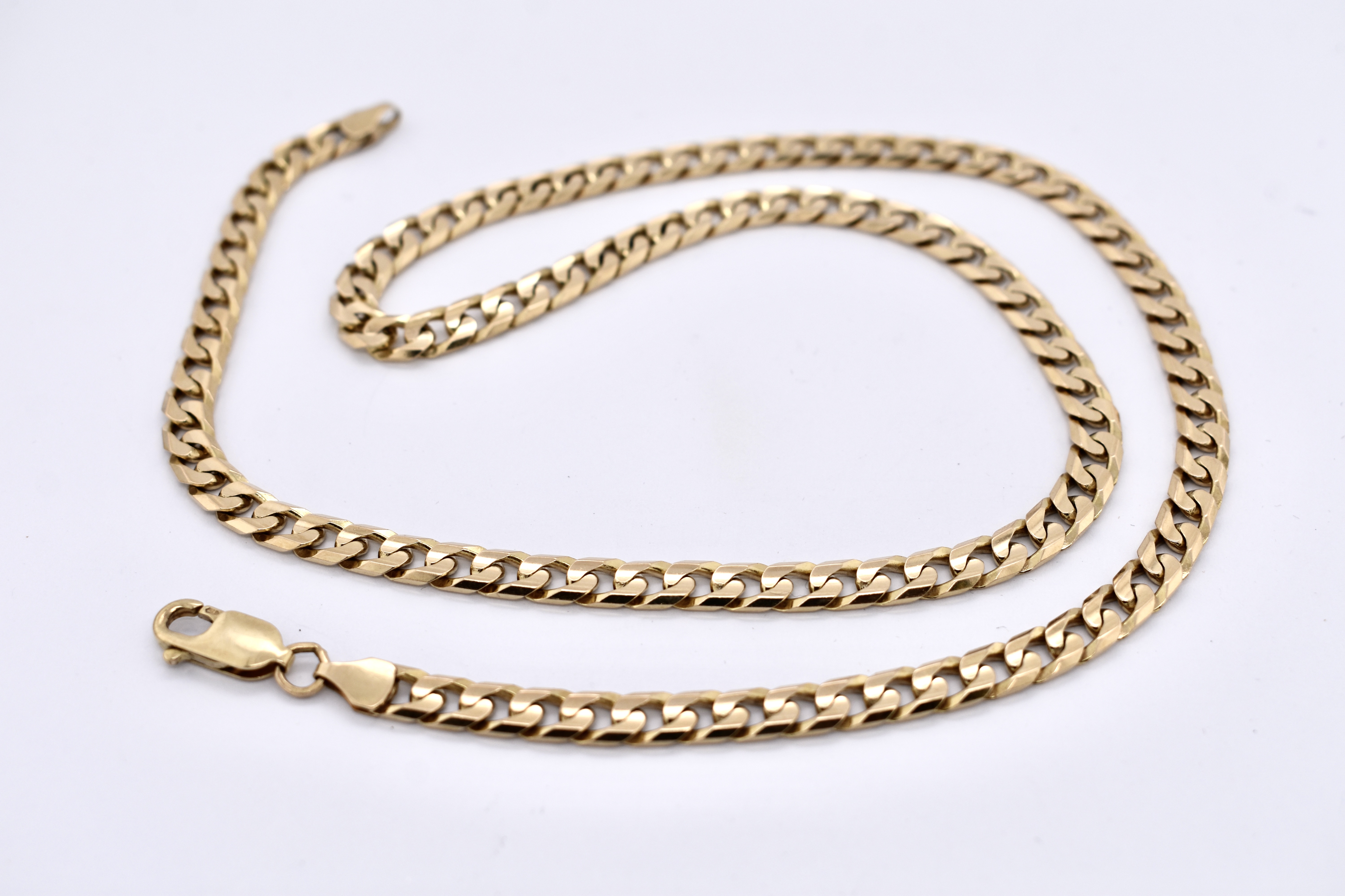 This lovely vintage solid 9ct yellow gold chain features 6mm wide flat curb links and is secured with a parrot clasp. The total chain length is 50cm and weight is 24.20 grams.