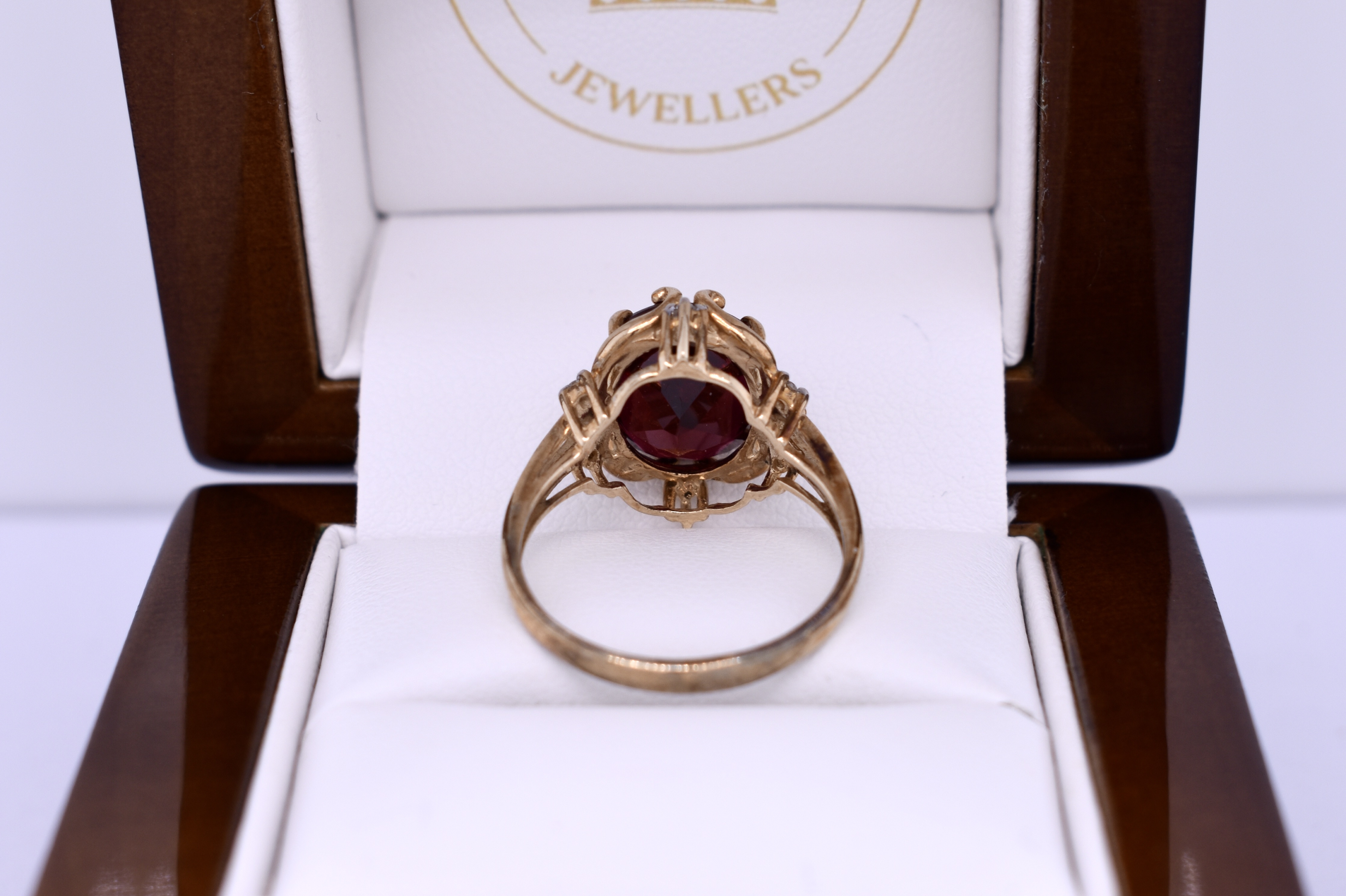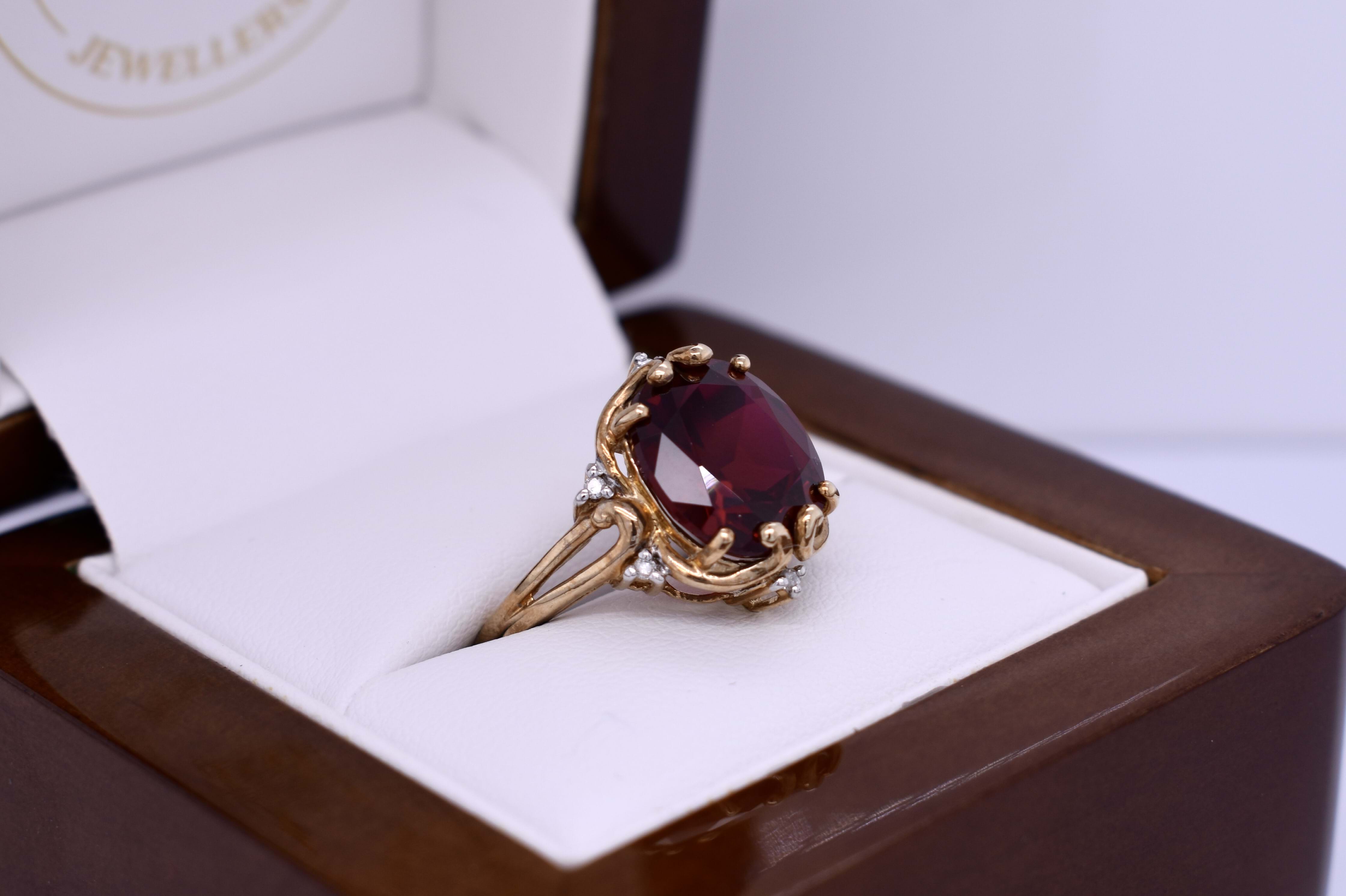 This appealing vintage ring features an oval red synthetic stone measuring 12x10mm, six claw set into the 9ct yellow gold scalloped surround. The ring is complimented with 6 small diamond accents and is finished on a split shoulder band. Finger size O.