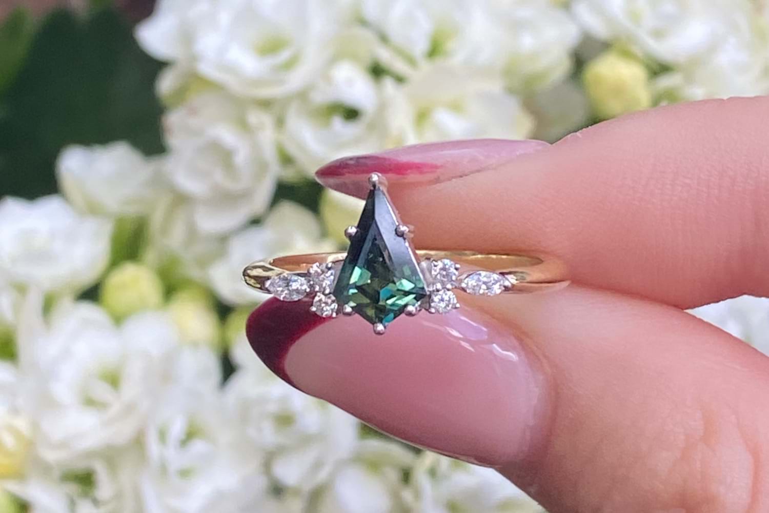 9ct Yellow Gold 0.65ct Shield Shaped Aus Teal Sapphire & 0.17ct Diamond Ring (M+)