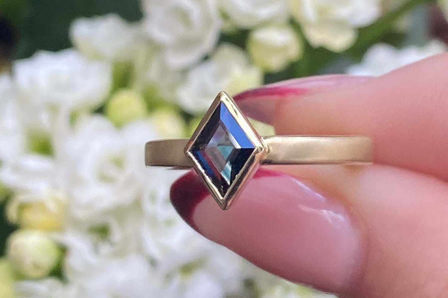 9ct Yellow Gold 0.91ct Diamond Shaped Blue Aus Parti Sapphire Bezel Set Ring (N+)
