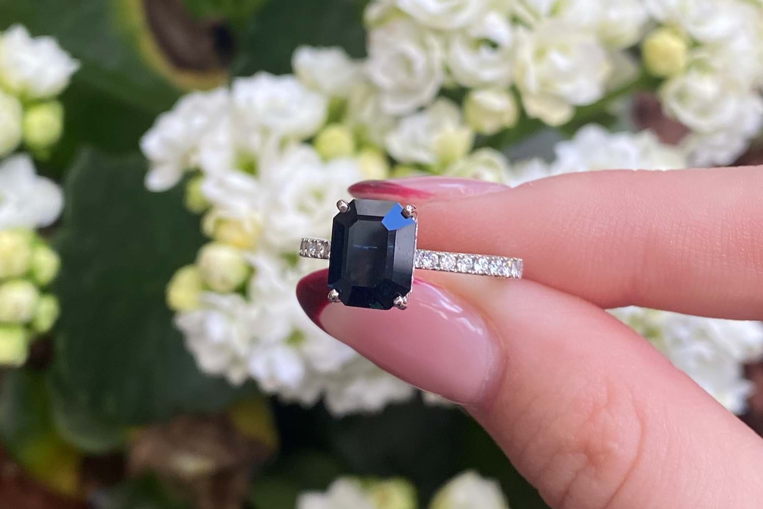 18ct White Gold 1.63ct African Blue Emerald Cut Sapphire & 0.50ct Diamond Ring (M+)