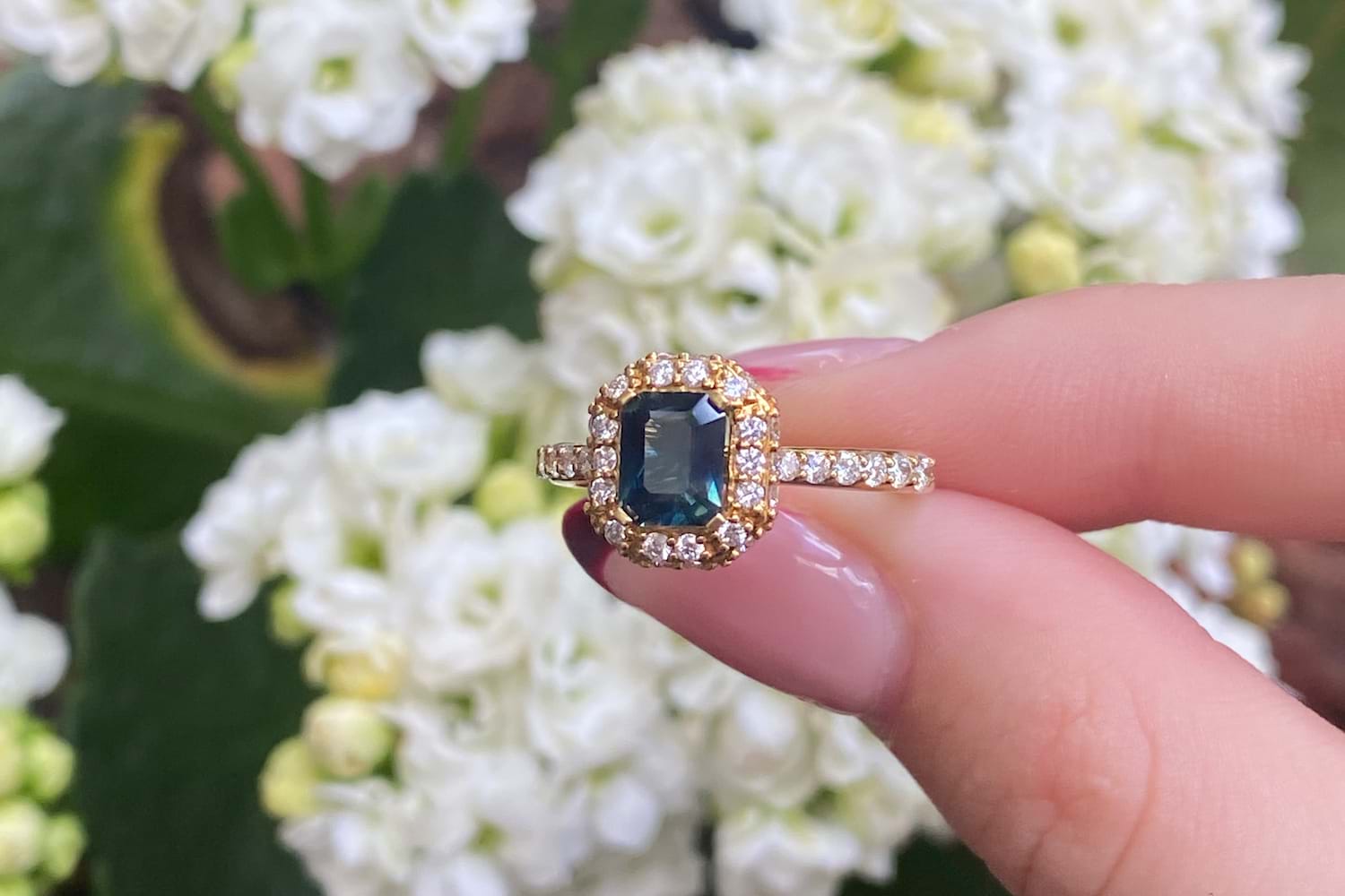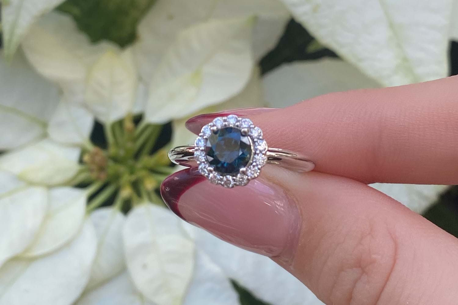 18ct White Gold 1.12ct Teal Aus Sapphire & 0.37ct Diamond Ring with Hidden Halo (M)