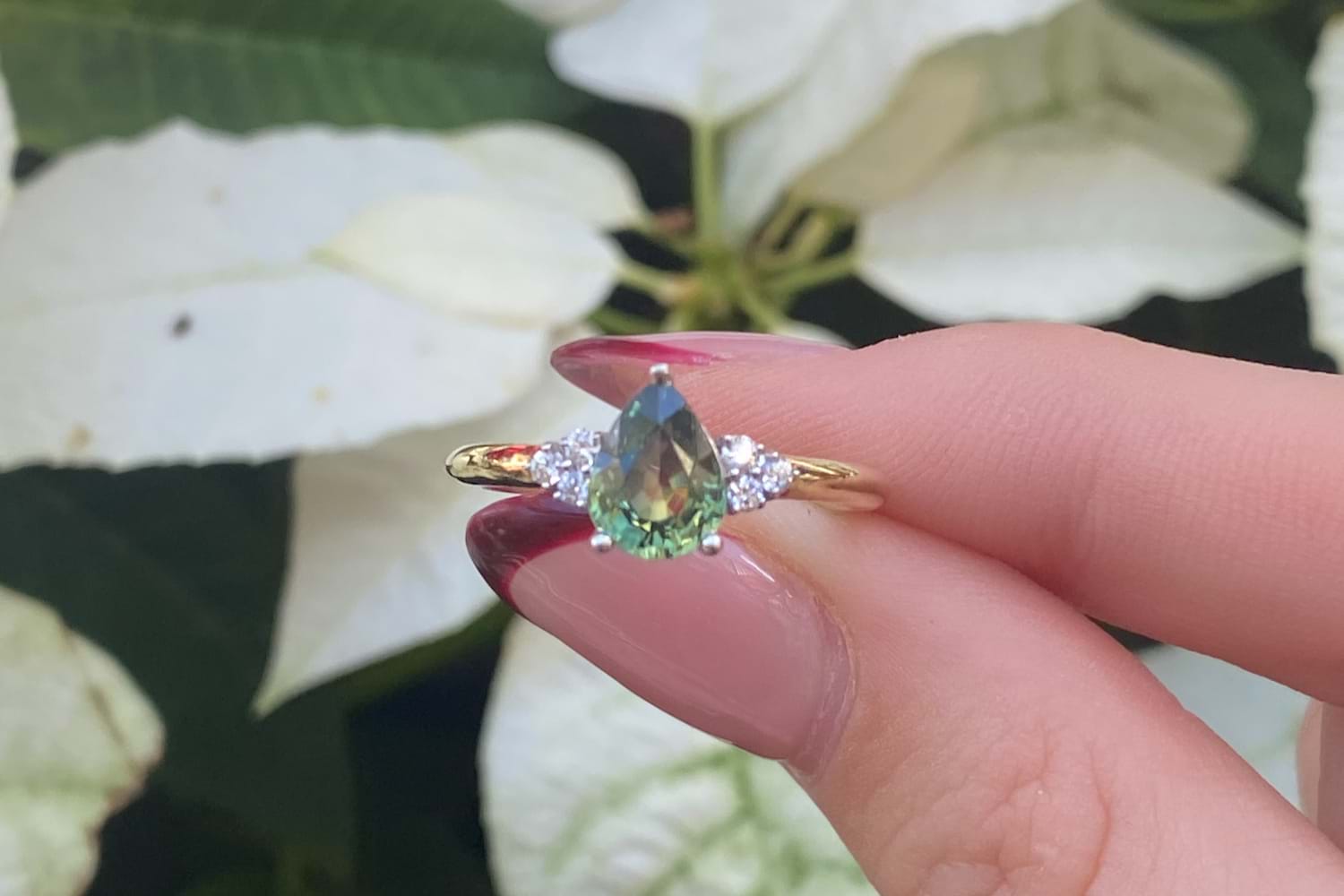 9ct Yellow Gold 1.32ct Pear Shaped Aus Green Parti Sapphire & 0.08ct Diamond Ring (M+)