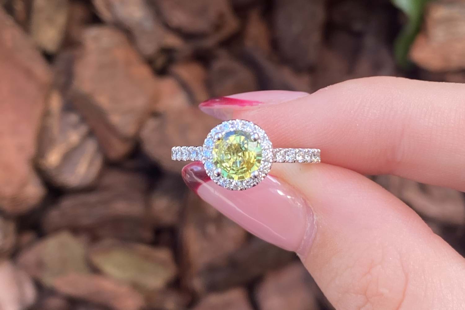 18ct White Gold 1.10ct Yellow/Green Aus Parti Sapphire & 0.17ct Diamond Ring (L+)