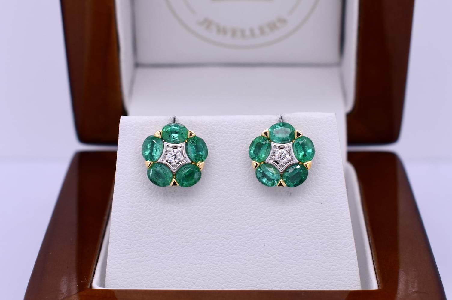 18ct Yellow & White Gold 1.75ct Emerald & 0.06ct Diamond Flower Studs