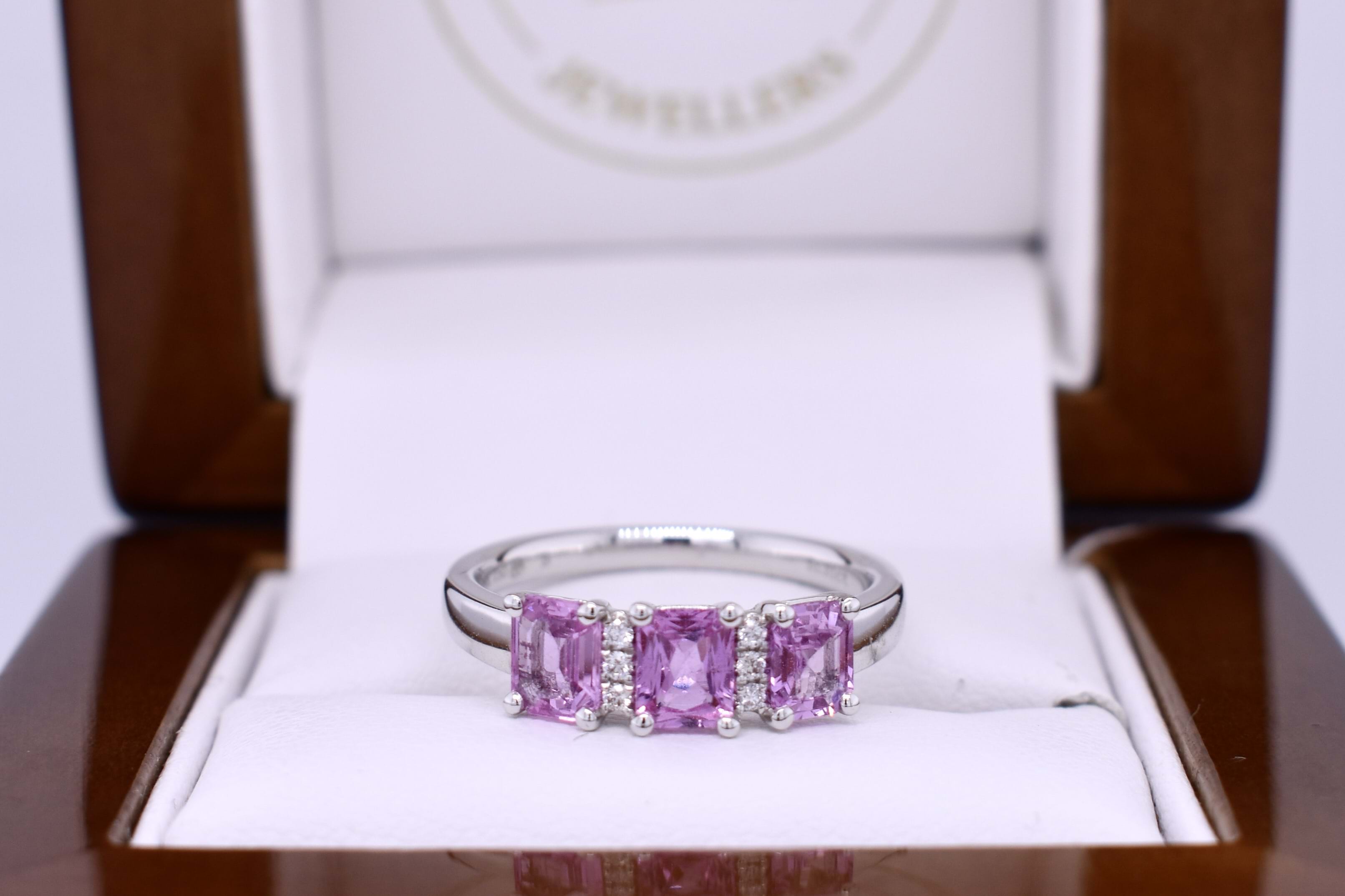 18ct White Gold 1.31ct Pink Sapphire Trilogy & 0.04ct Diamond Ring (M+)