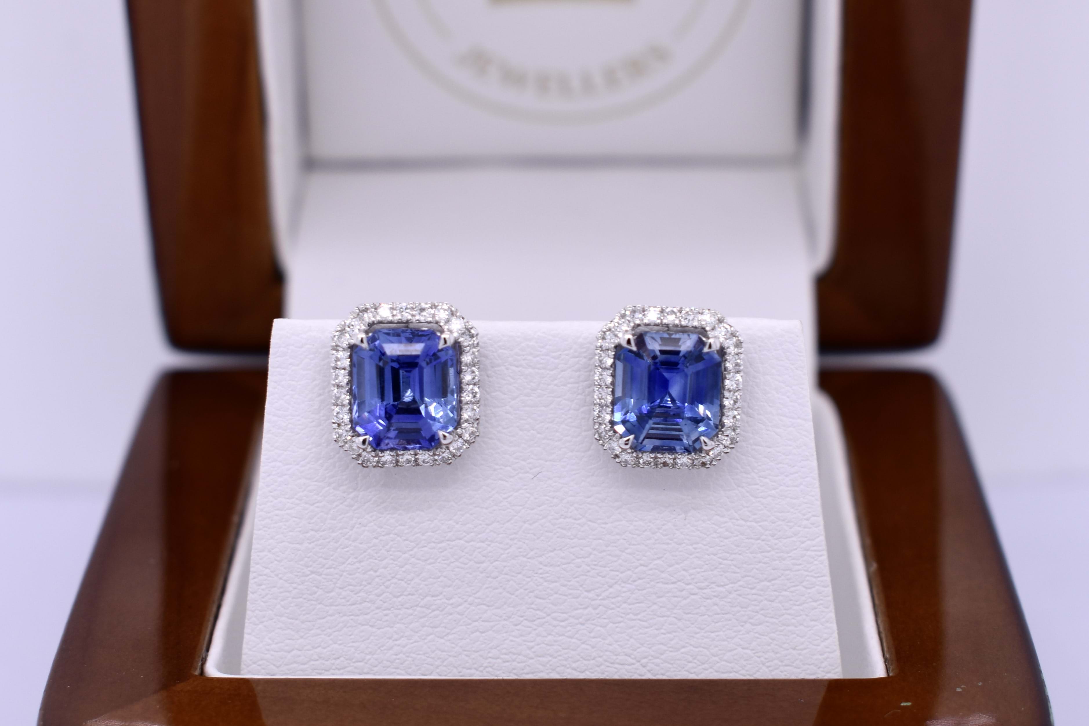 18ct White Gold 3.65ct Ceylon Sapphire Emerald Cut & 0.26ct Diamond Halo Studs