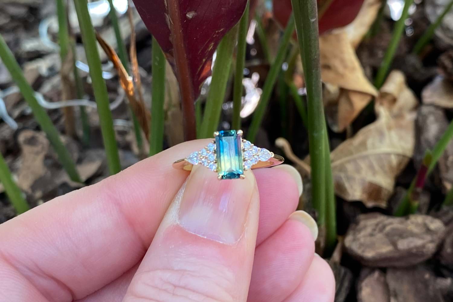 9ct Yellow Gold 1.22ct Emerald Cut Blue/Grey Sapphire & 0.27ct Diamond Ring (M)