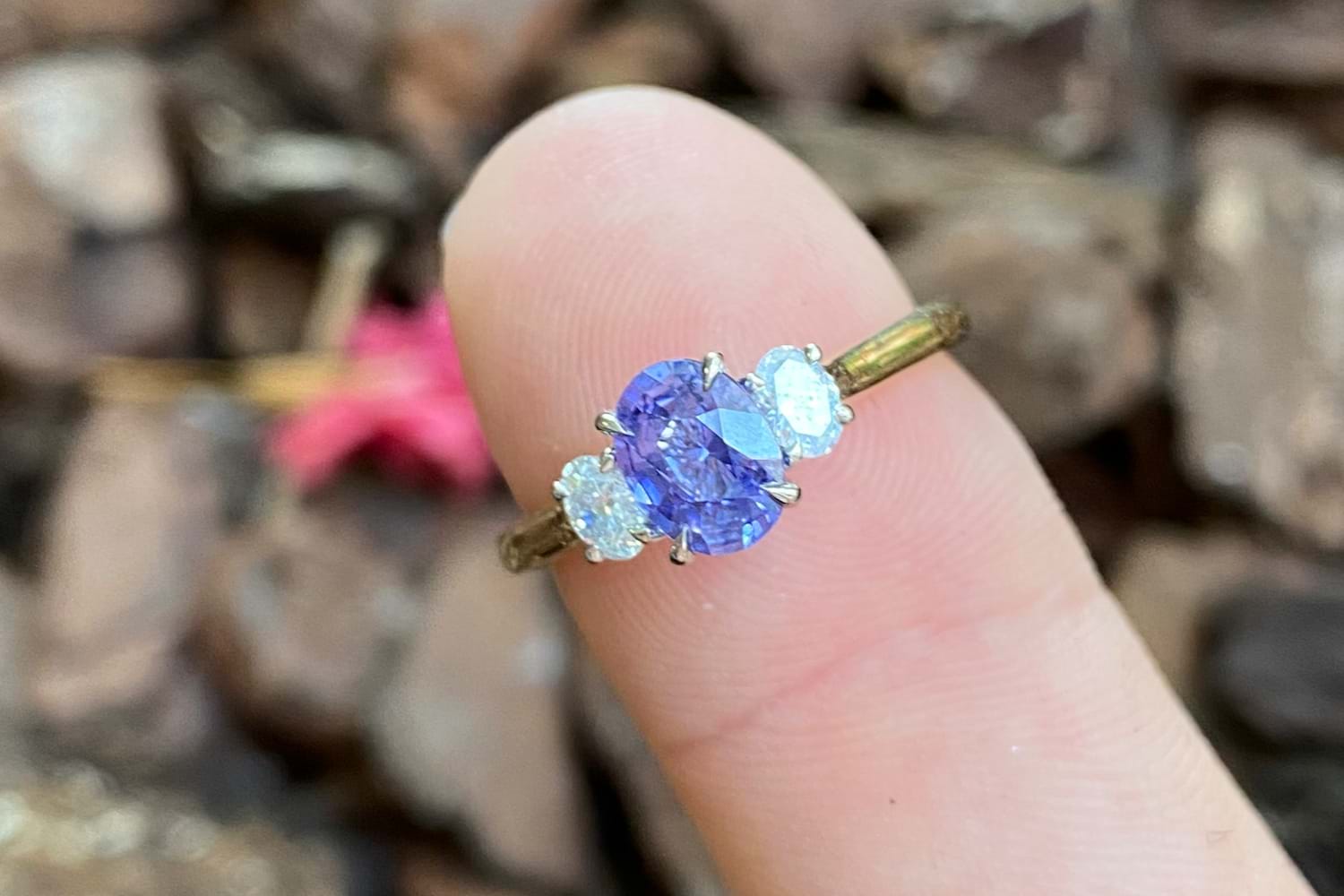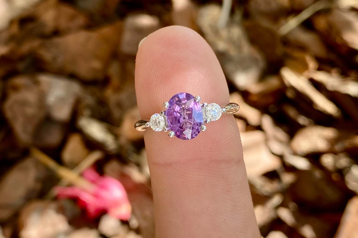 18ct White Gold 1.34ct Purple Ceylon Sapphire & 0.20ct Diamond Trilogy Ring (L)