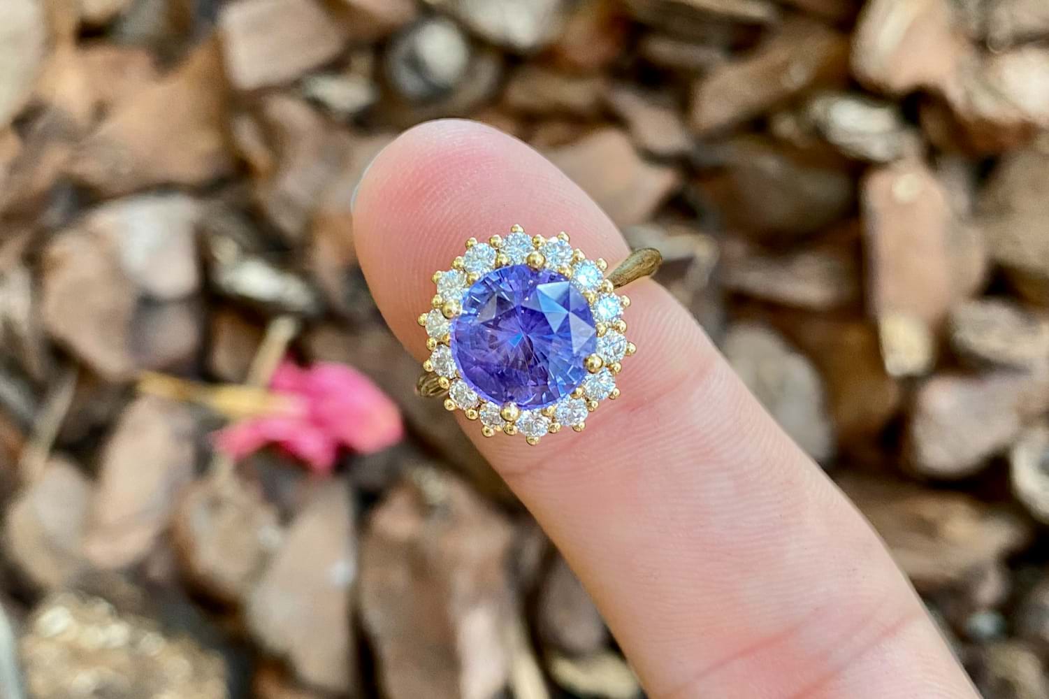 18ct Yellow Gold 3.89ct Bright Purple Sapphire & 0.61ct Diamond Cluster Halo Ring (M)
