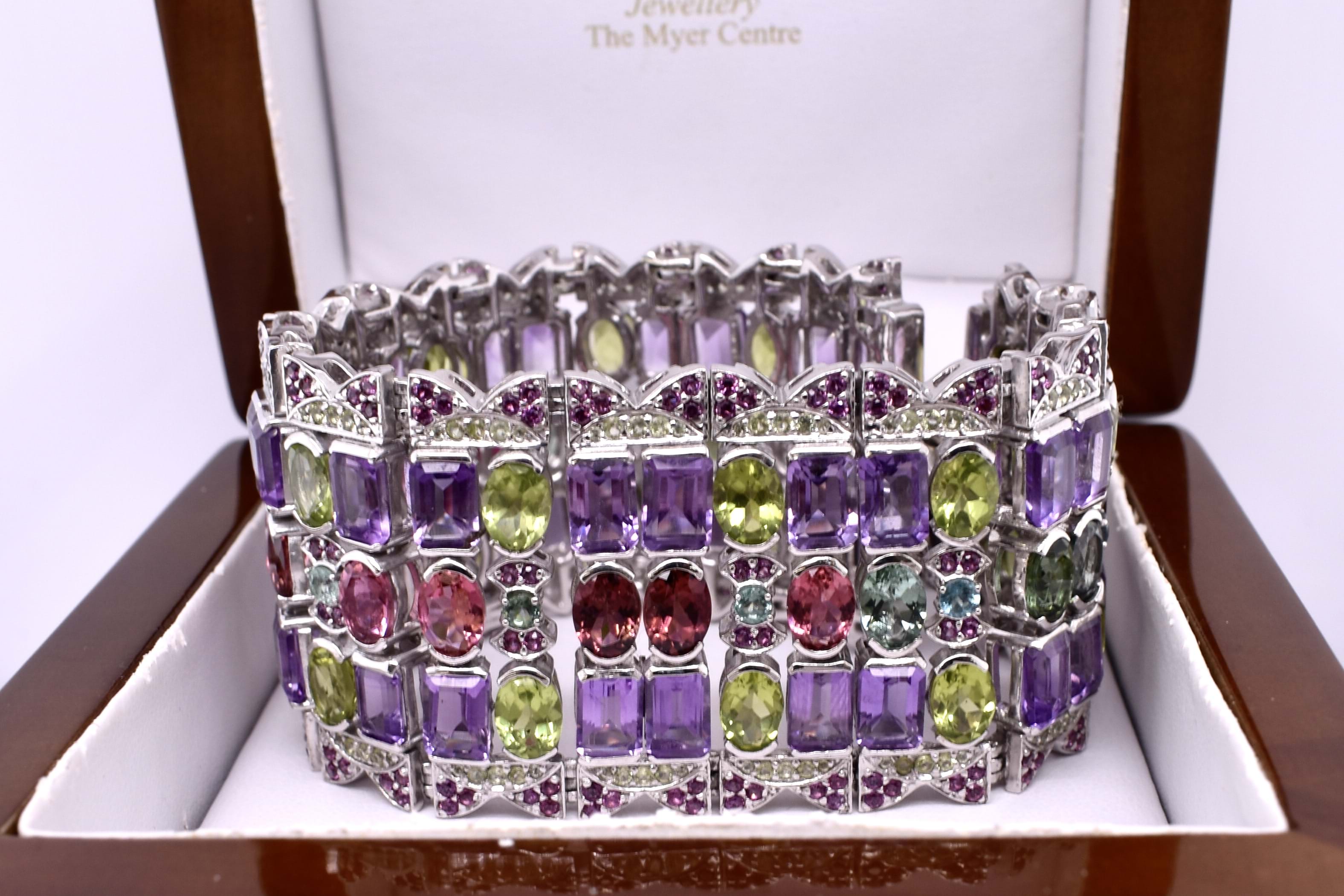 Sterling Silver Fancy Multi Gemstone 36mm Wide 18.5cm Bracelet