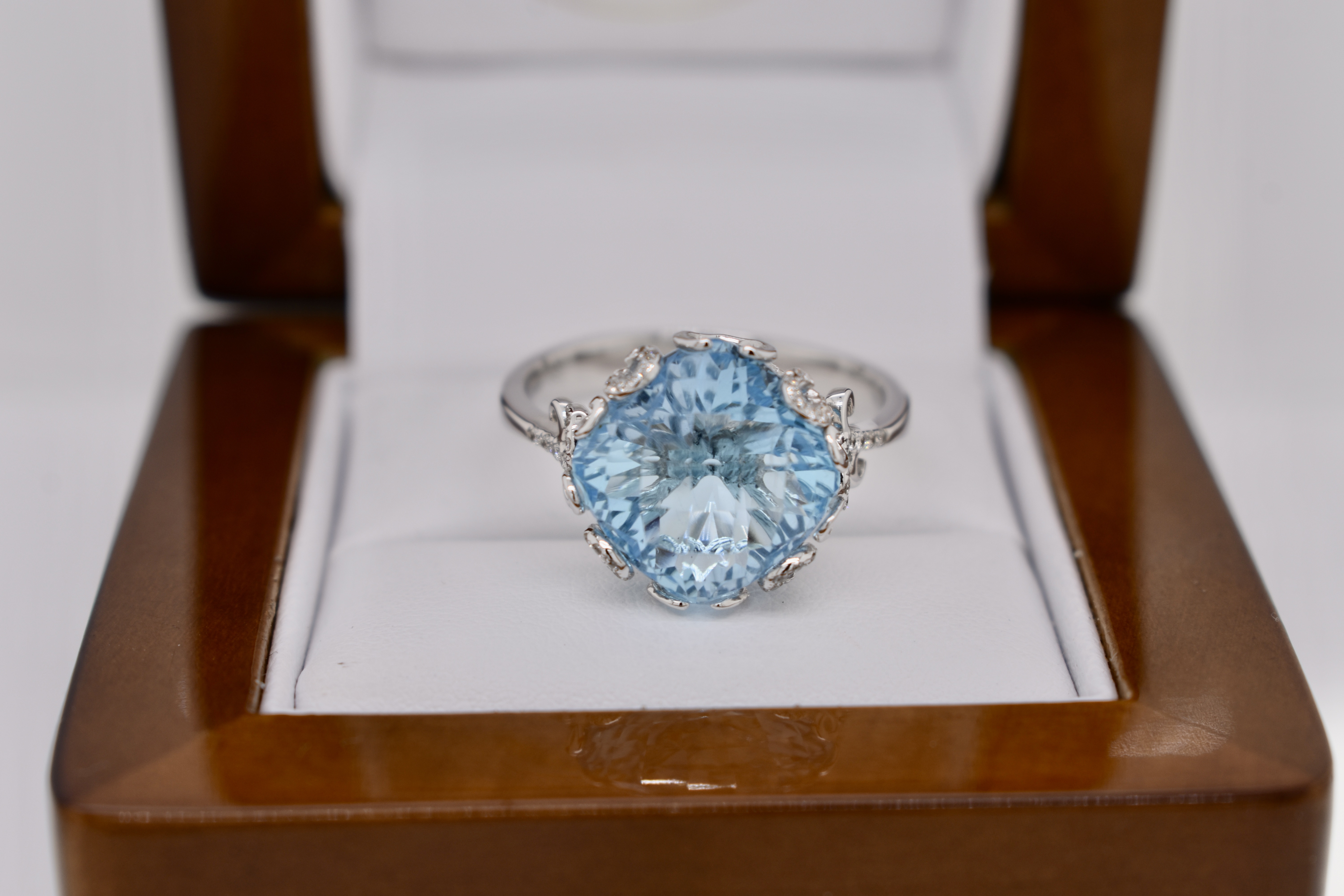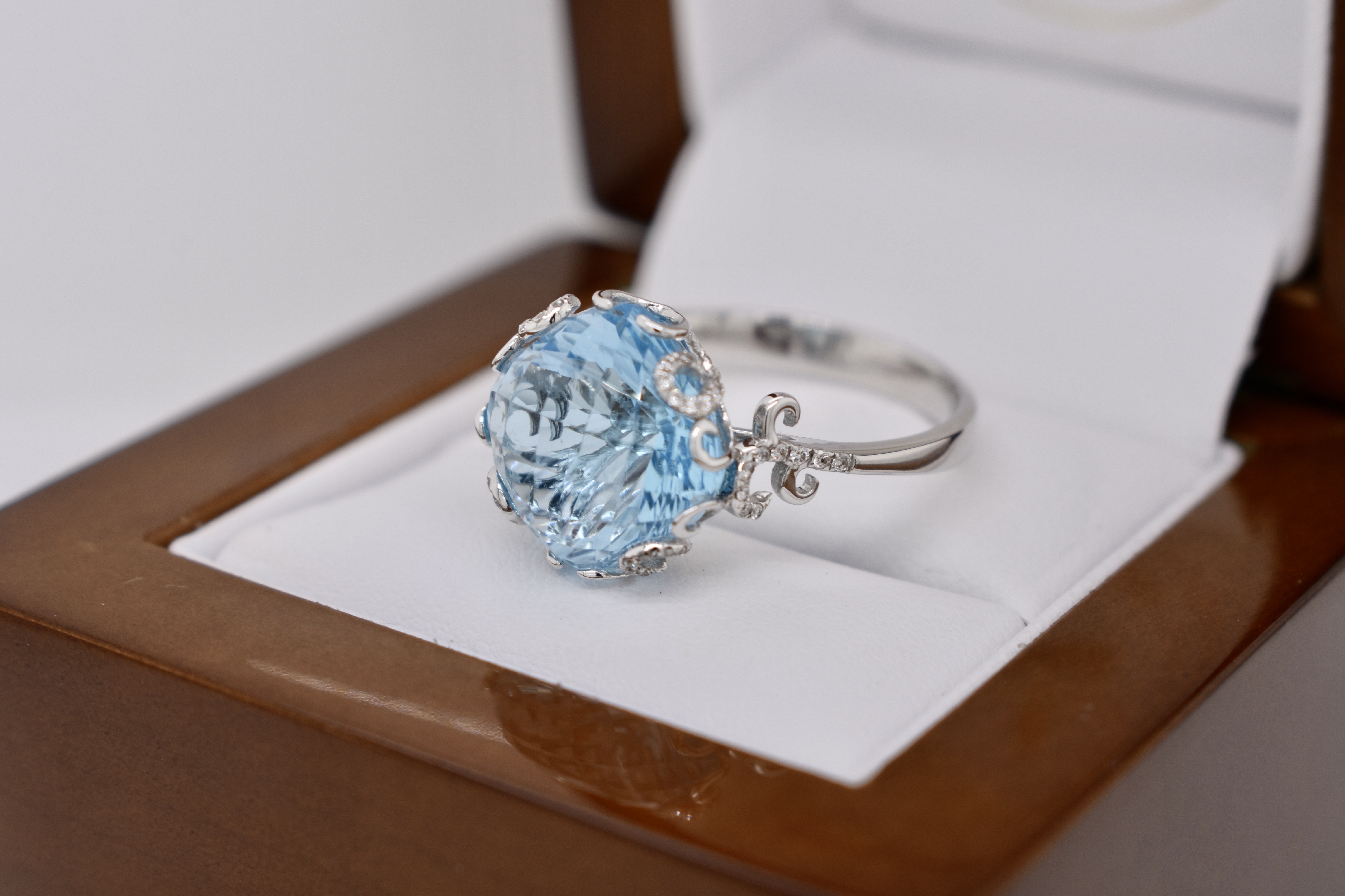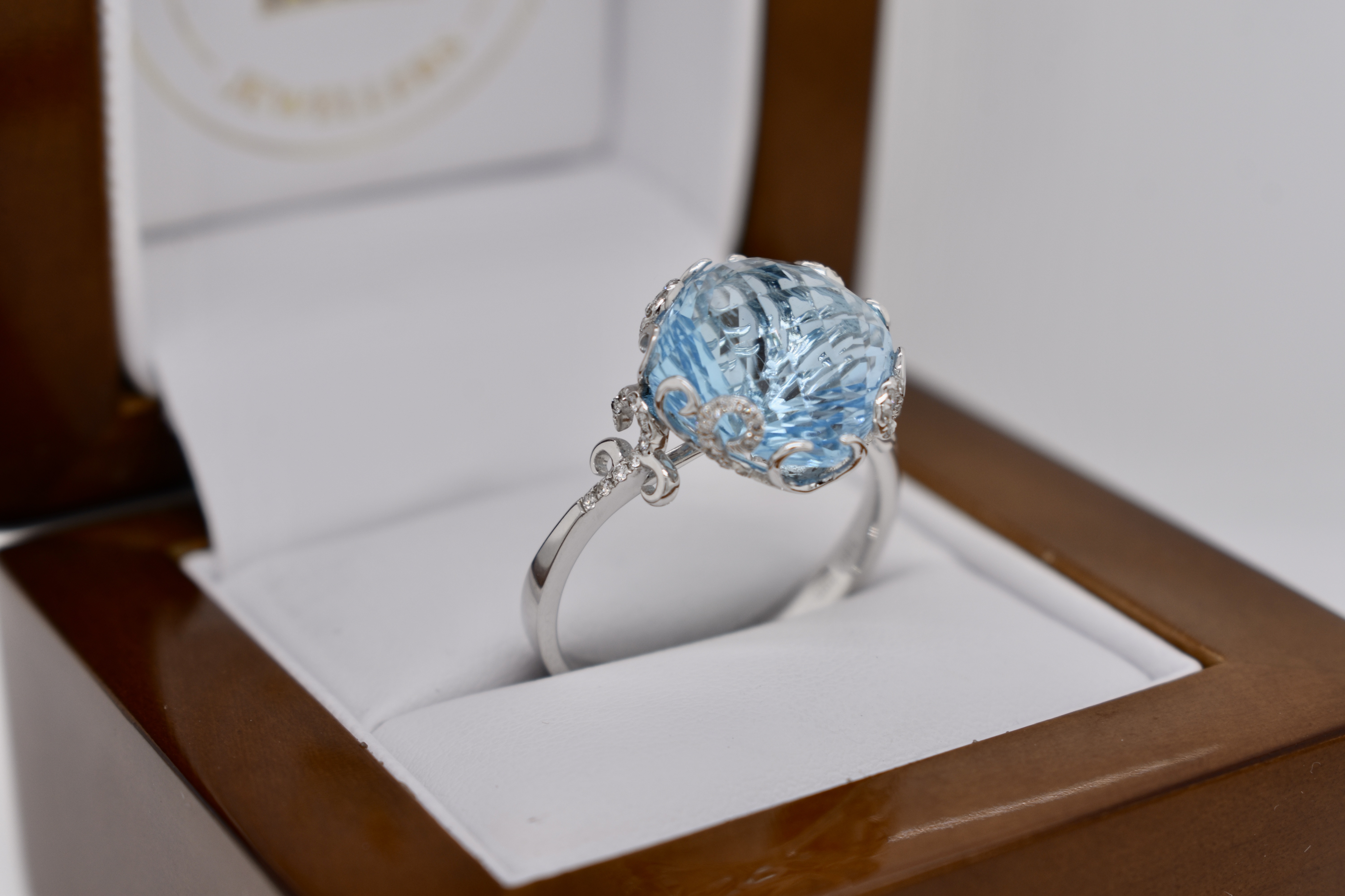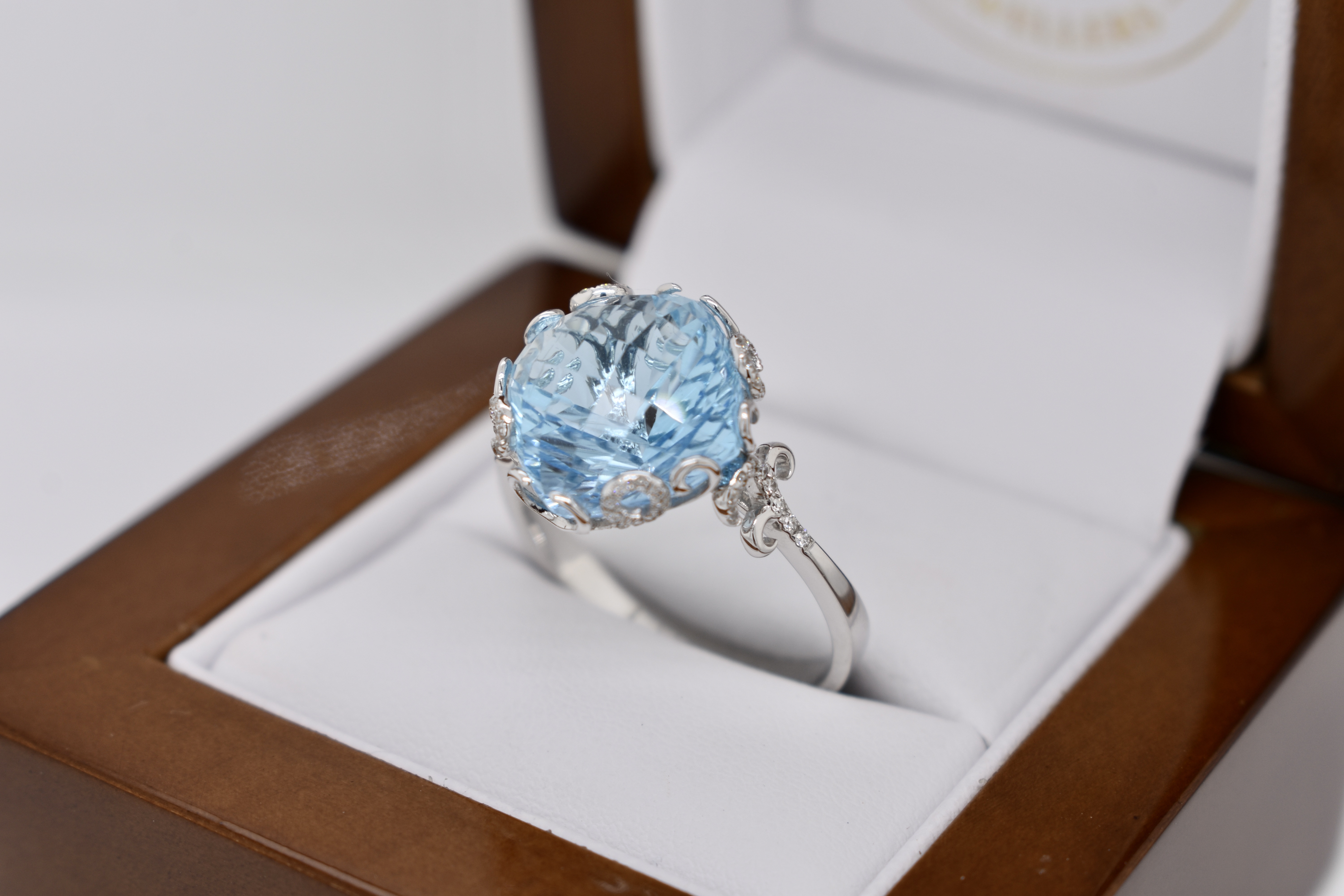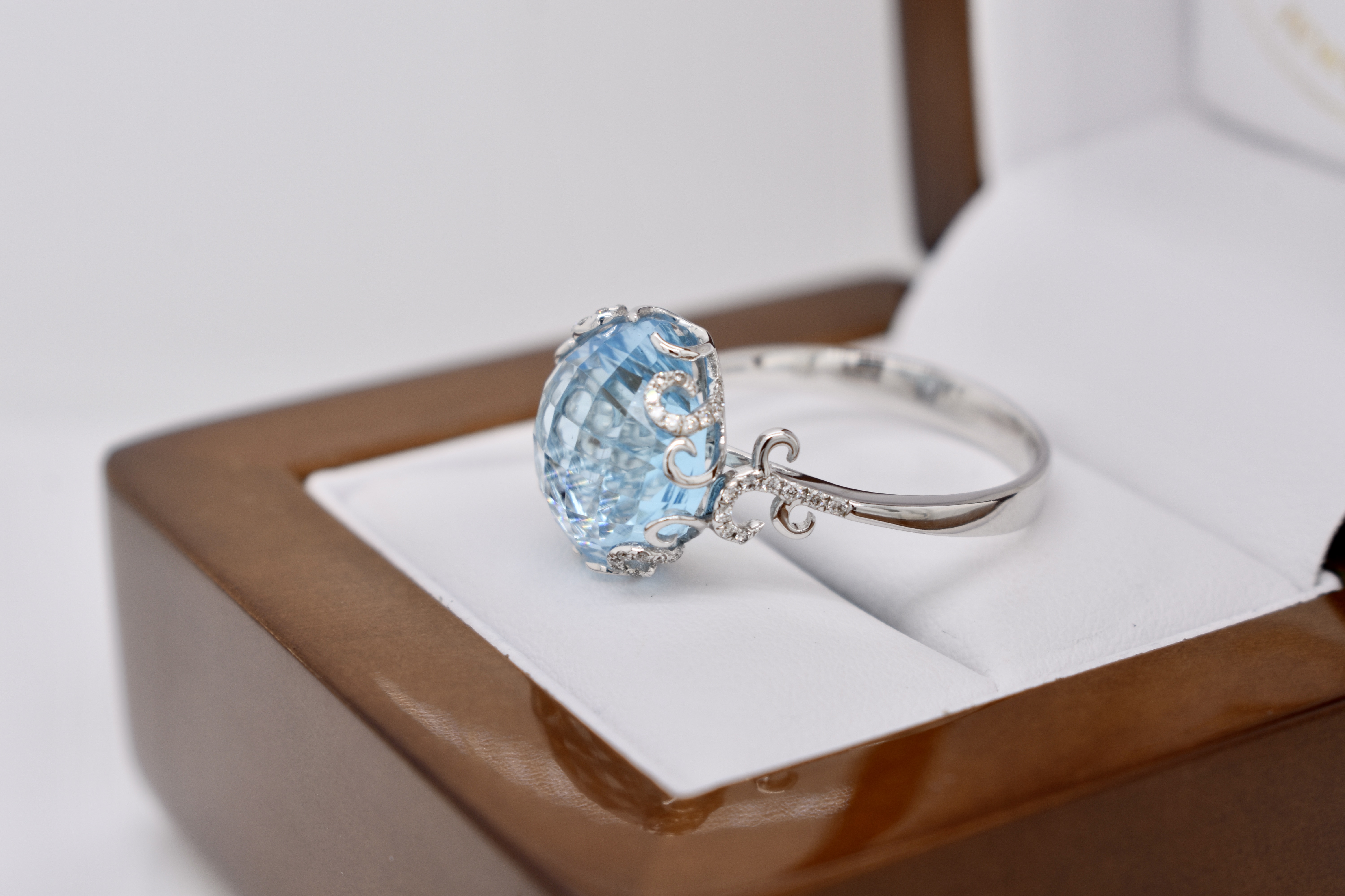 Crafted in 14ct white gold this striking cocktail ring features a cushion shape, multi-faceted, 10.37ct blue topaz set into a fancy scroll gallery with accents of shimmering diamonds totaling 0.21cts. Finger size T. Independent Valuation Supplied.