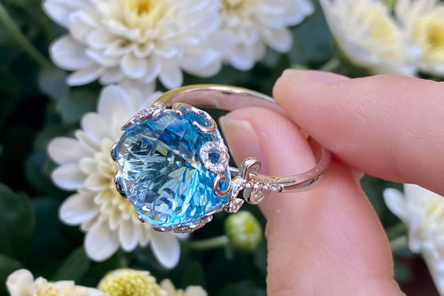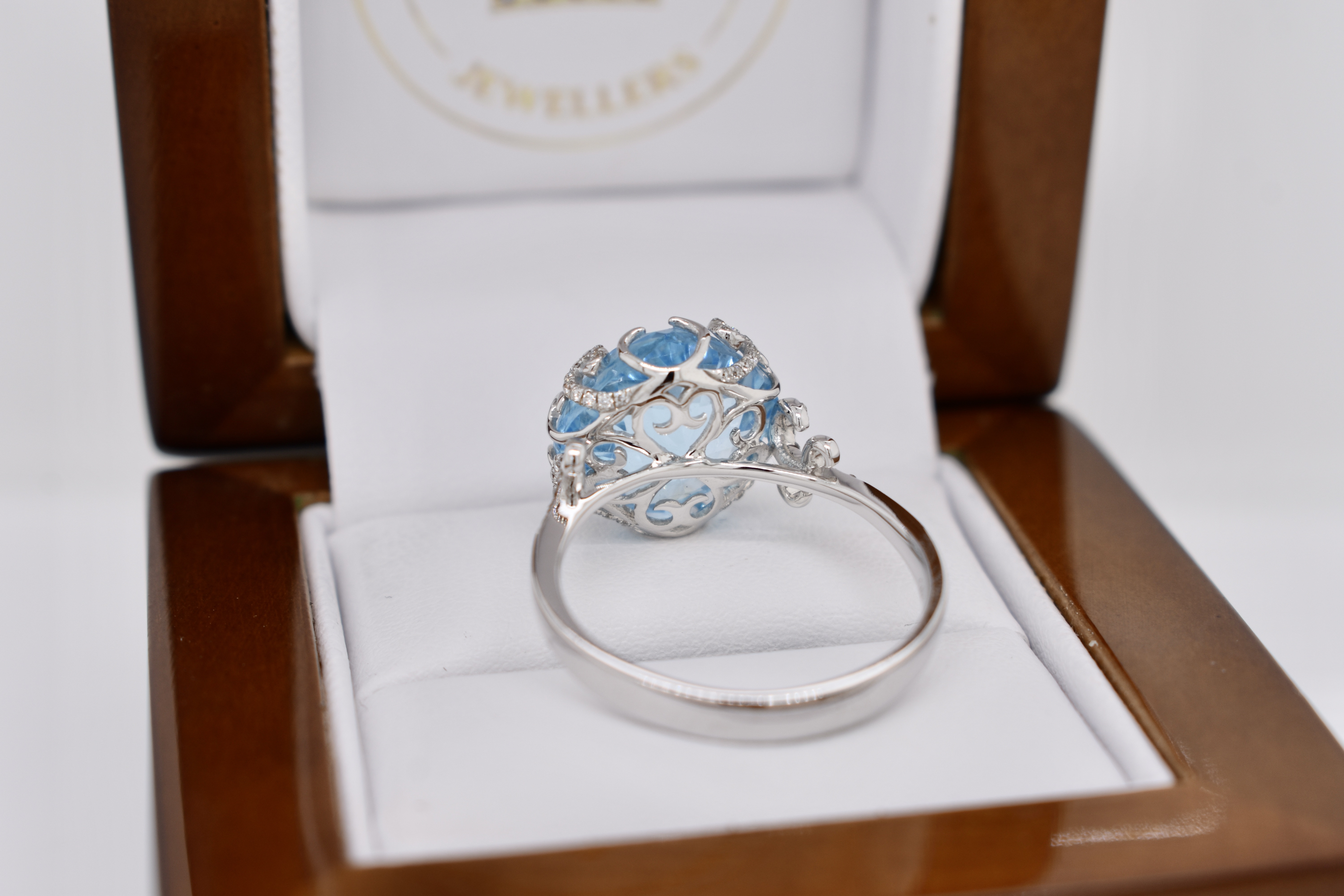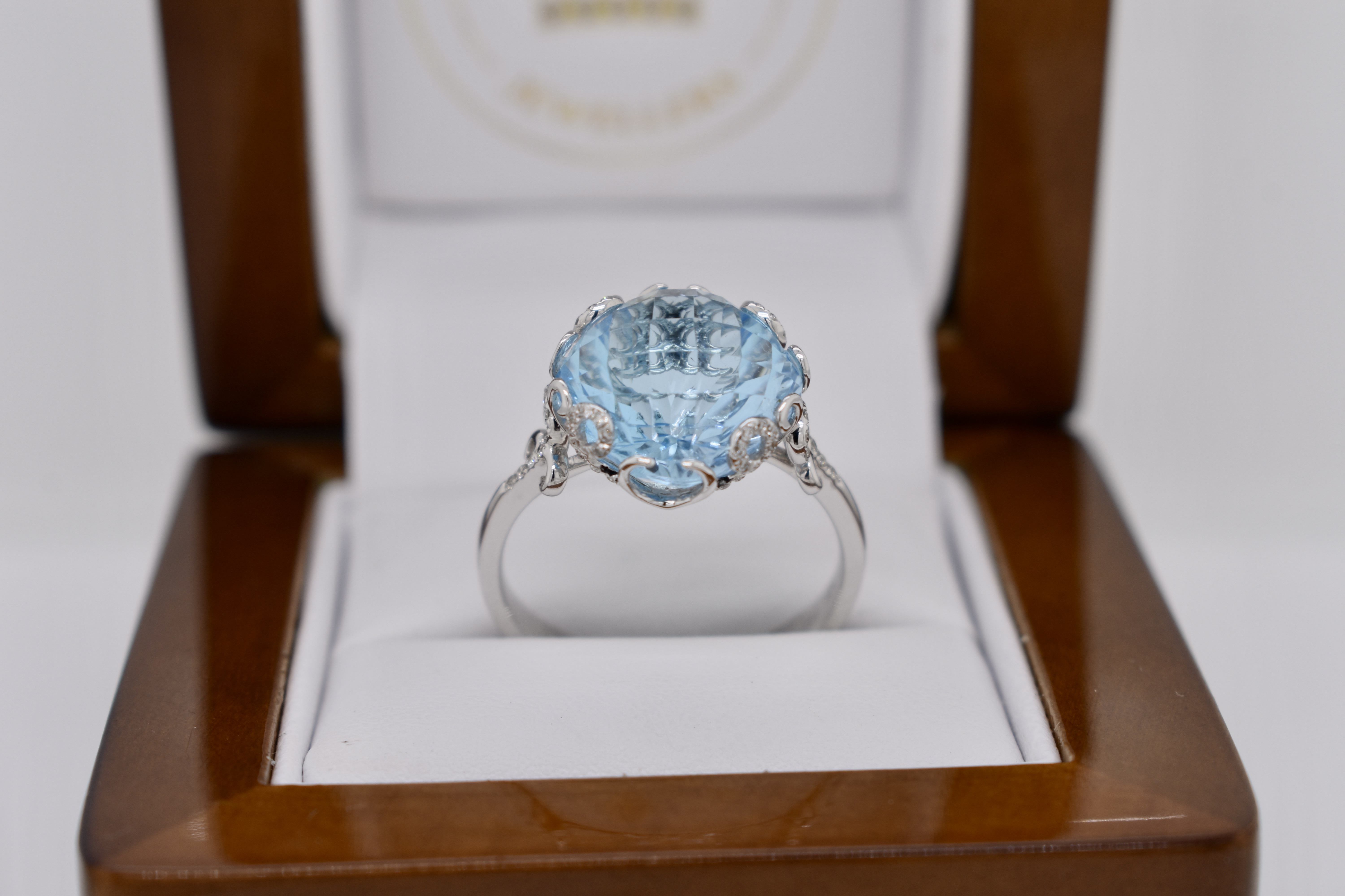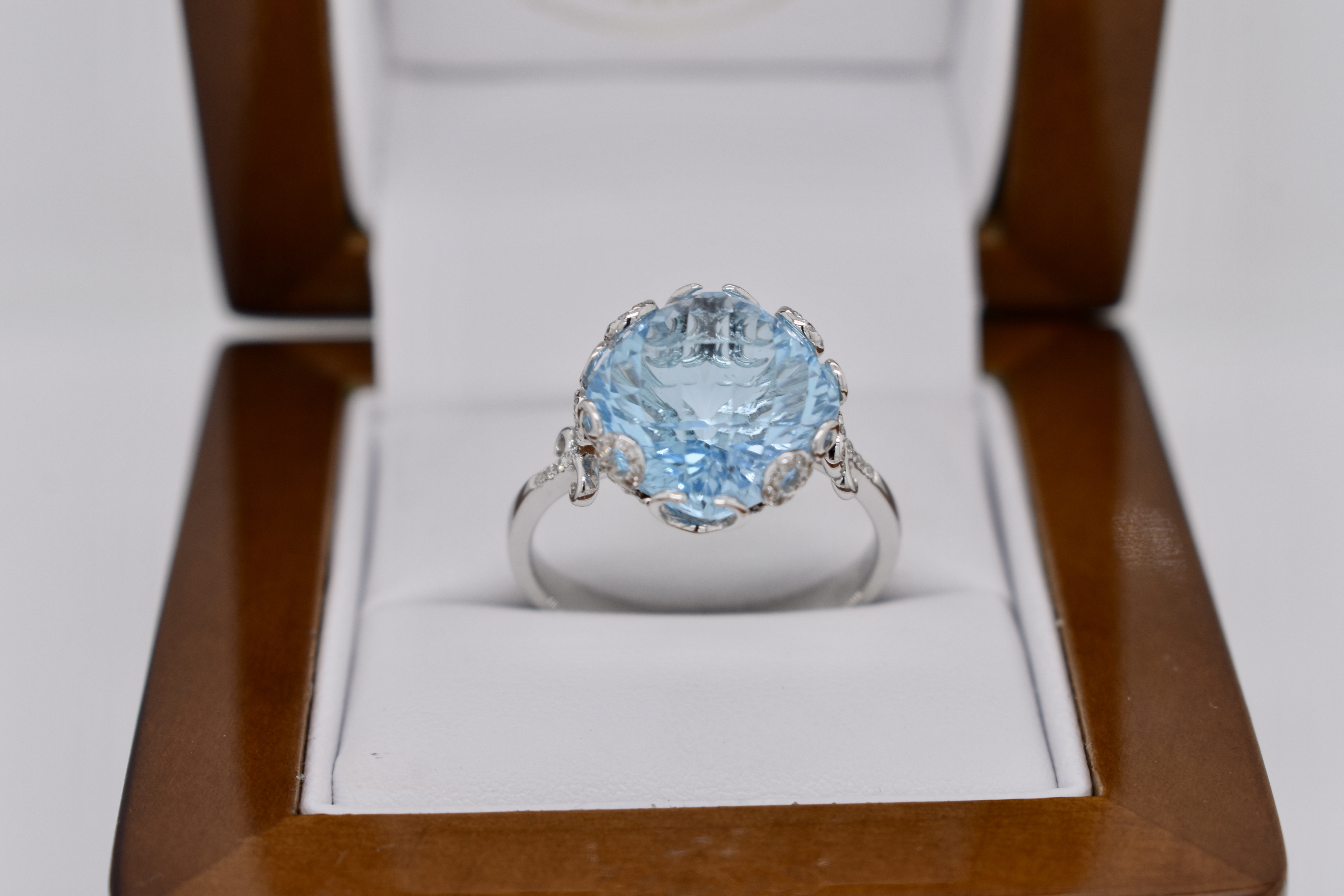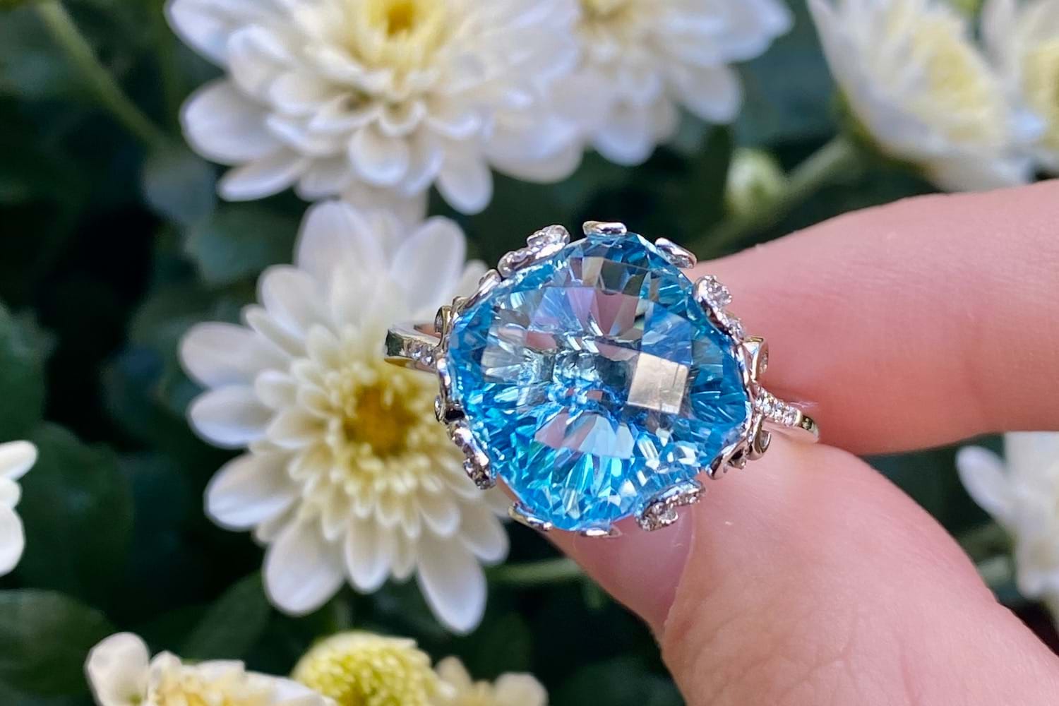 Crafted in 14ct white gold this striking cocktail ring features a cushion shape, multi-faceted, 10.37ct blue topaz set into a fancy scroll gallery with accents of shimmering diamonds totaling 0.21cts. Finger size T. Independent Valuation Supplied.