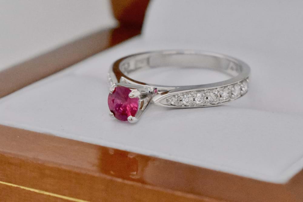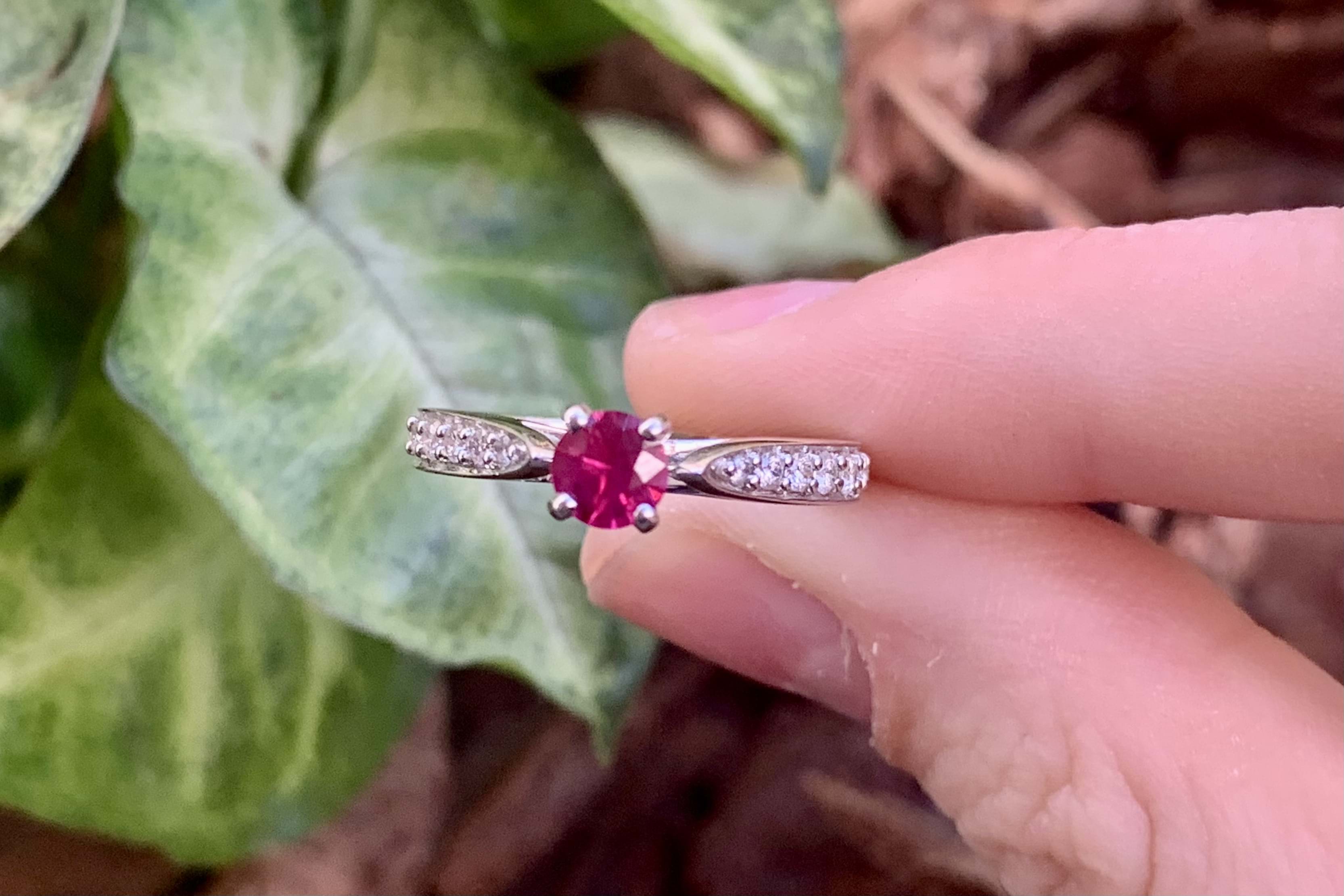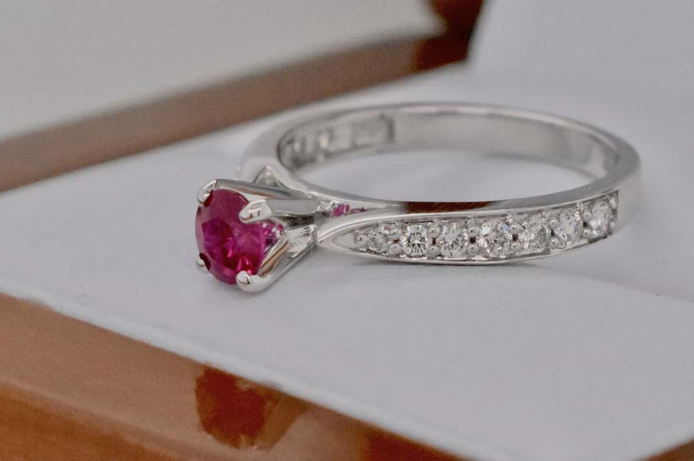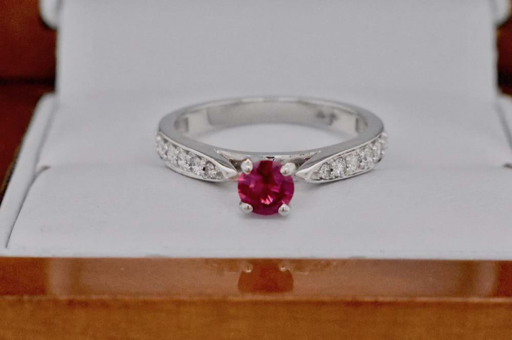 Very elegant natural Ruby and Diamond ring. The ring is set with one round .35ct Ruby, grain set on each shoulder are 7 round brilliant cut diamonds totalling .25ct (G/VS) and they are of a superb white quality. Finger size M