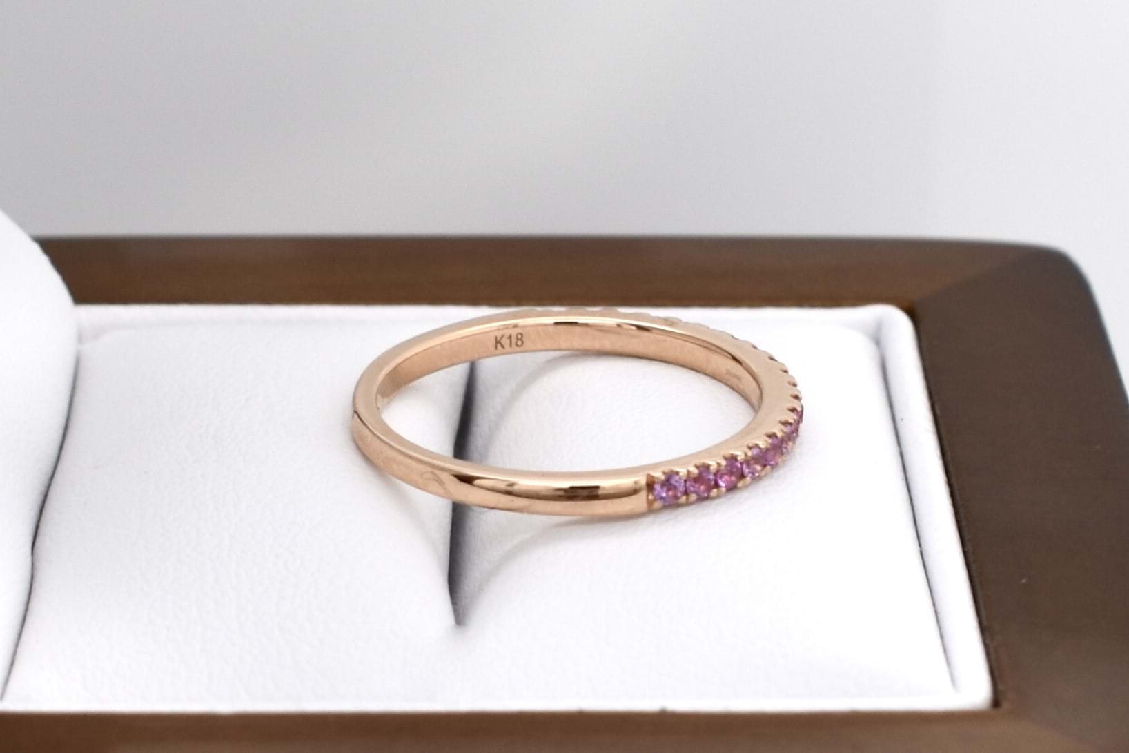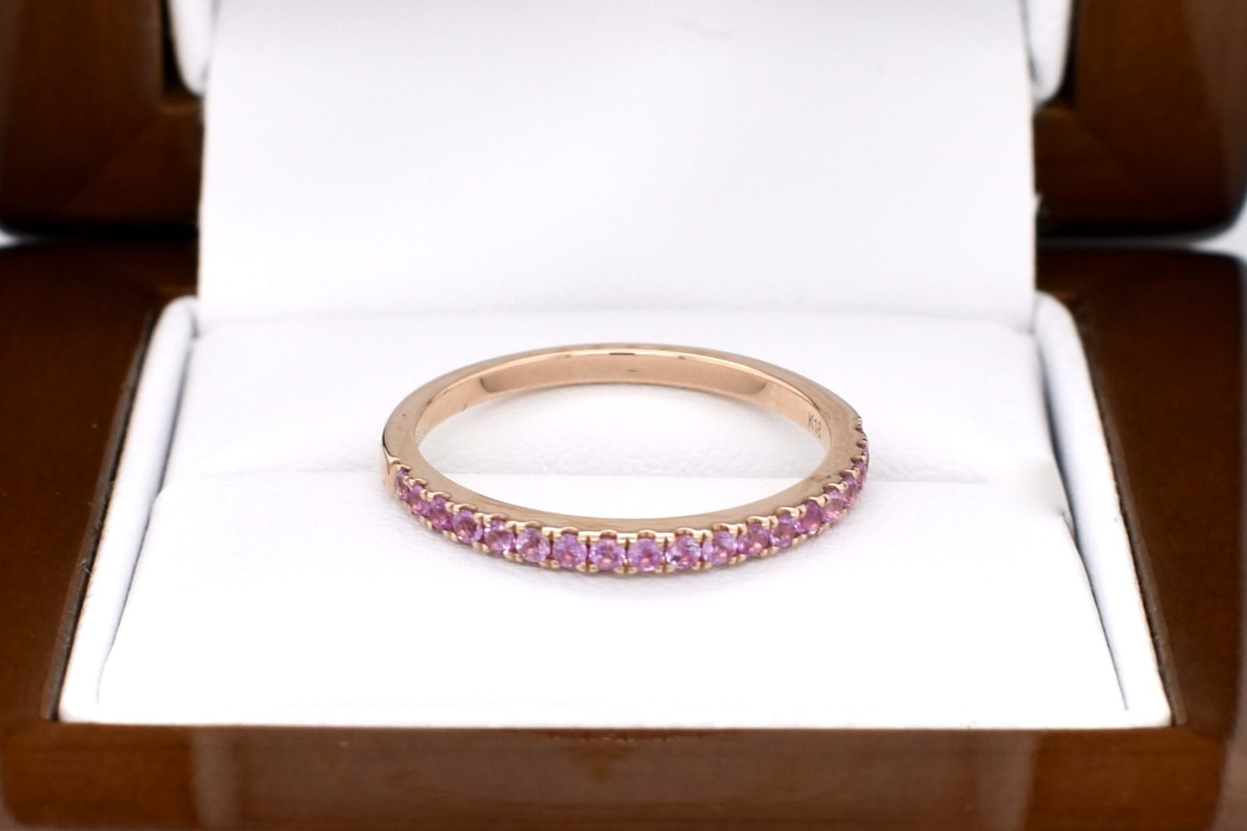 This beautiful 18ct rose gold band features a total of nineteen brilliant cut pink sapphires, cut down claw set, in a 1.58mm soft edge flat band. Total mid-light pink sapphire content equals 0.30cts. Perfect as a wedding band, eternity band or high quality stacking ring. Finger size M. Independent Valuation Supplied