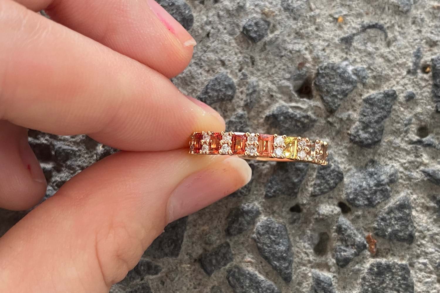 Featuring seven baguette cut sapphires in a range of varying tones from orange to yellow to green totalling 0.84cts and alternately set with sparkling round brilliant cut diamonds totalling 0.25cts (H/P1). Independent Valuation Supplied. Finger size N