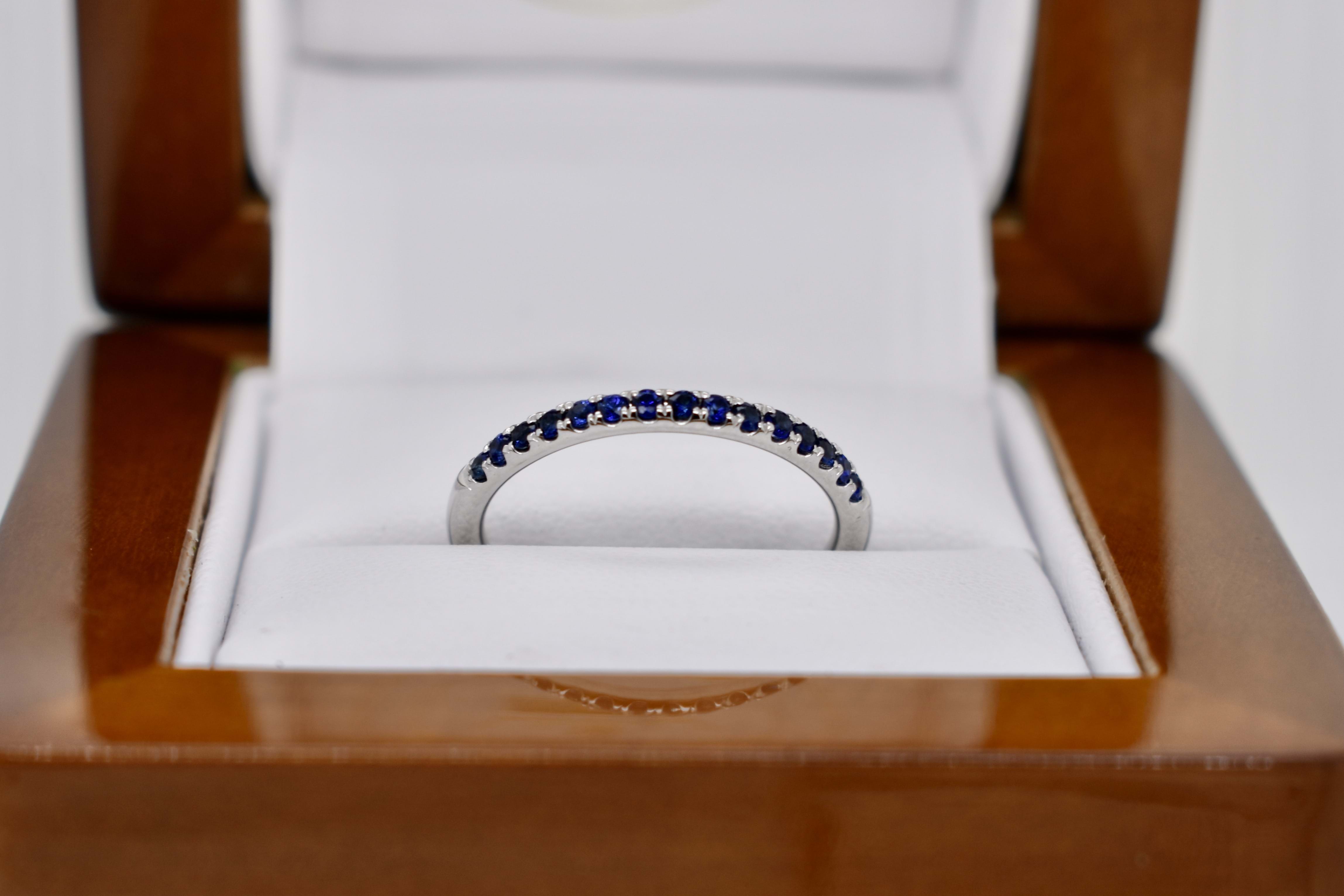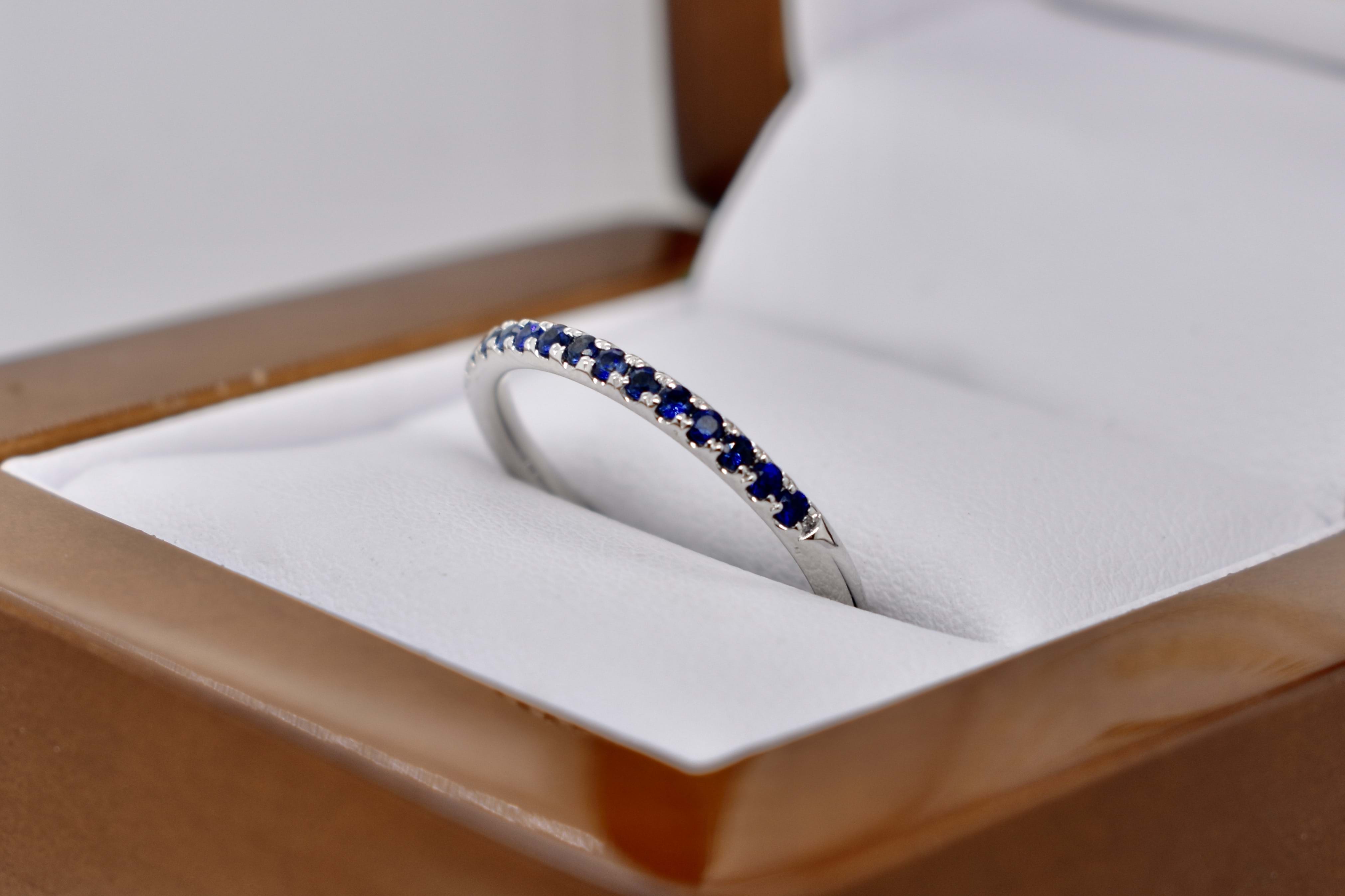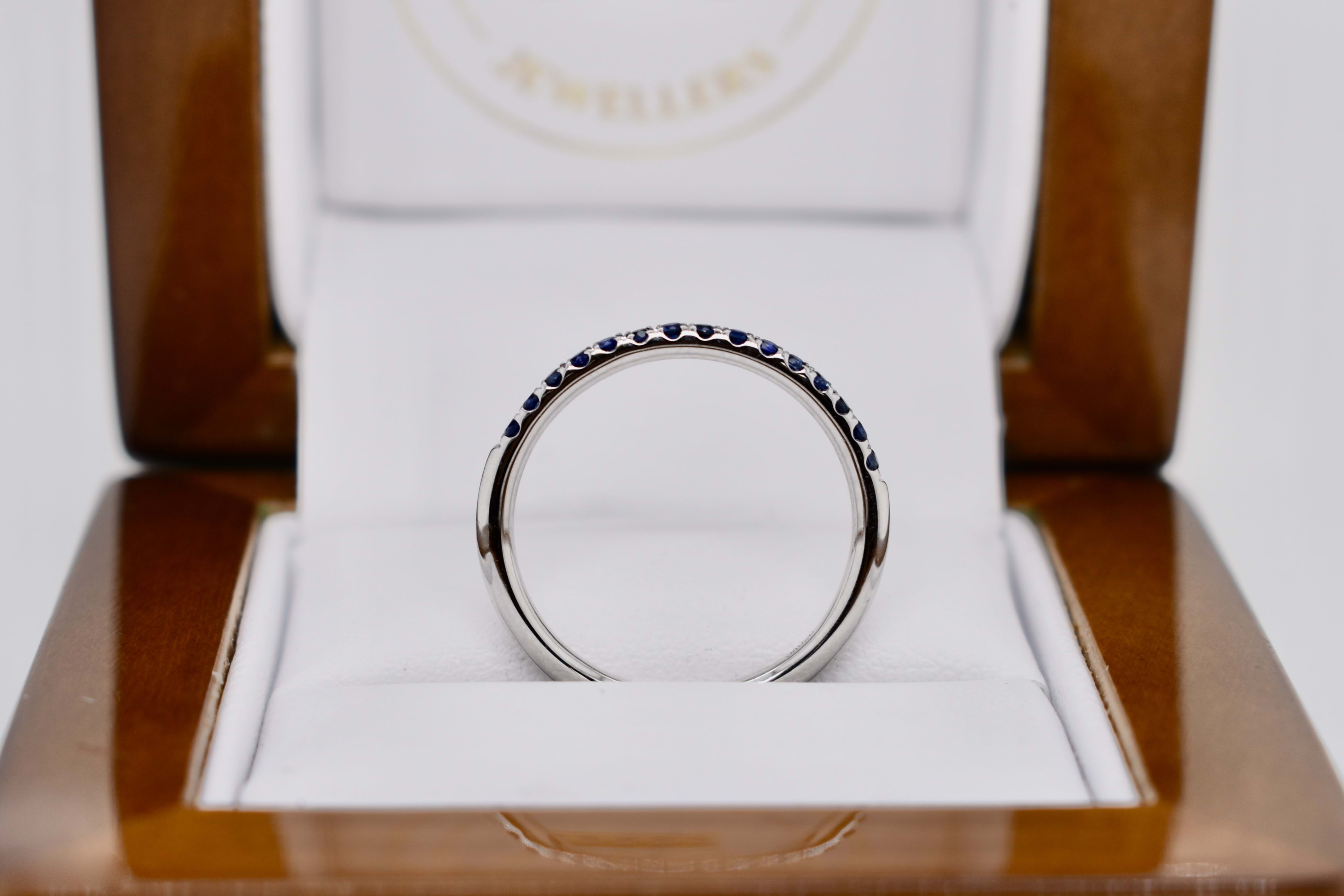 This 18ct white gold band features a total of fifteen brilliant cut blue sapphires, cut down claw set, in a 1.8mm round band. Total blue sapphire content equals 0.25cts. Perfect as a wedding band, eternity band or high quality stacking ring. Finger size M. Independent Valuation Supplied