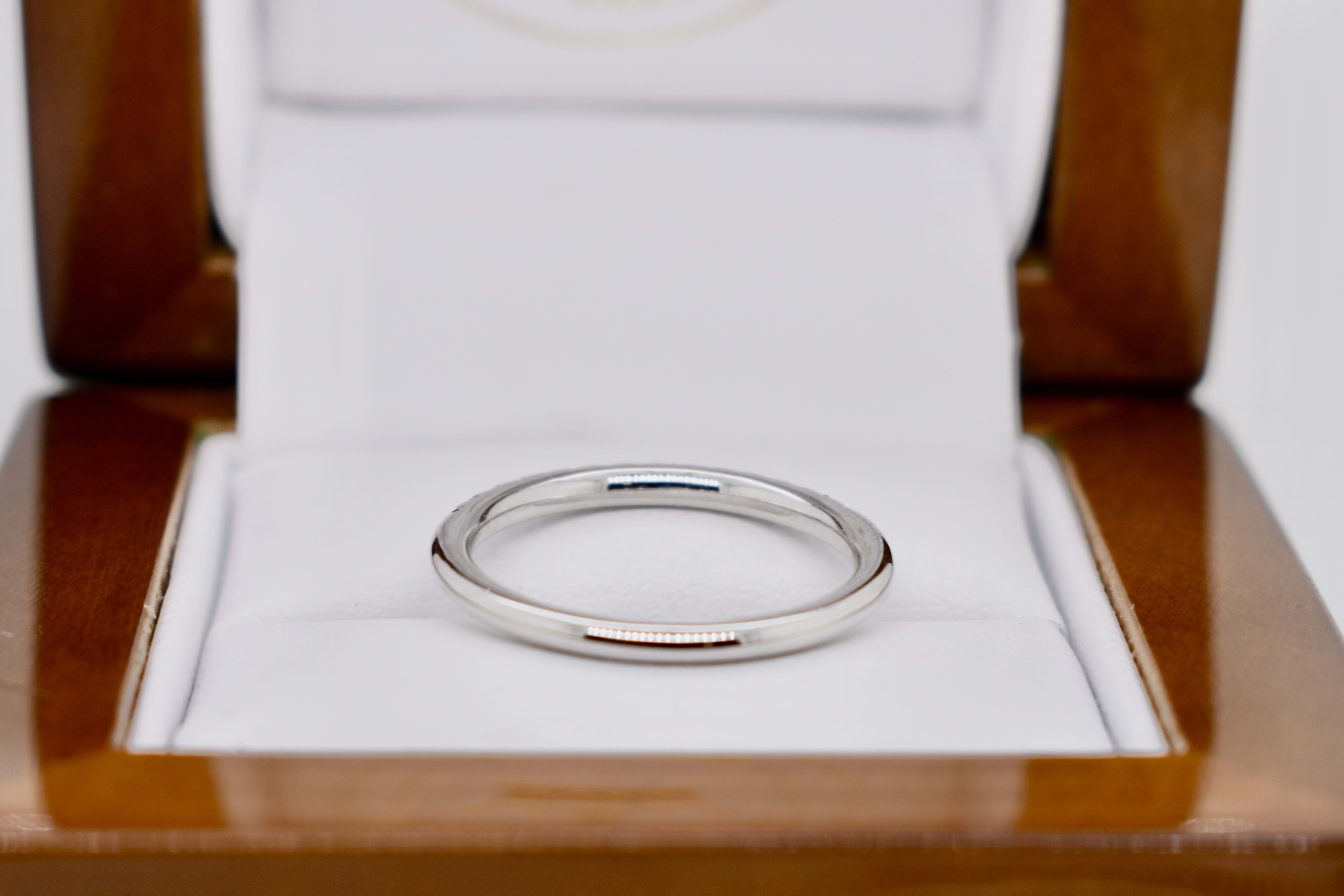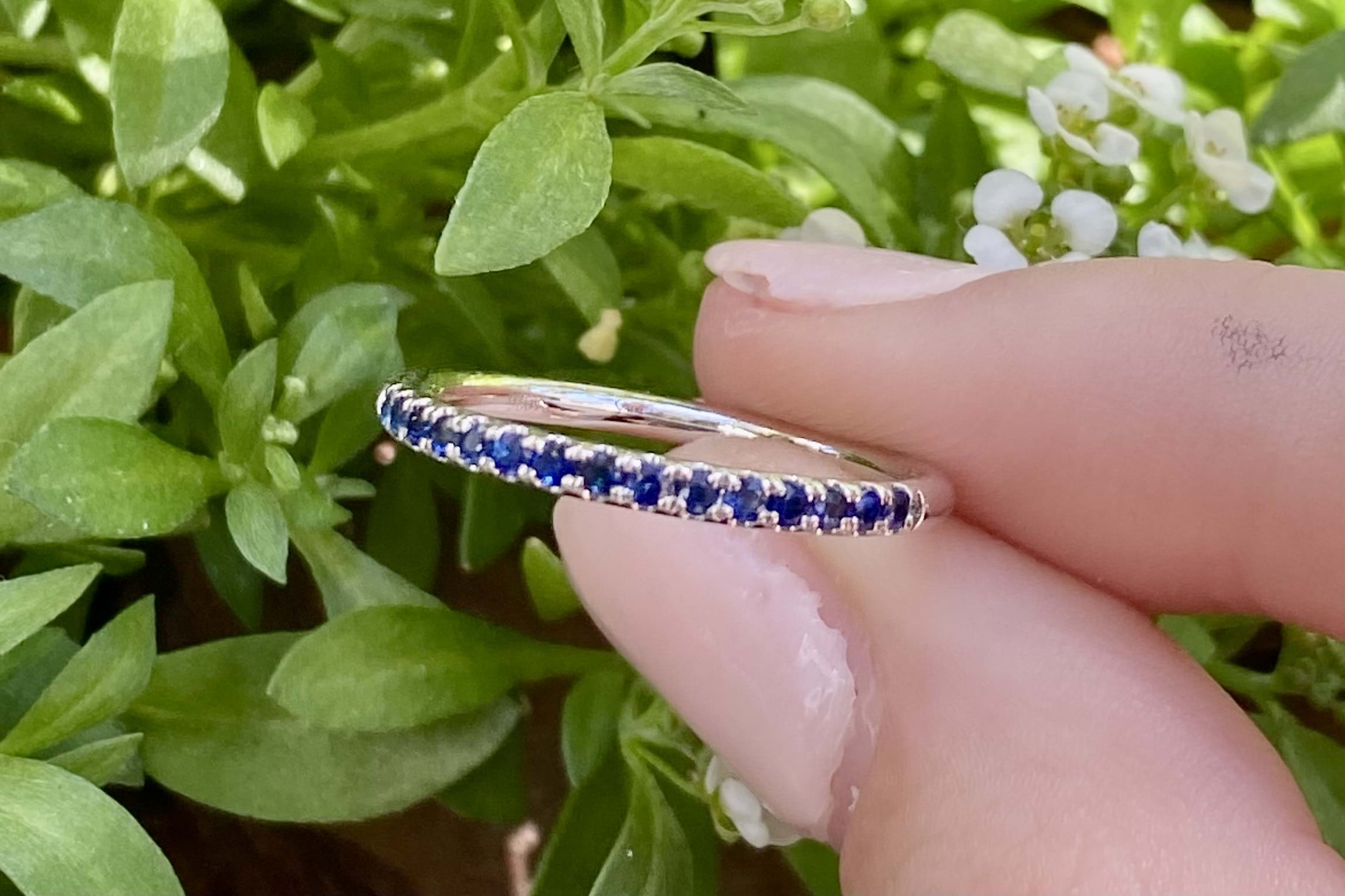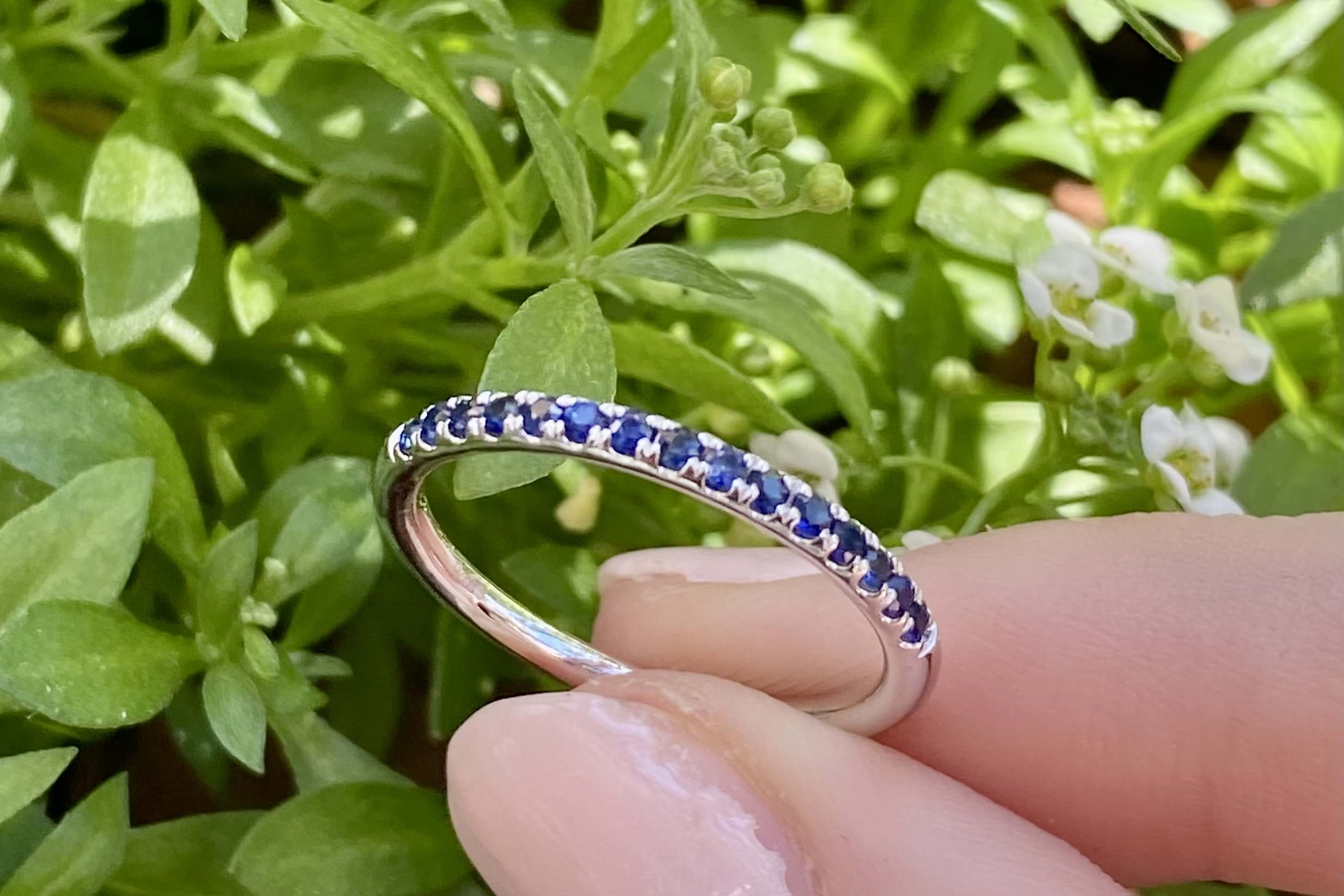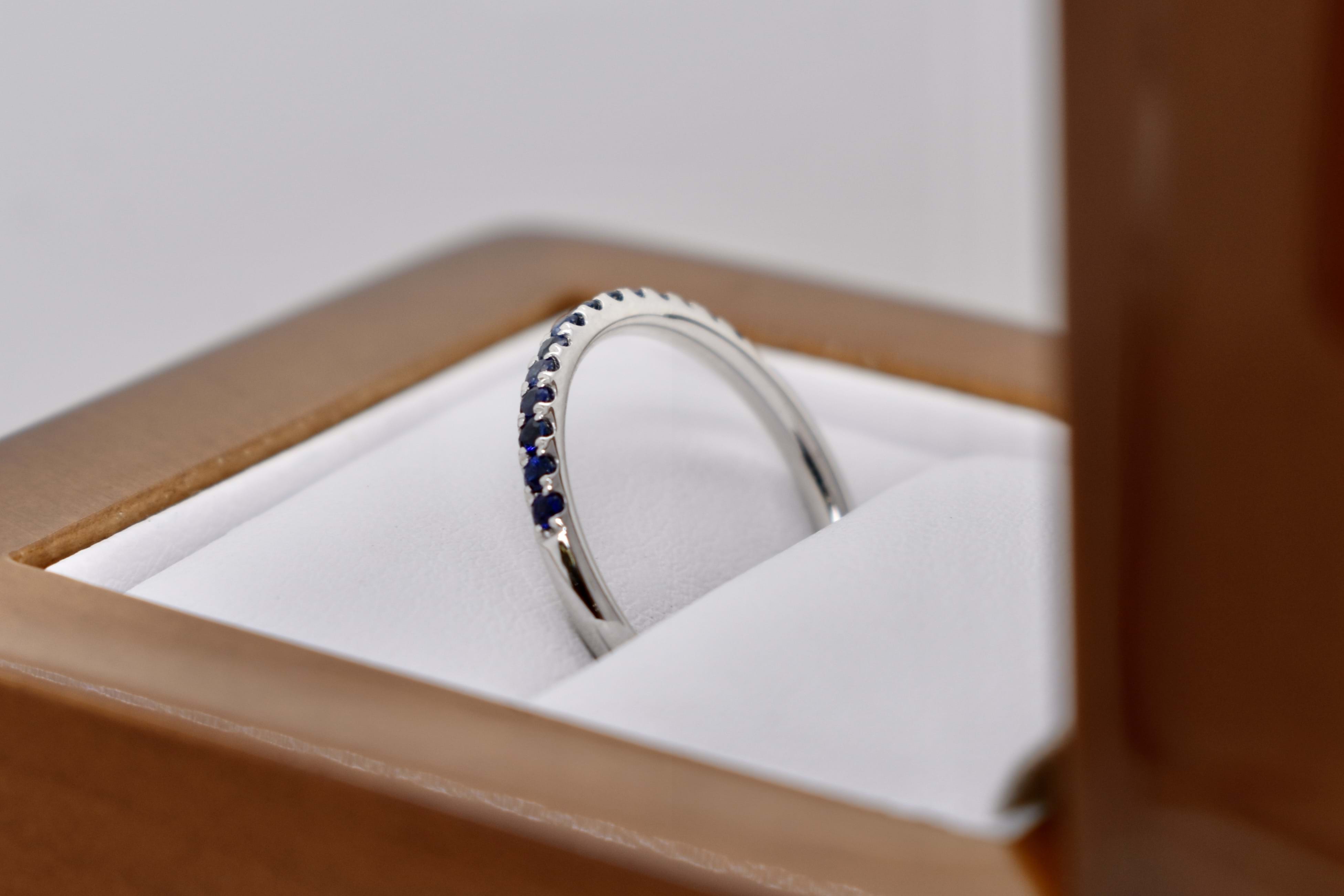 This 18ct white gold band features a total of fifteen brilliant cut blue sapphires, cut down claw set, in a 1.8mm round band. Total blue sapphire content equals 0.25cts. Perfect as a wedding band, eternity band or high quality stacking ring. Finger size M. Independent Valuation Supplied