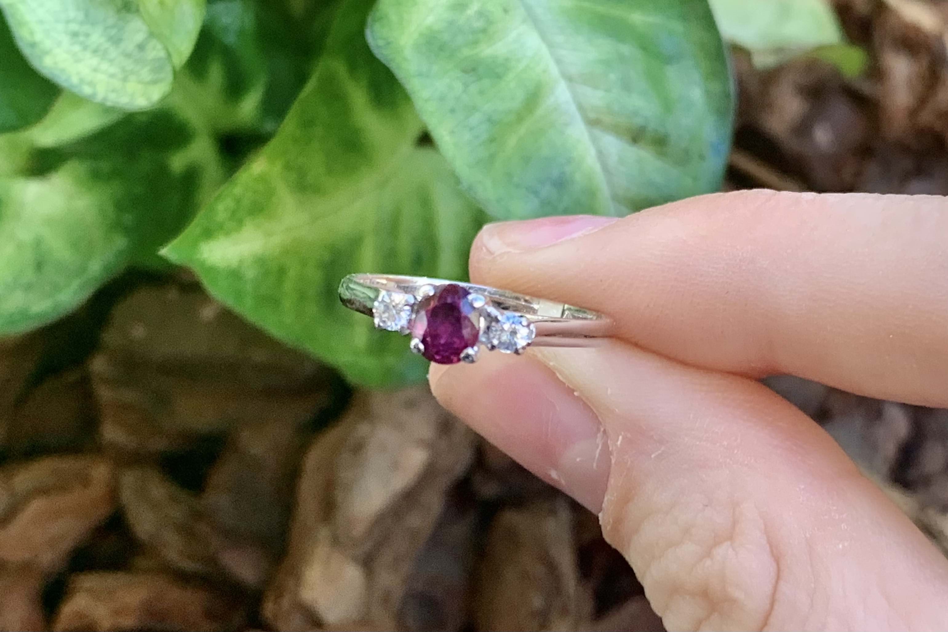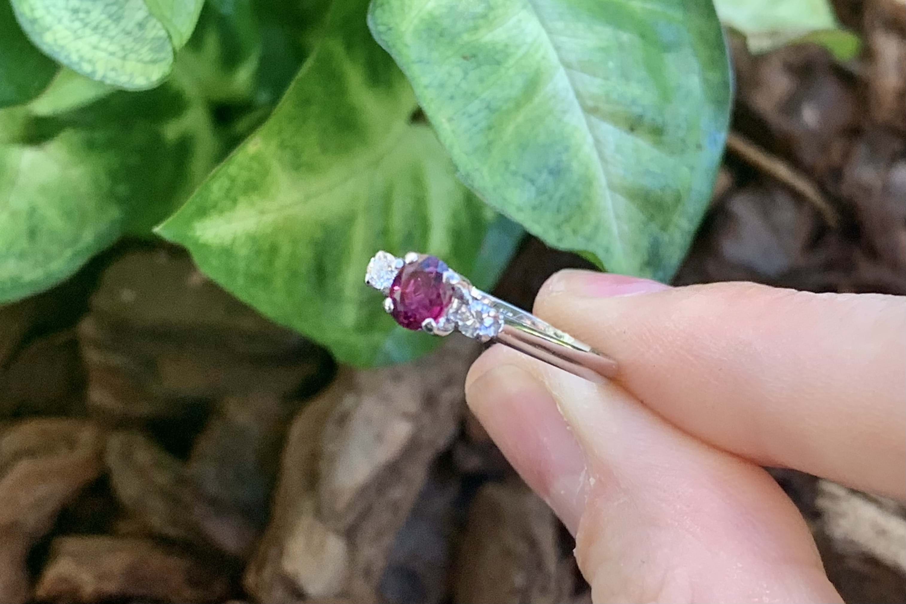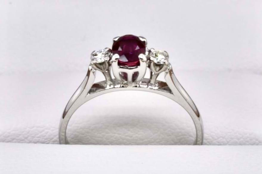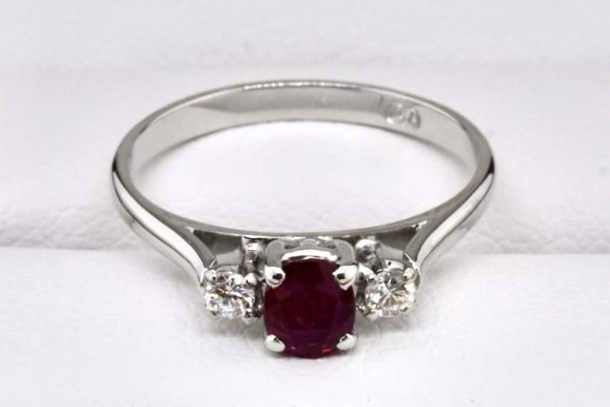 A petite and dainty ring with a tall gallery, crafted in 18ct white gold and set with a centre oval shape 0.30ct ruby in four claws with an RBC diamond to each side for two totalling 0.80ct H/SI. Finger size J+