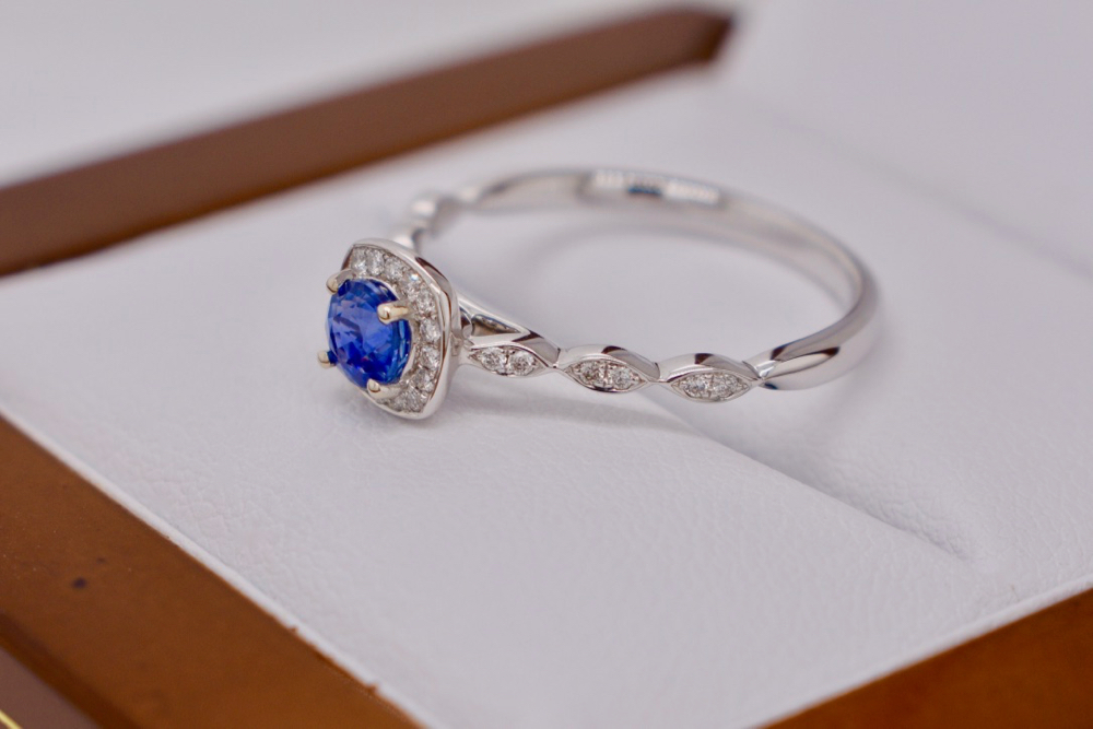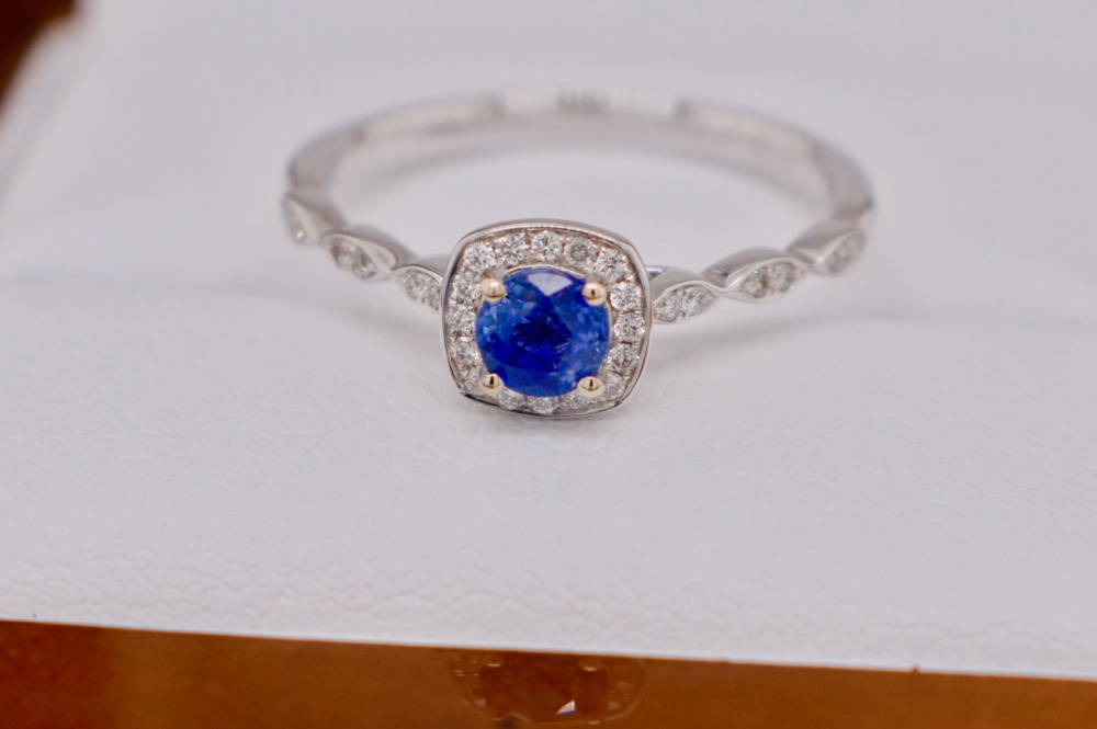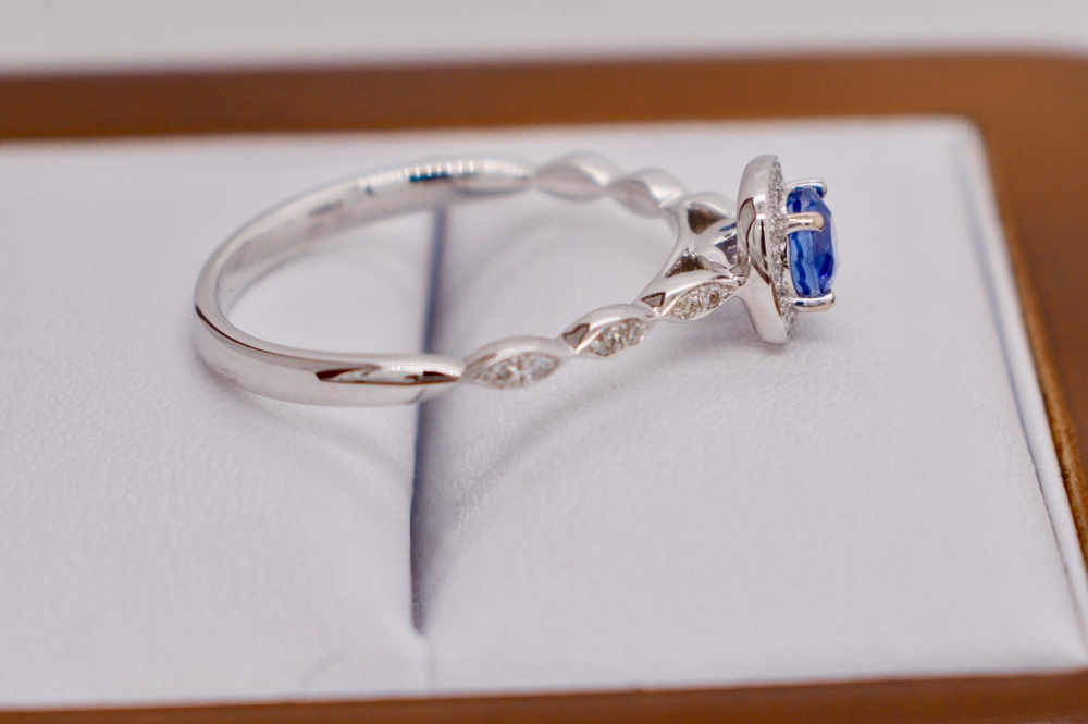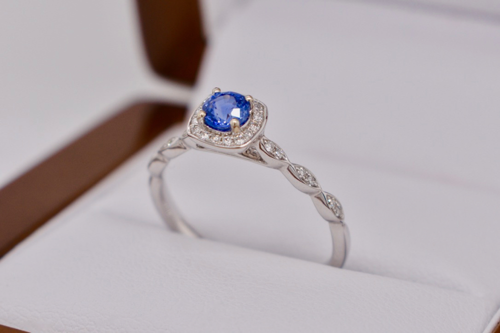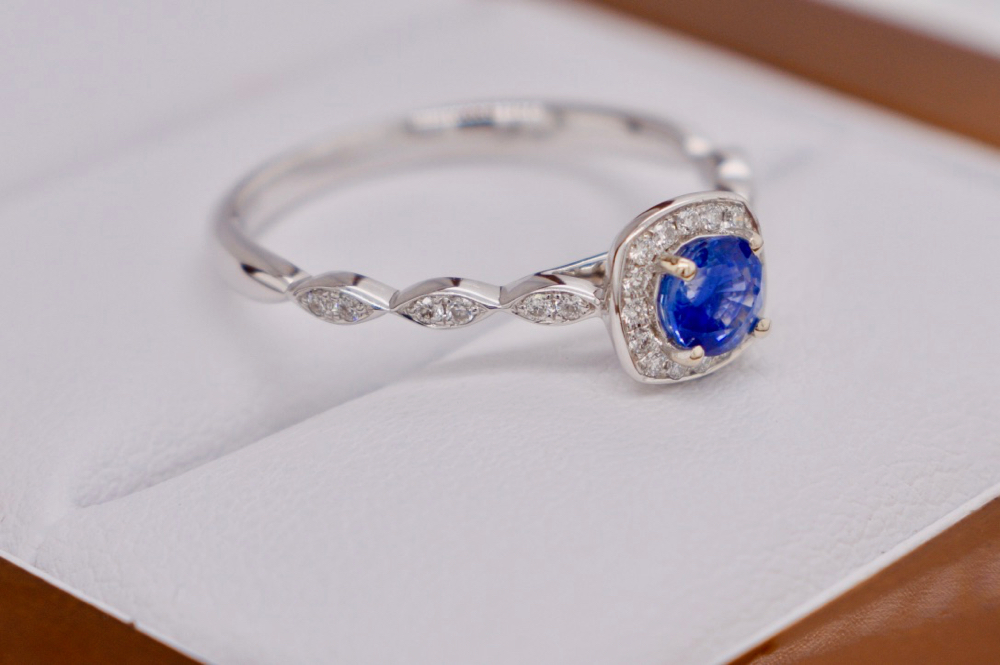 A 0.45ct light blue Ceylon sapphire set in the center of this 18ct white gold antique inspired cushion shape halo with grain set diamonds, a mill grain border and shoulders of grain set round diamonds in marquise shape bezels. Total diamond content equals 0.11ct (GH/SI), this ring is designed to sit perfectly with a wedding band. Finger size M1/2. Independent Valuation Supplied