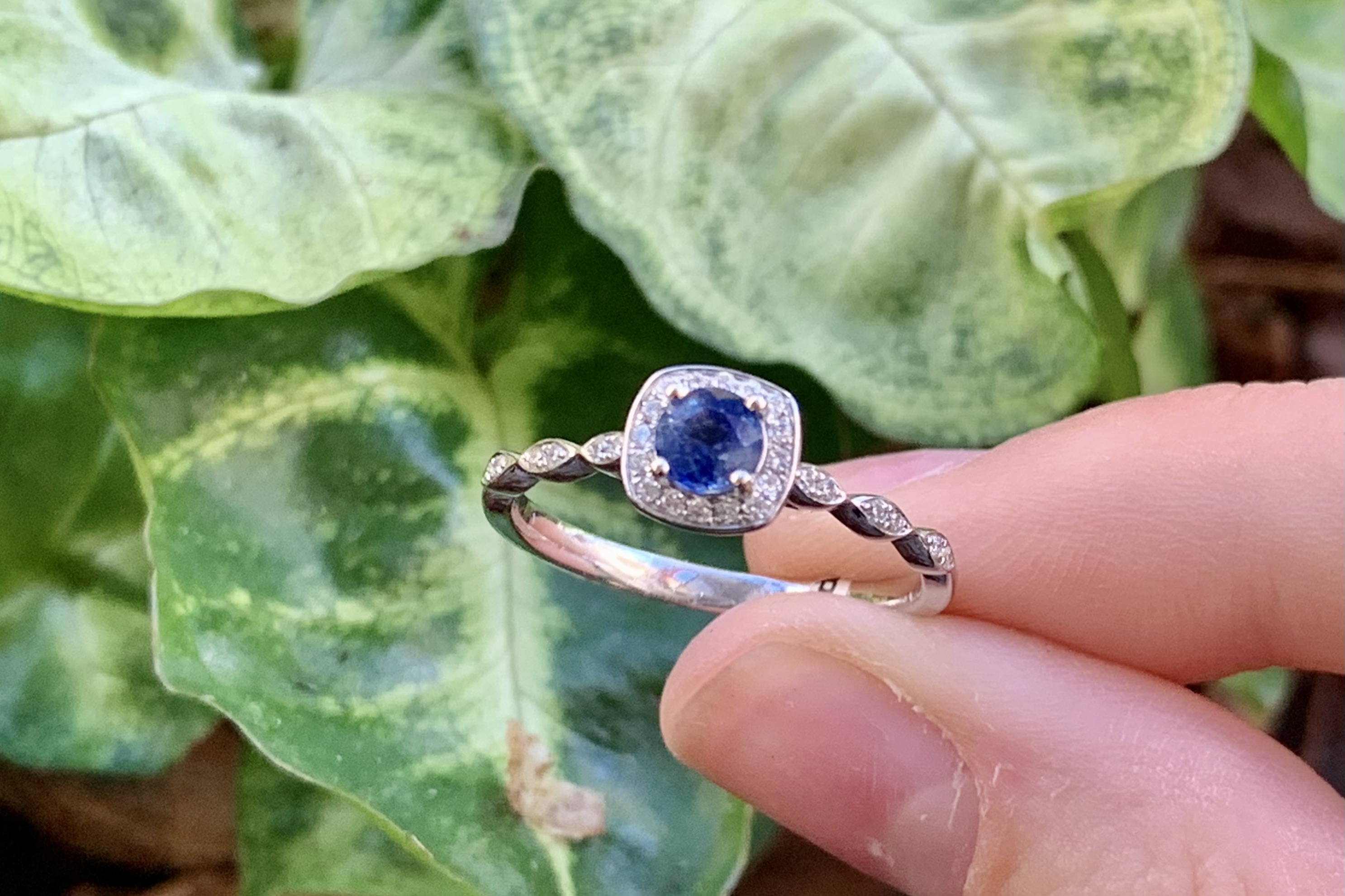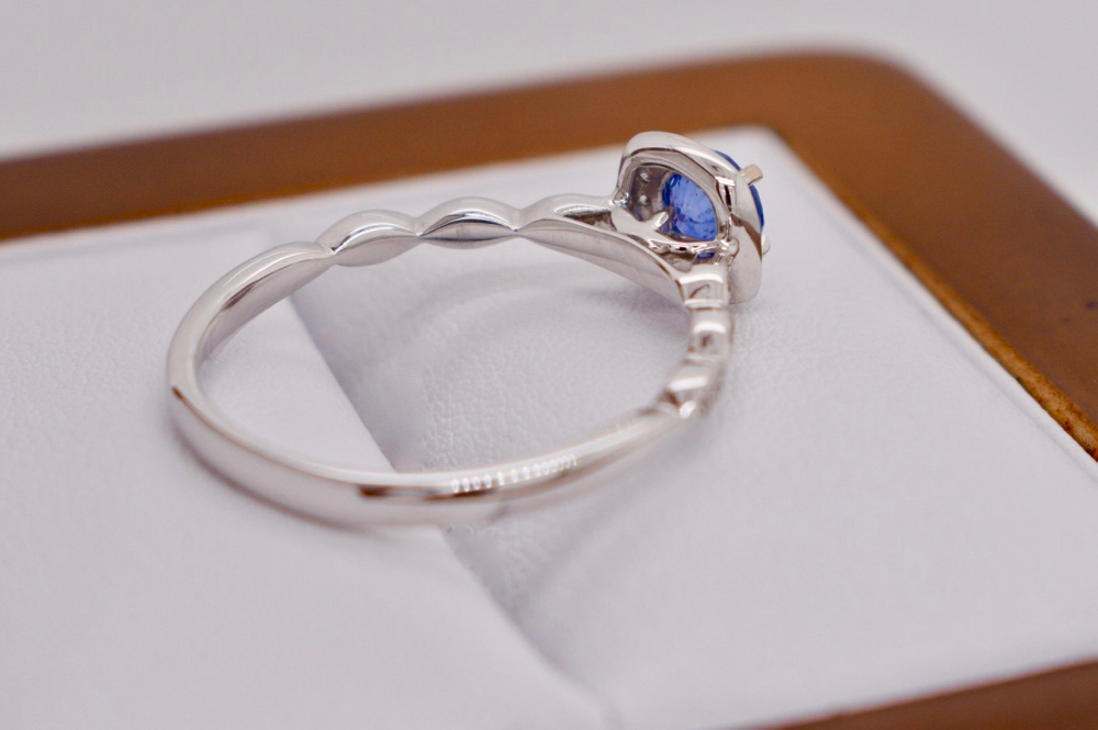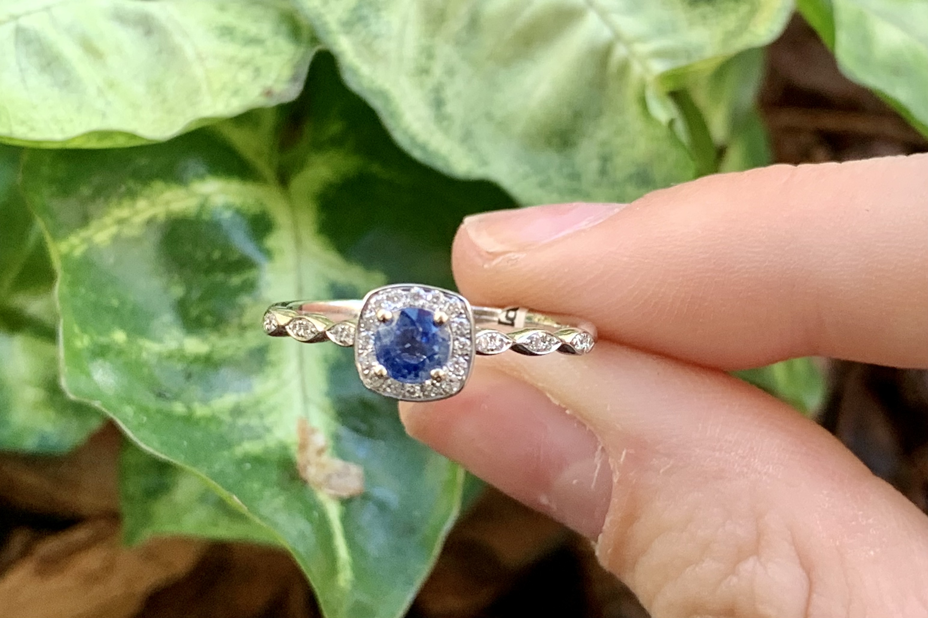 A 0.45ct light blue Ceylon sapphire set in the center of this 18ct white gold antique inspired cushion shape halo with grain set diamonds, a mill grain border and shoulders of grain set round diamonds in marquise shape bezels. Total diamond content equals 0.11ct (GH/SI), this ring is designed to sit perfectly with a wedding band. Finger size M1/2. Independent Valuation Supplied