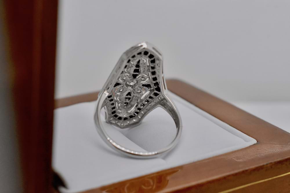 SOLD 18ct White Gold Onyx & Diamond Deco Style Ring