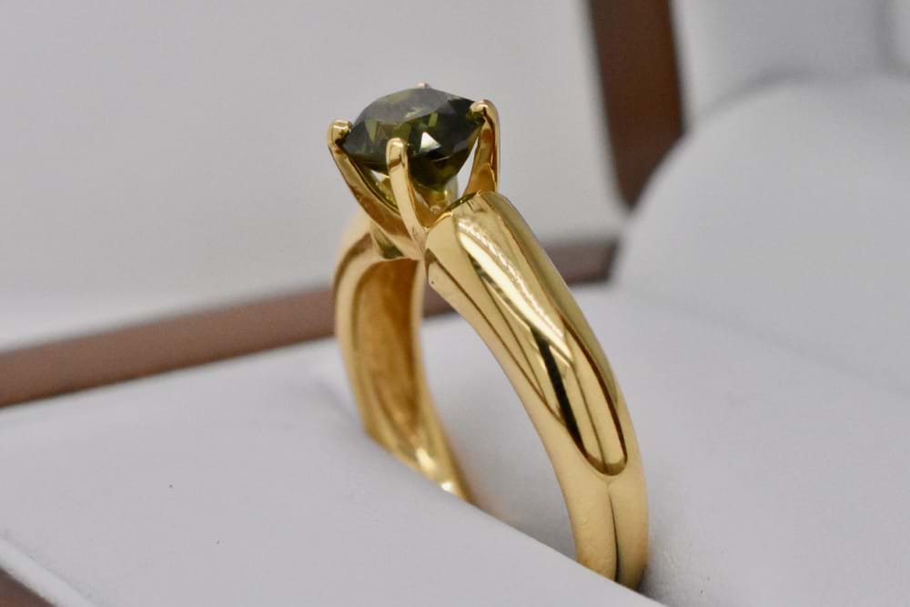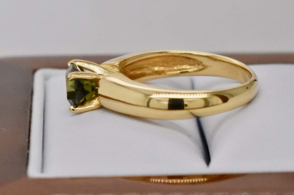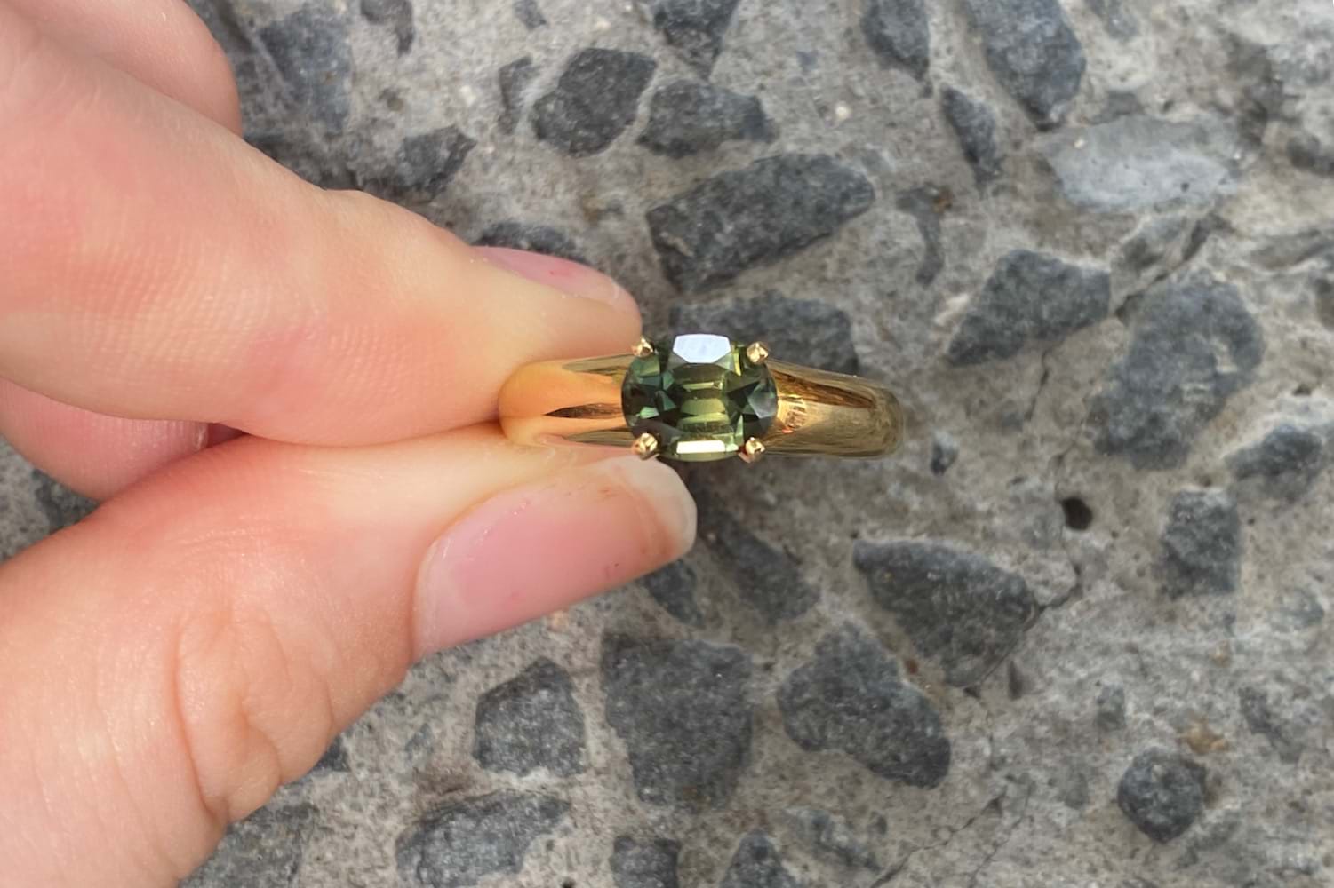 A gorgeous greenish yellow Australian sapphire of 1.45cts set into a classic, old school, 18ct yellow gold ring. Made with a gorgeous wide band, the yellow gold perfectly enhances the colour tone of the sapphire. Independent Valuation Supplied. Finger size N