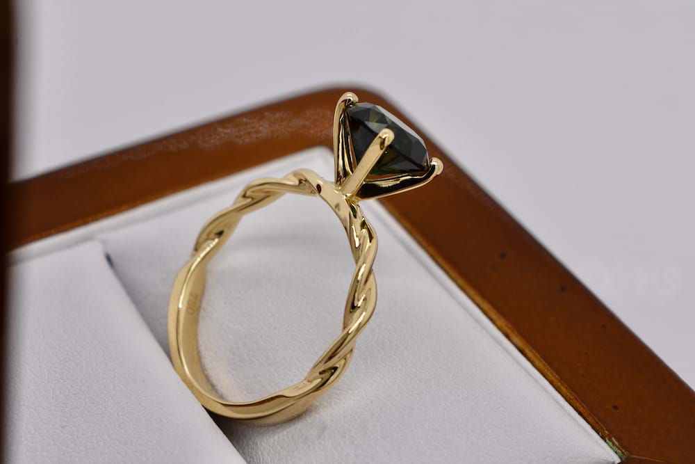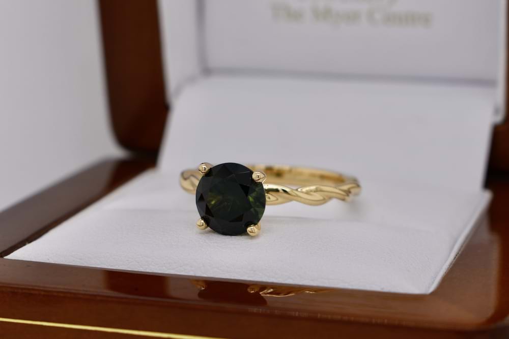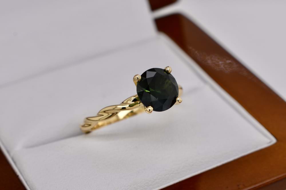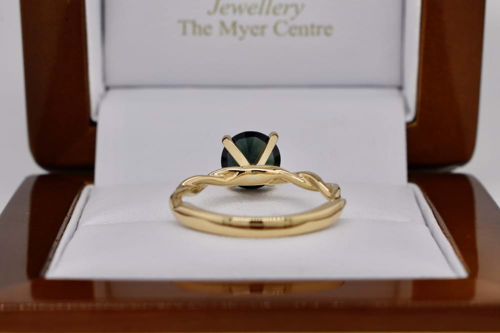 This elegant 18ct yellow gold ring features a stunning 2.16ct dark greenish blue Australian sapphire, suspended in 4 claws which looks like it's floating above the graceful twisted band. The band is only twisted at the top, reverting to a plain straight band along the bottom. Finger size M. Independent valuation supplied