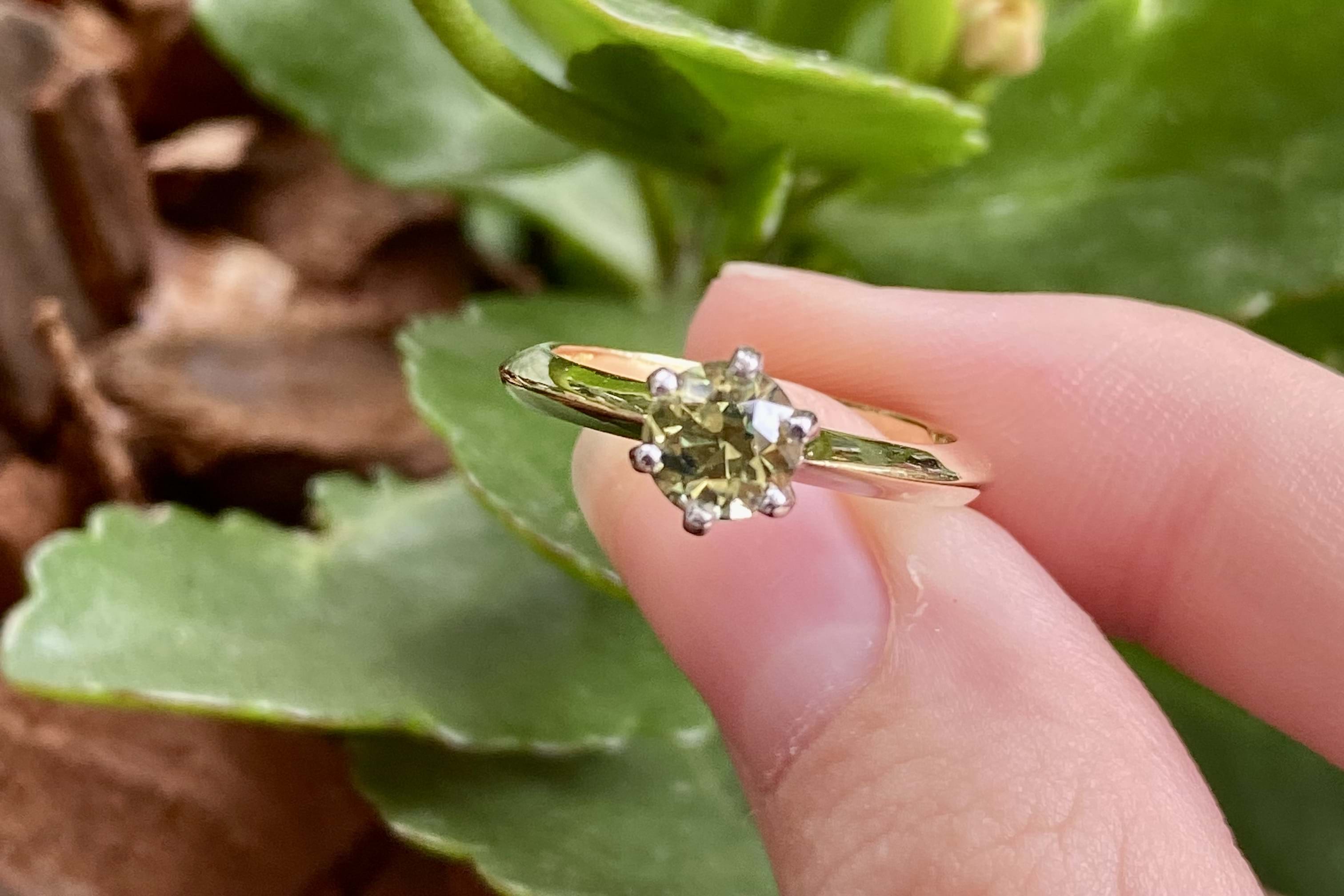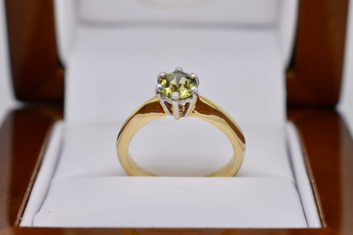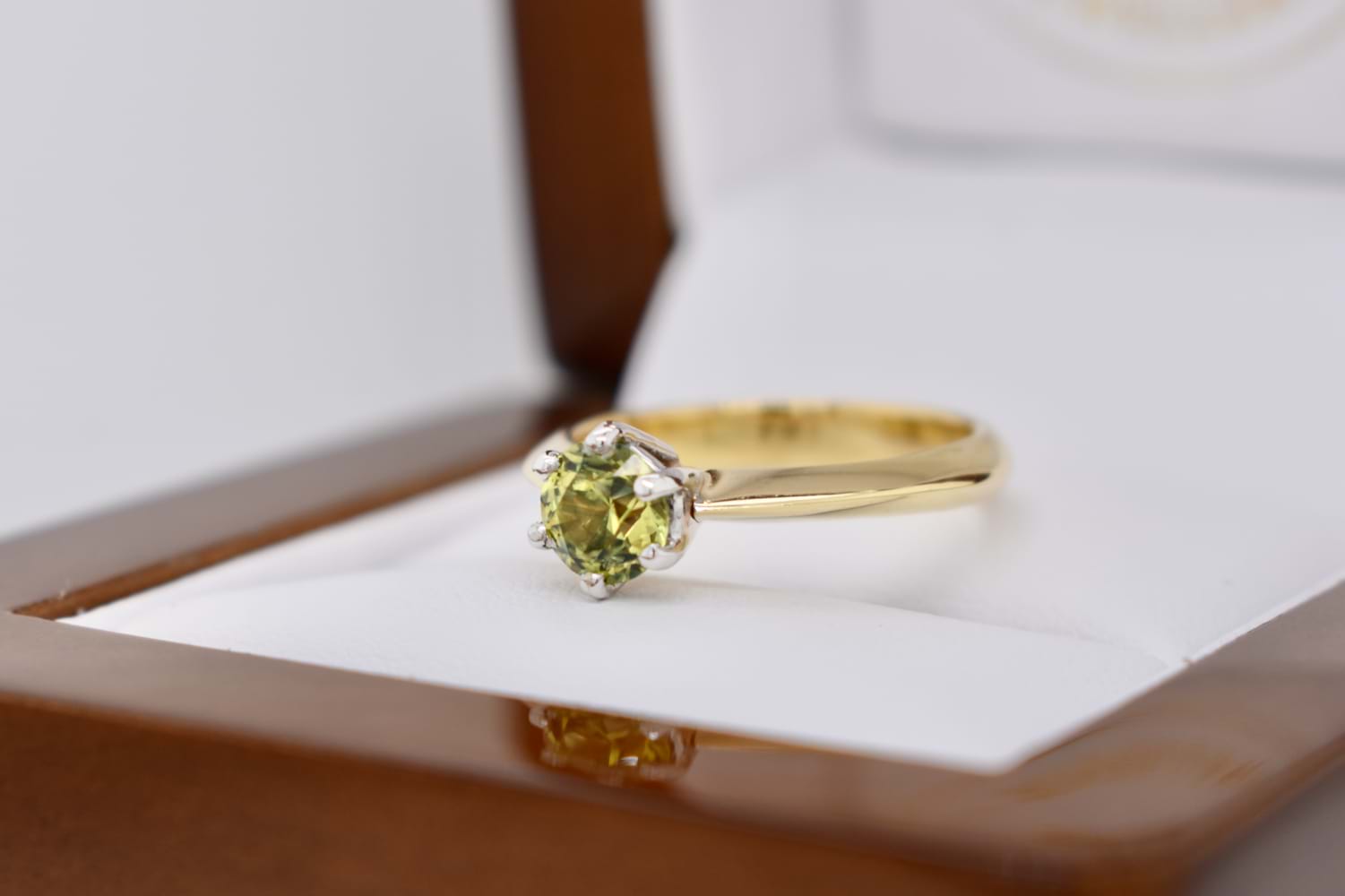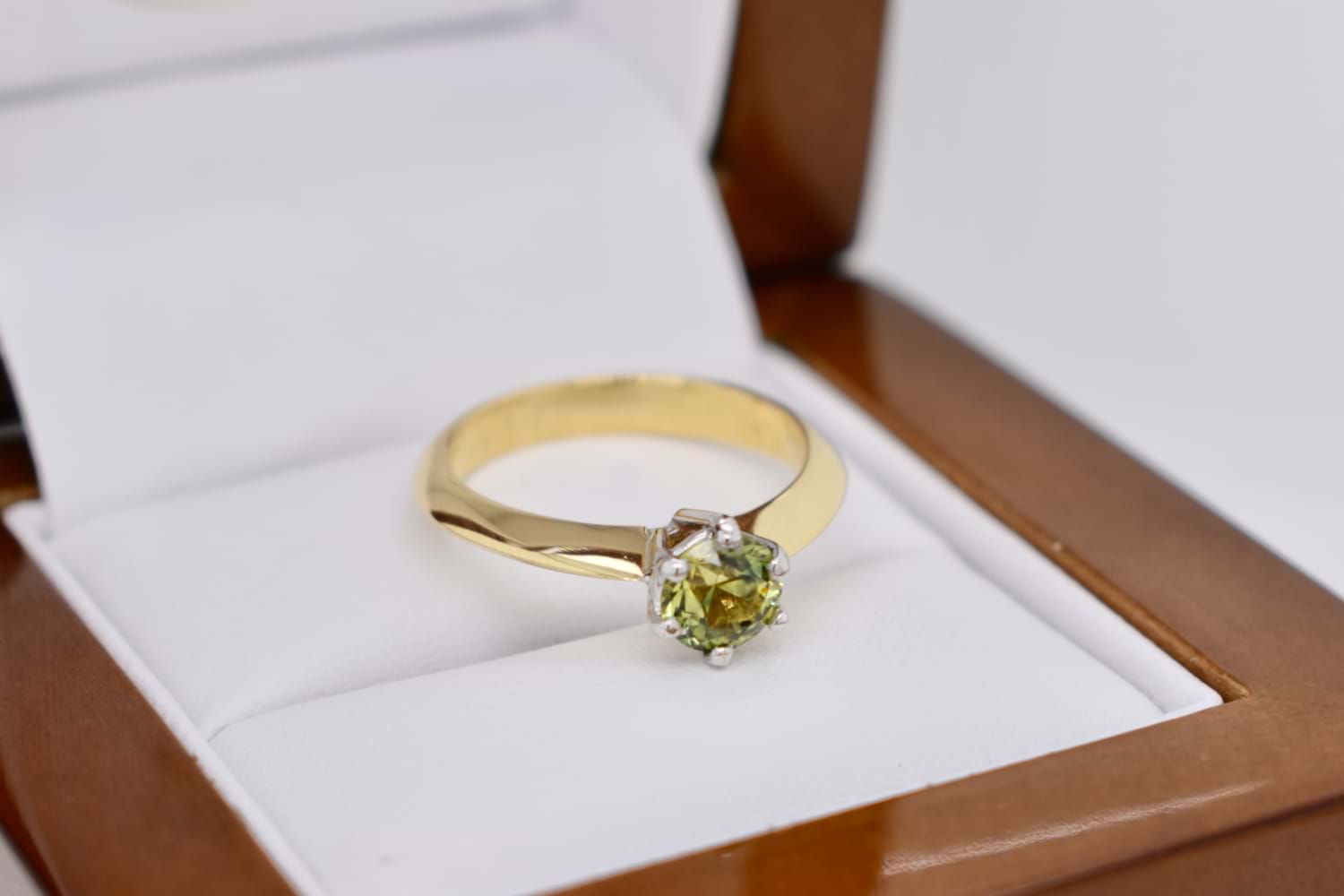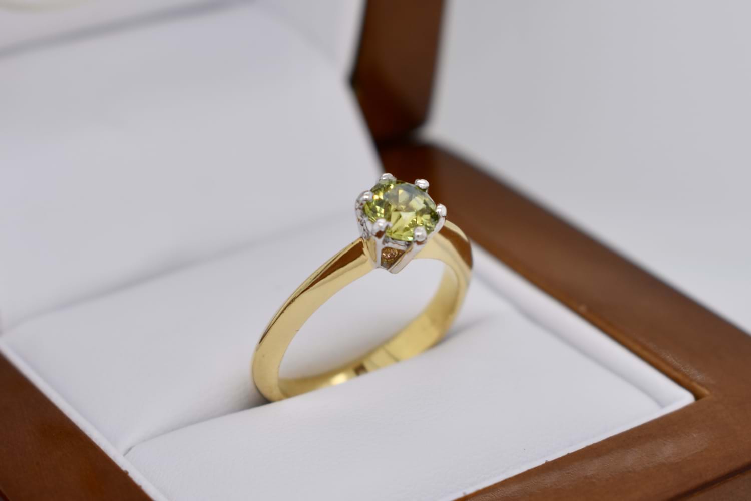 A beautiful, round Australian yellow blue parti sapphire of 0.65ct is the feature of this ring, set in 18ct yellow gold with six white gold accent claws in a raised setting, on a tapered knife edge band. Finger size L