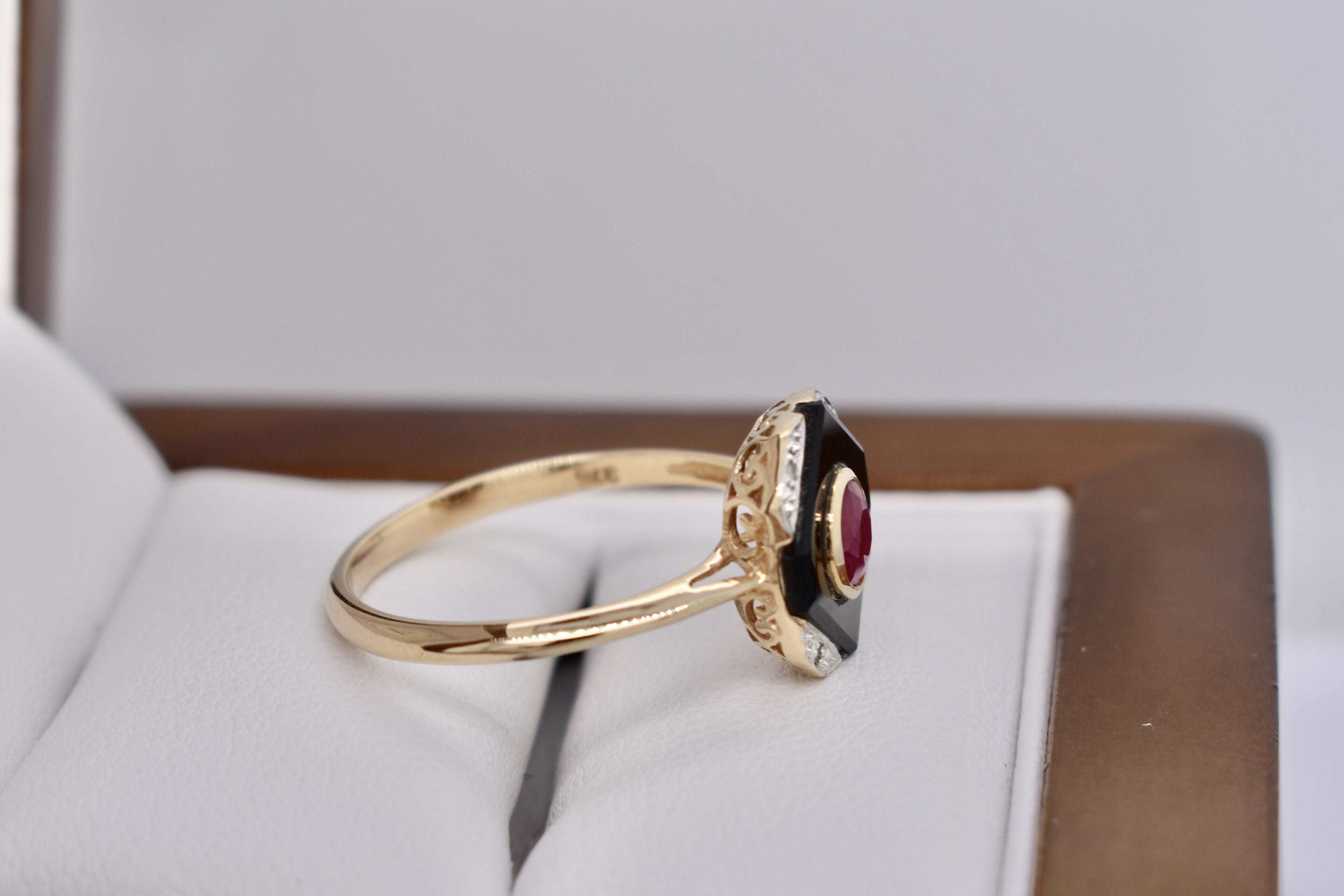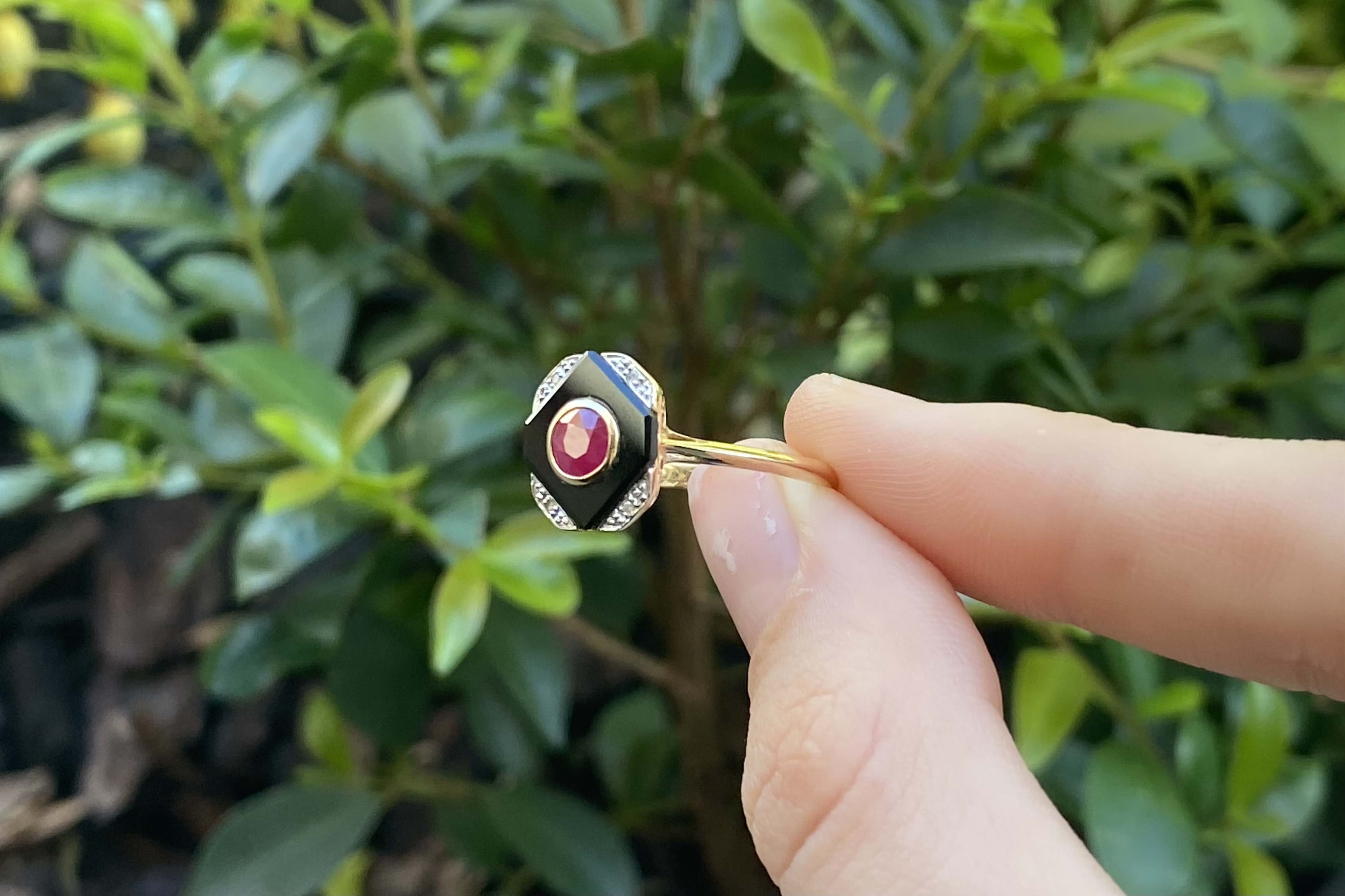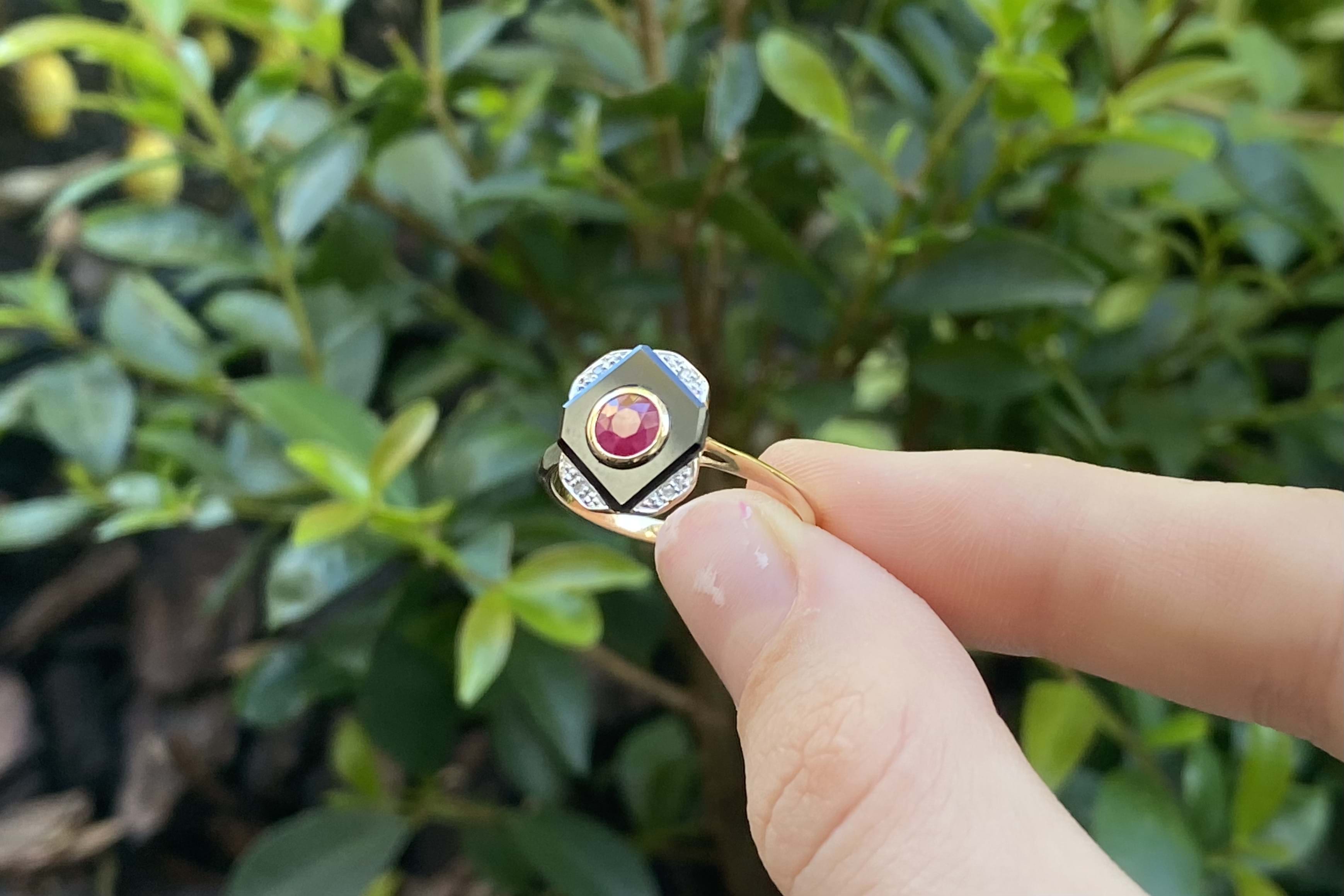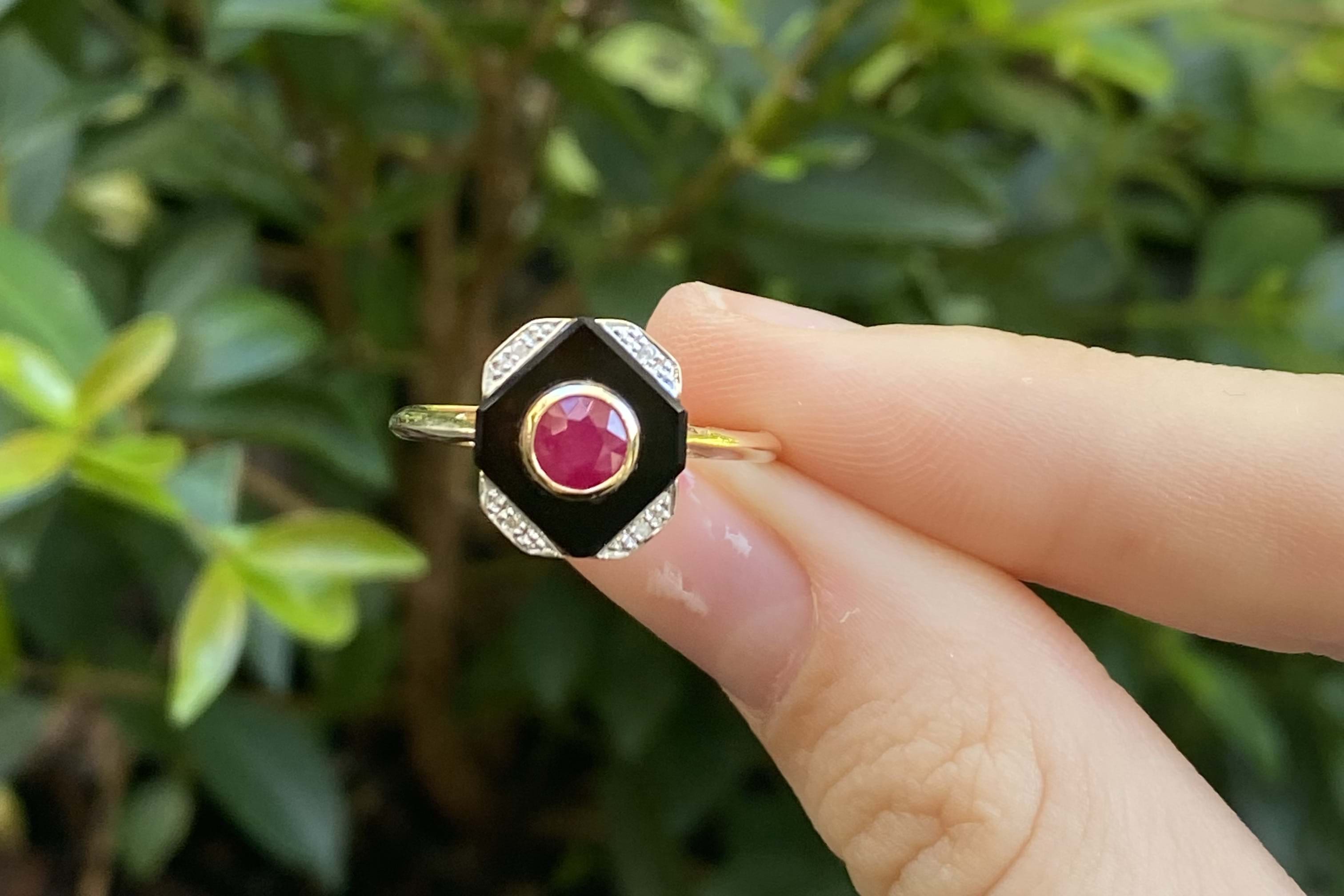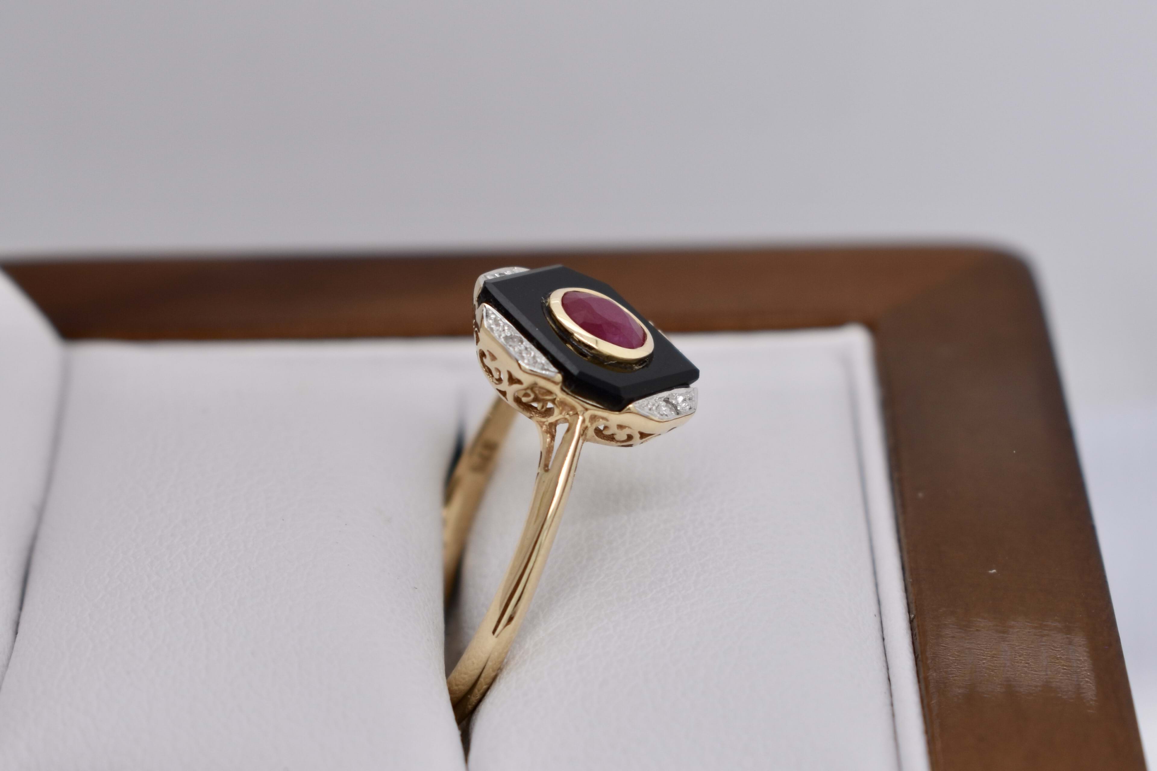 Deco inspired ring crafted in 9ct yellow gold ring featuring a round 0.45ct ruby bezel set into a plate of black rectangular, corner cut, onyx with diamond encrusted corners and a plain band. Diamond content totals 0.02ct HP2, finger size N+ Independent Valuation Supplied