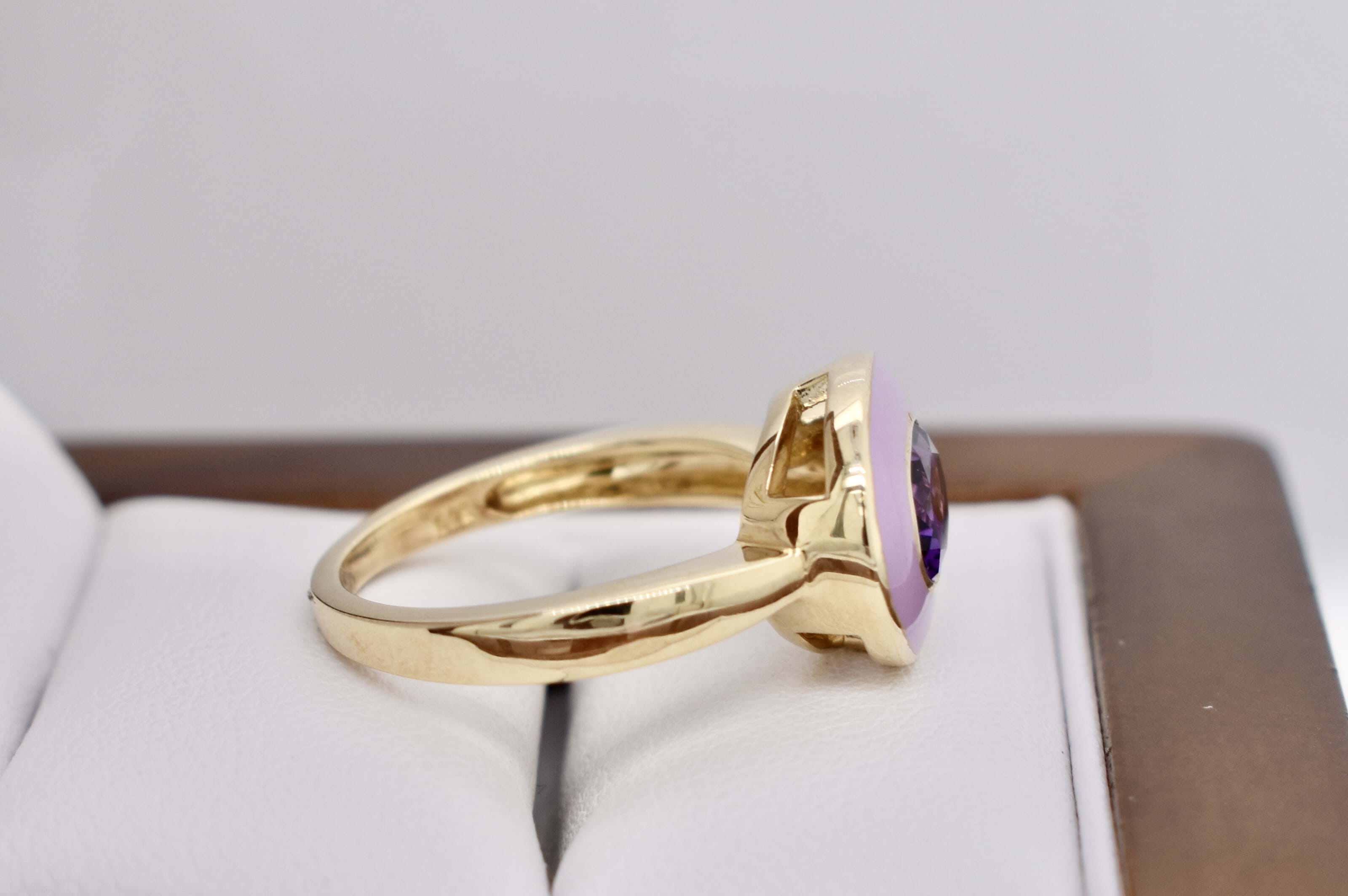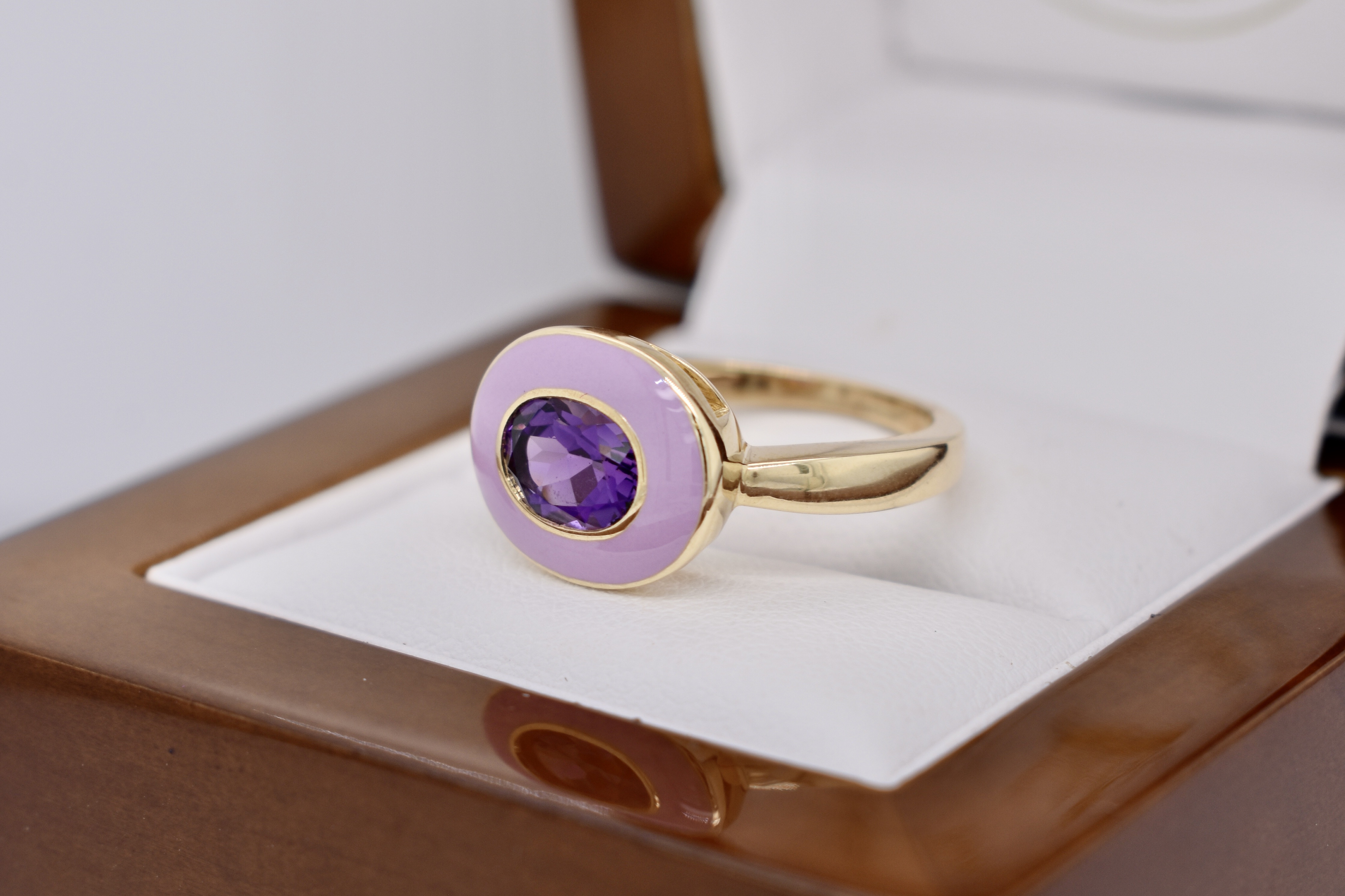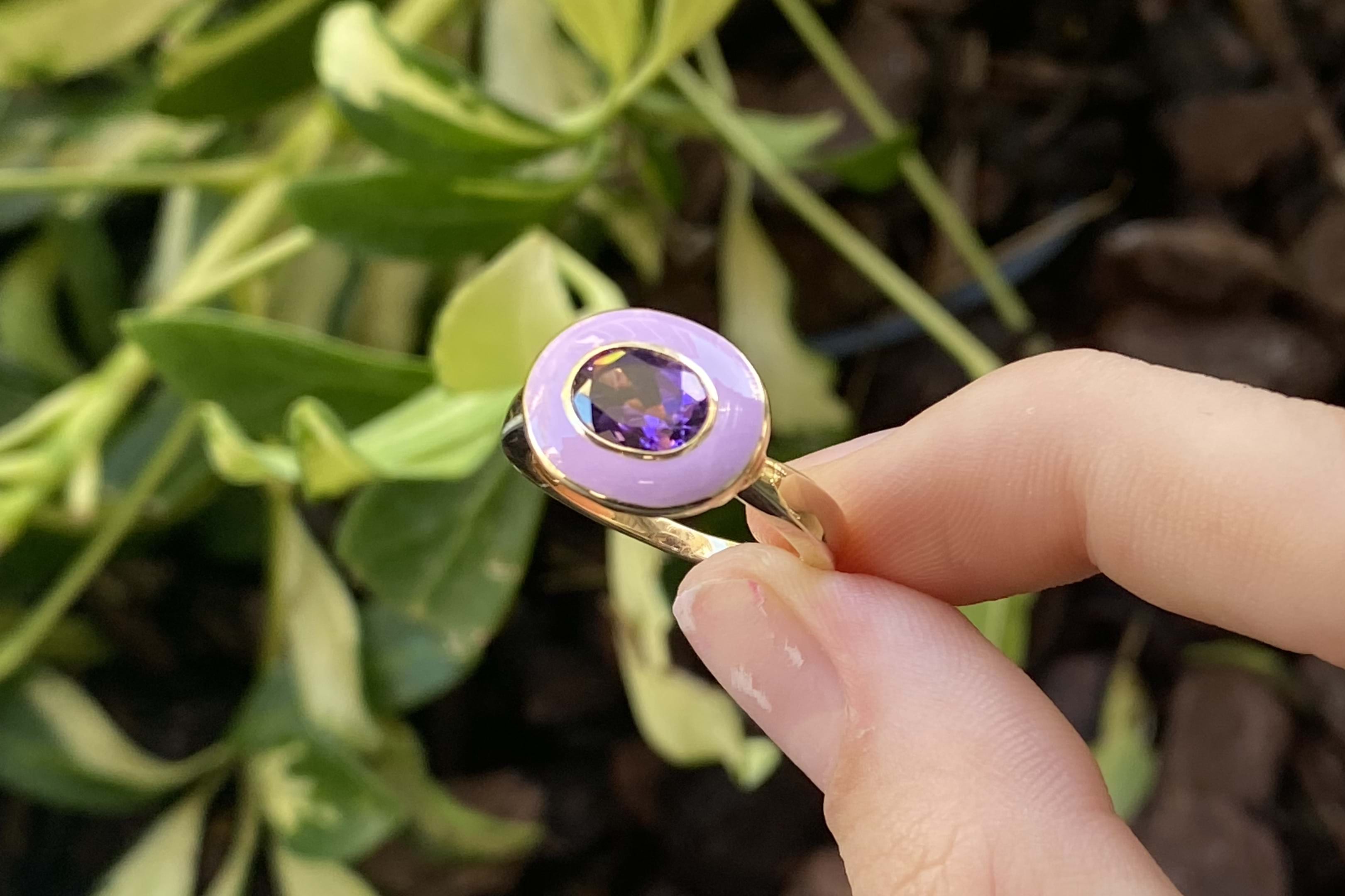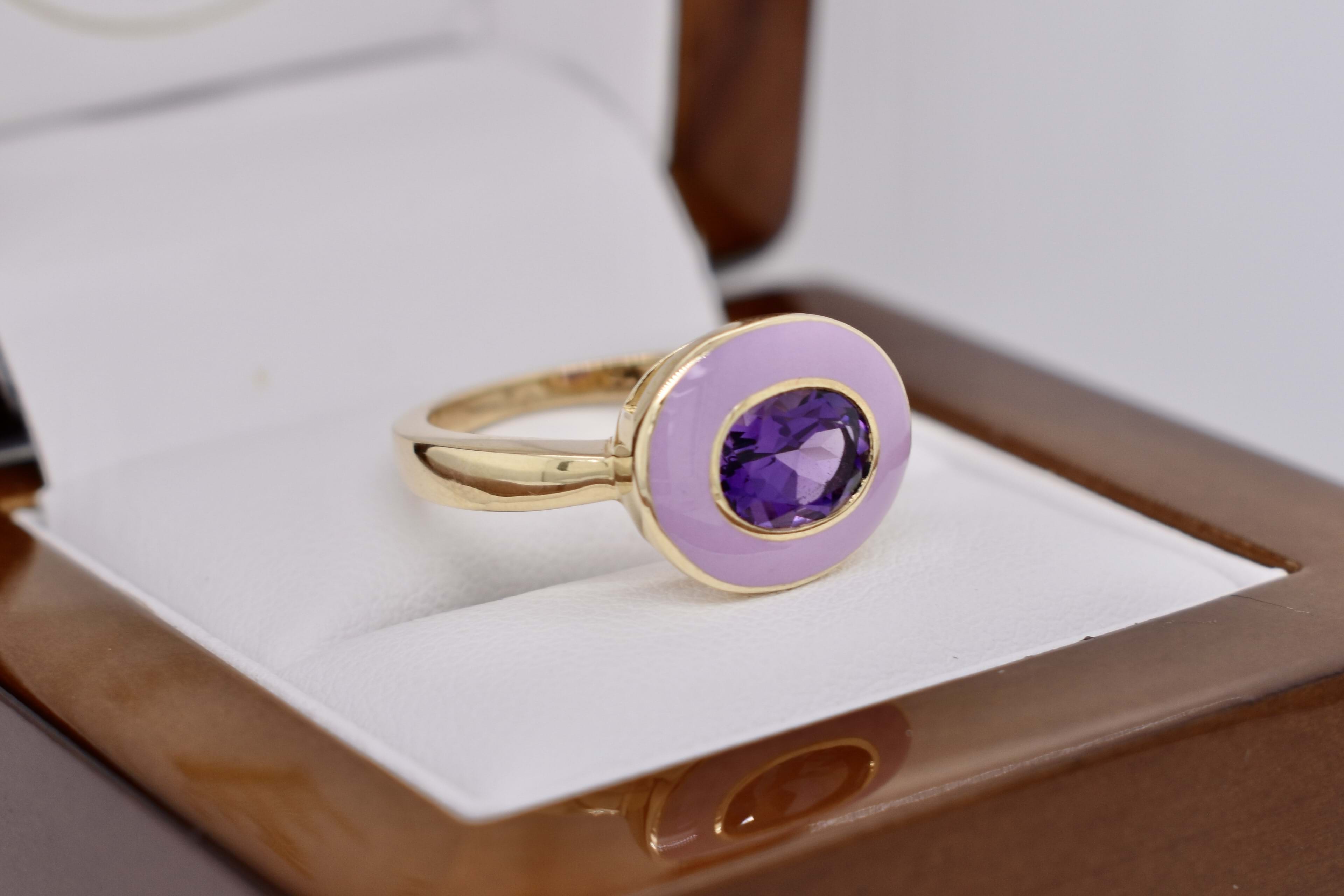 Lovely dress ring crafted in 9ct yellow gold featuring an east/west oval bezel set amethyst measuring 8x6mm and equalling 1.10ct surrounded by a lustrous pastel purple enamel halo, with a plain 1.85mm band. Finger size N. Independent Valuation Supplied