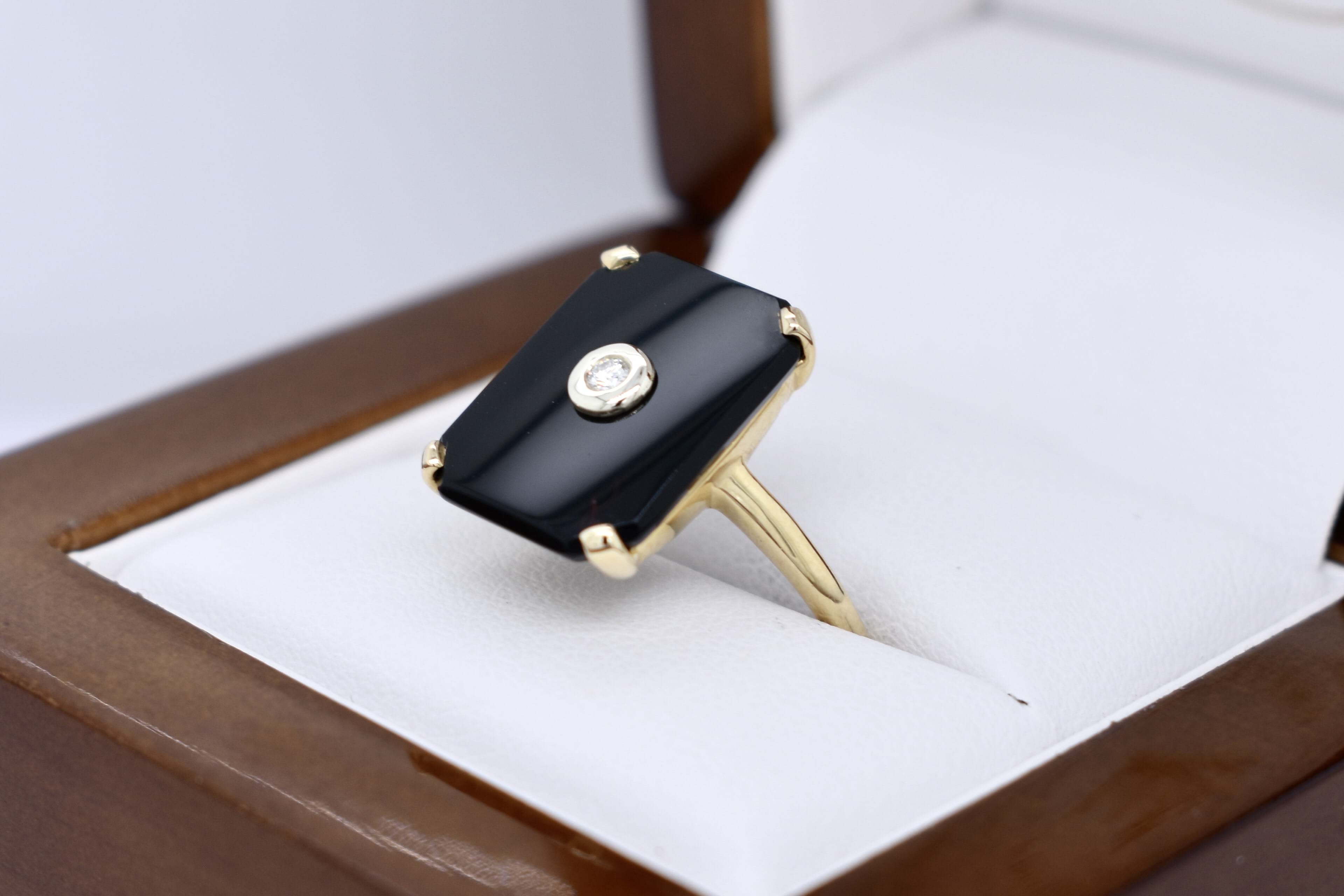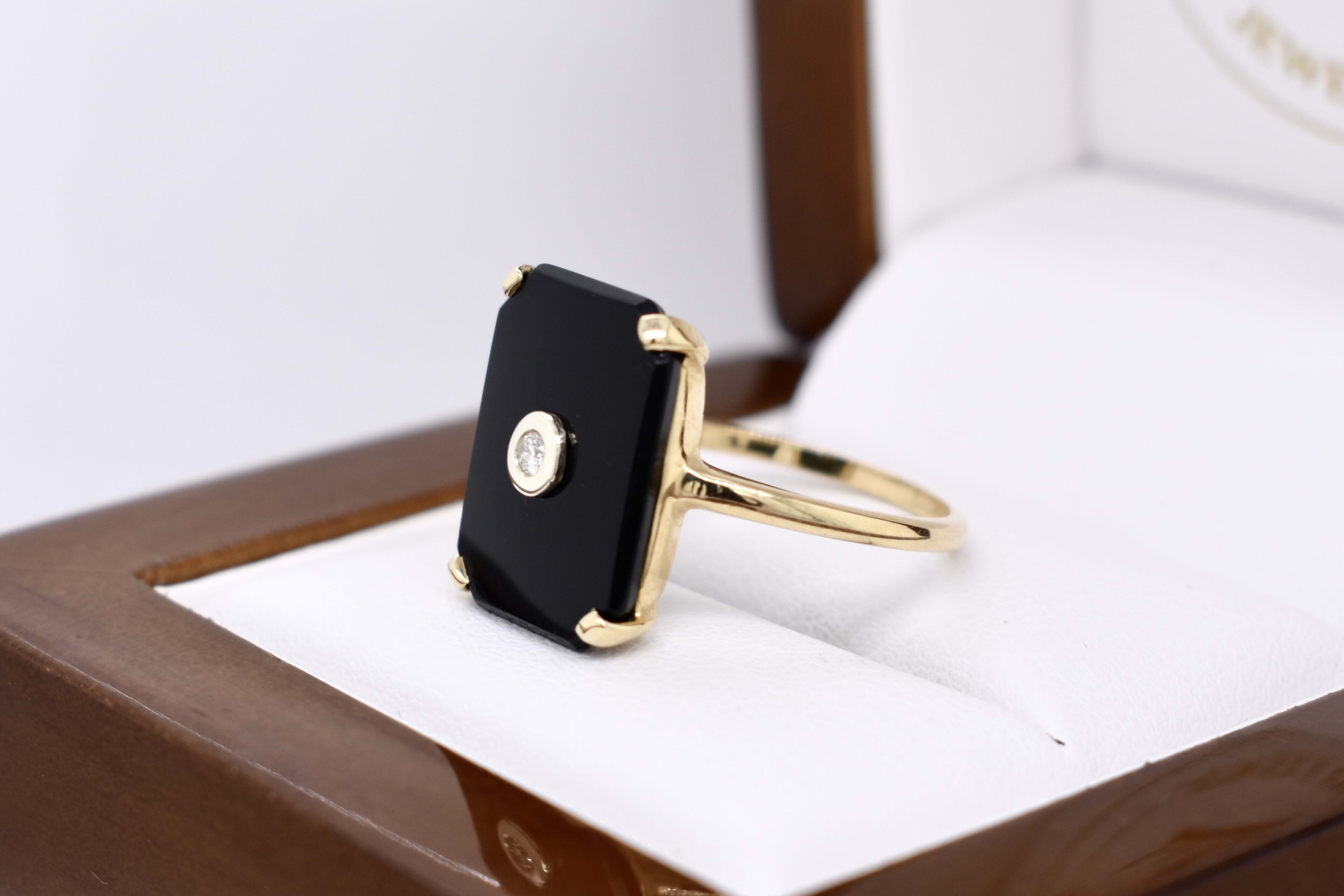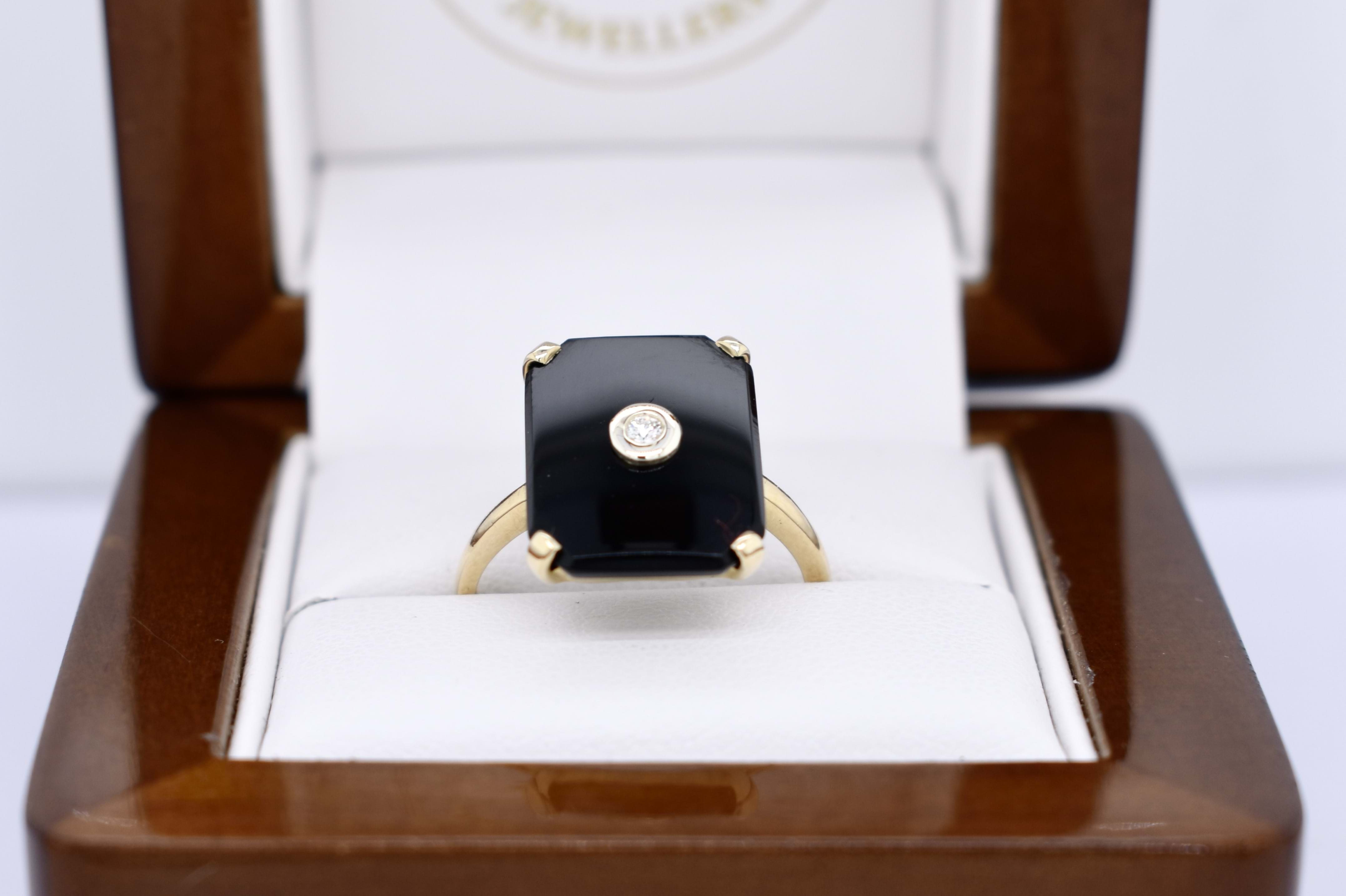 Simple and classic. 9ct yellow gold ring featuring an emerald cut panel of black onyx four claw set with a sparkling round diamond white gold bezel set in the centre and a plain gold band. Finger size O+. Complete the matching set with the enhancer: 20376505 and earrings: 20376512. (Photographed in natural light together)
